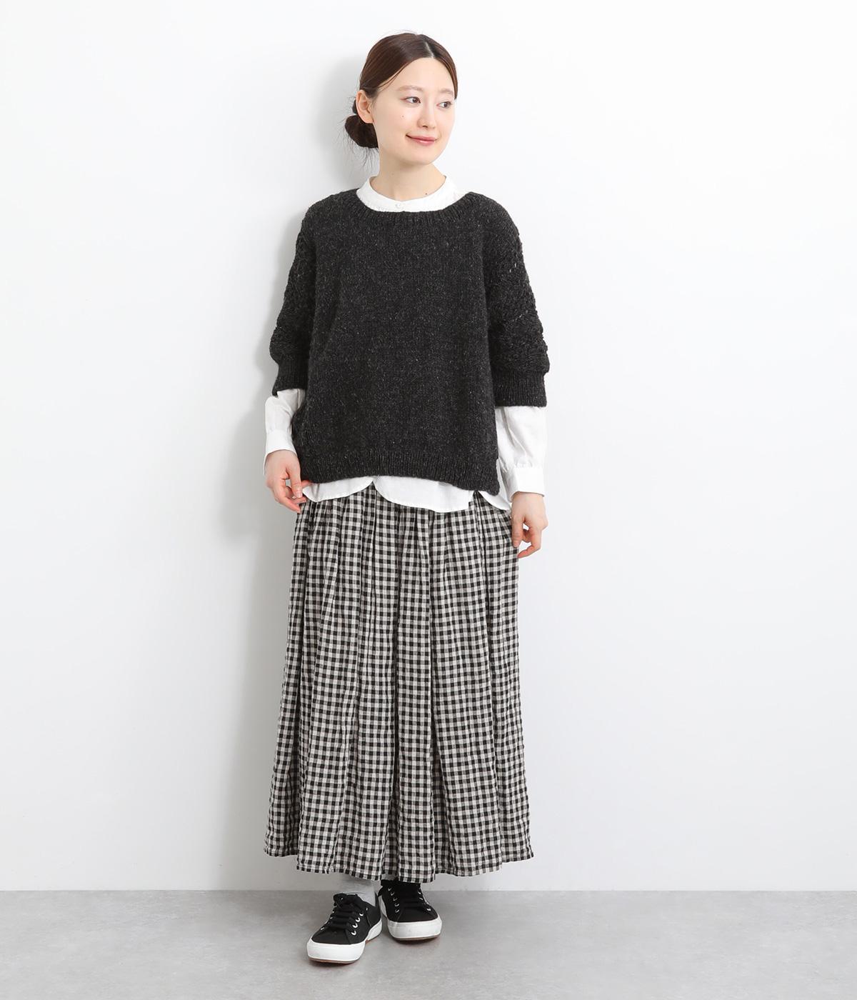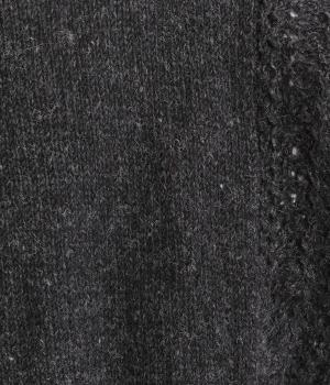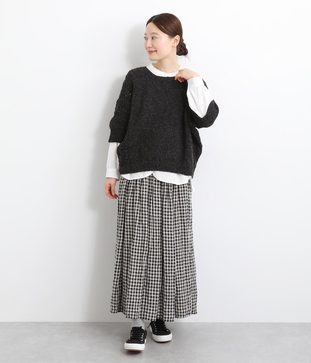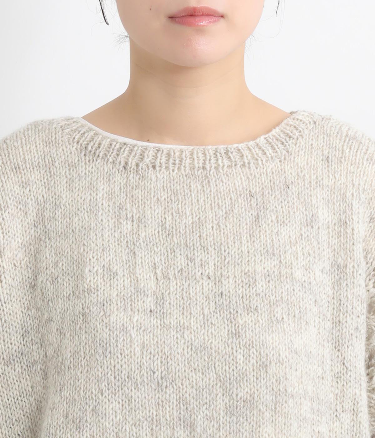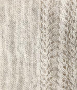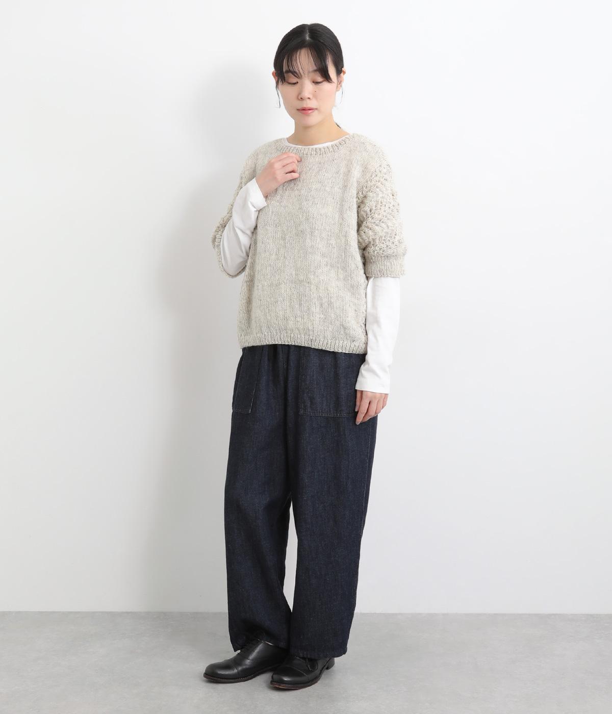 自然な風合いが魅力のウール糸を使用し、手編みで丁寧に仕上げられたあたたかみのあるニット生地。袖やサイドに透かし編みを取り入れています。