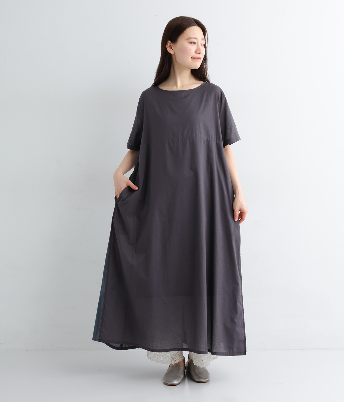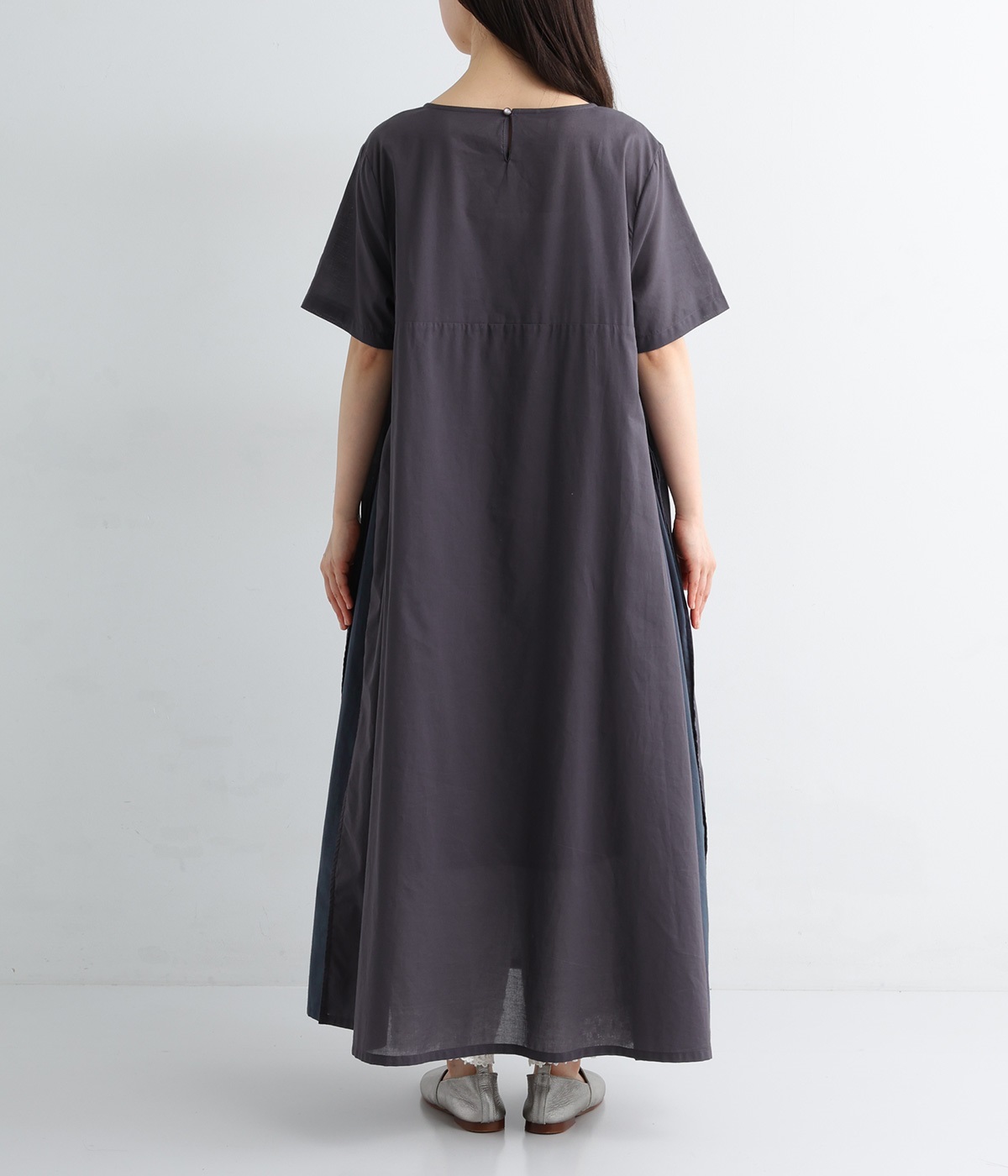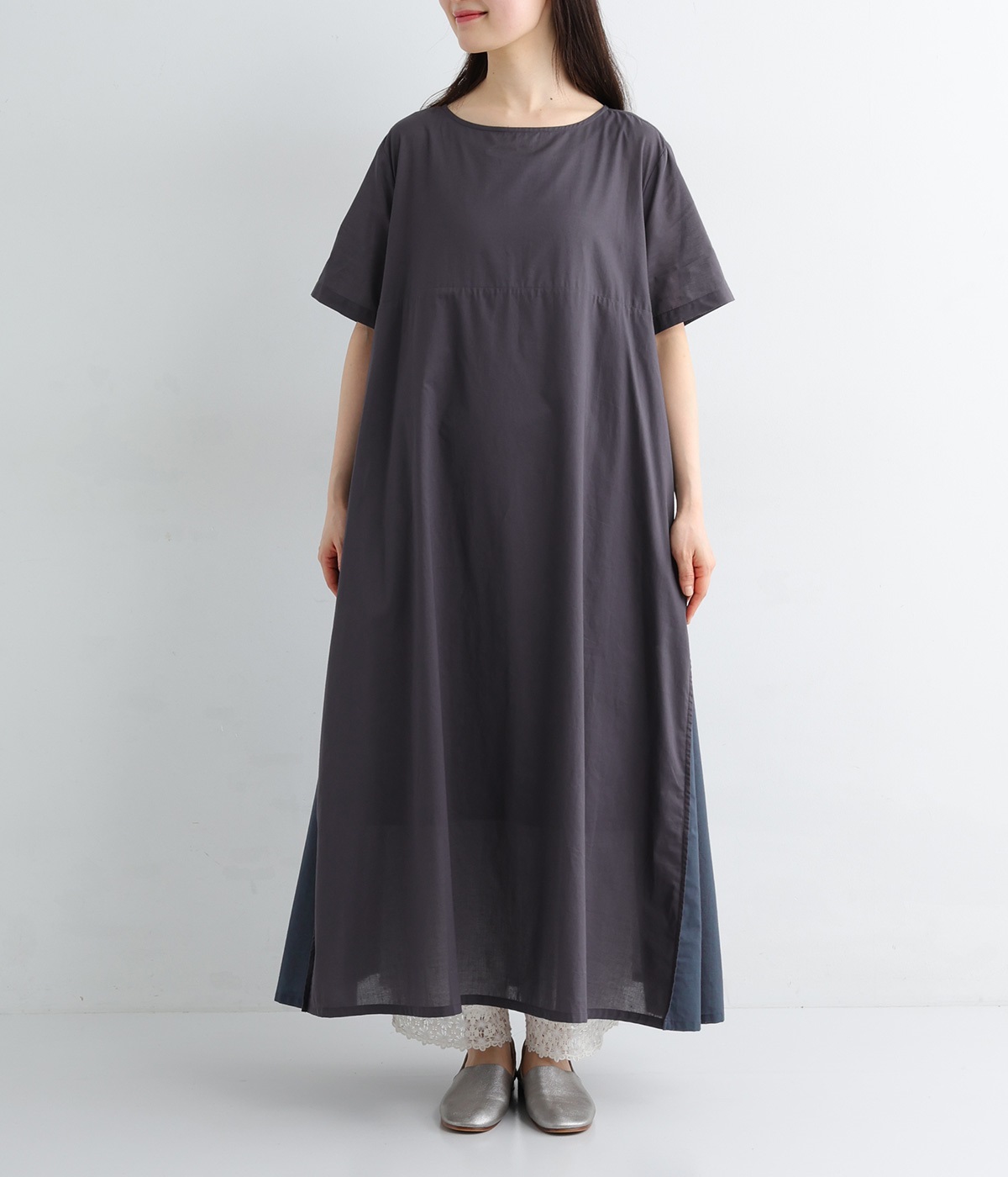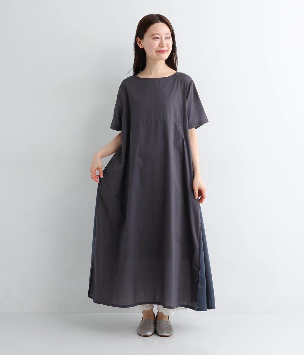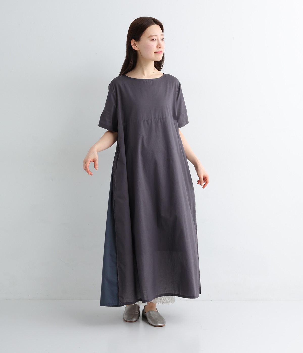 ワンピースはトーンの異なる素材を組み合わせた切り替えデザイン。ロング丈で存在感もあり、一枚着でコーディネートが決まります。
