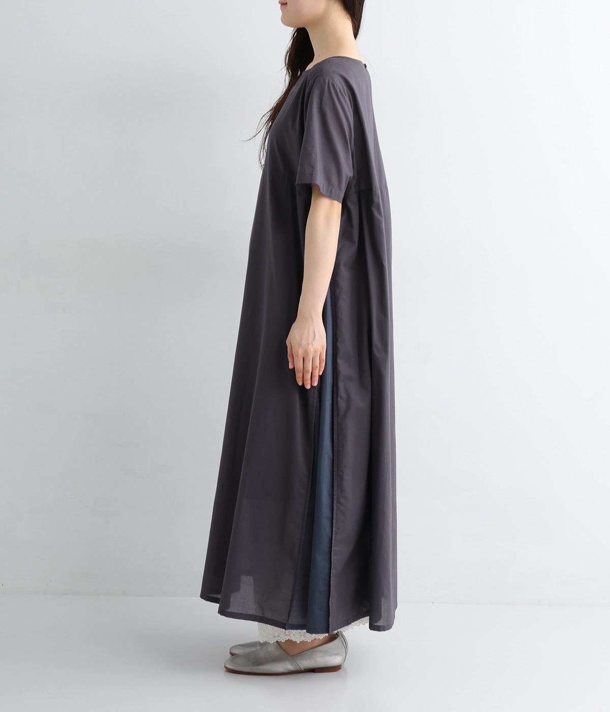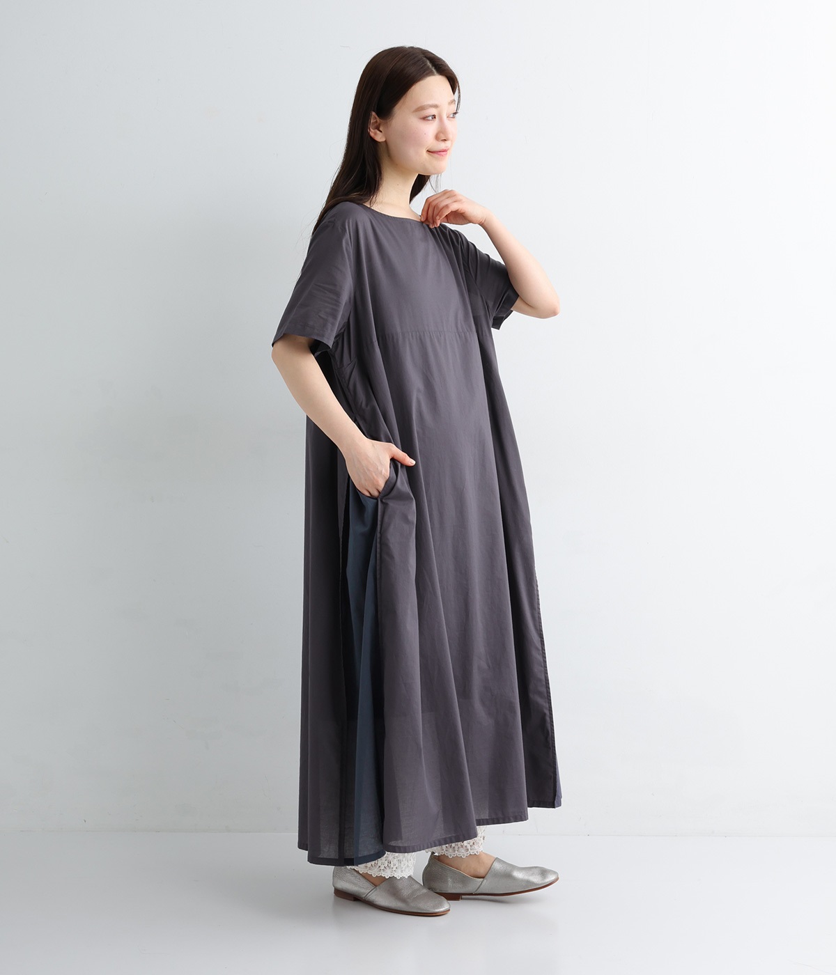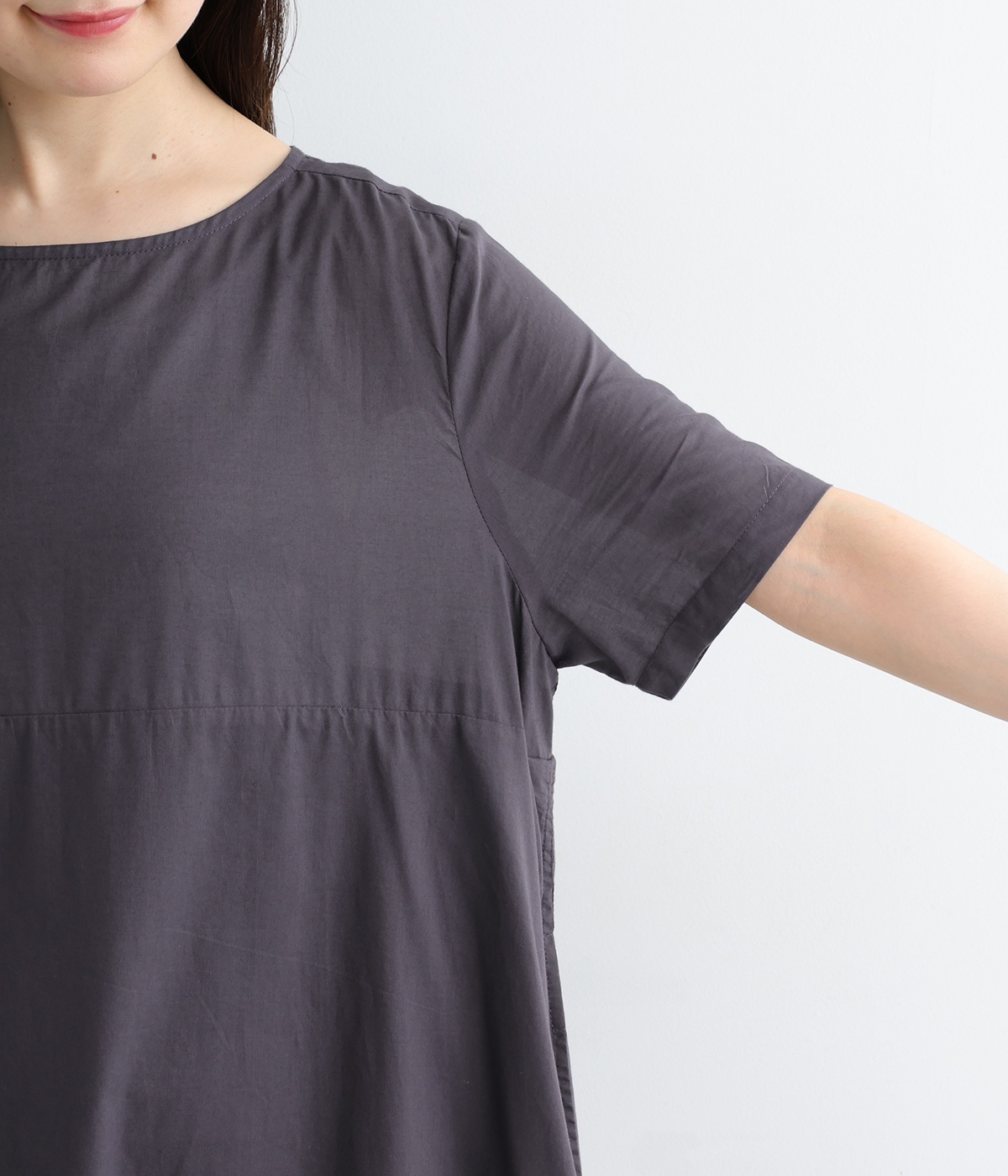胸下の切り替えで視線をほどよく上に集めつつ、太めの袖が気になる腕まわりをやさしくカバー。