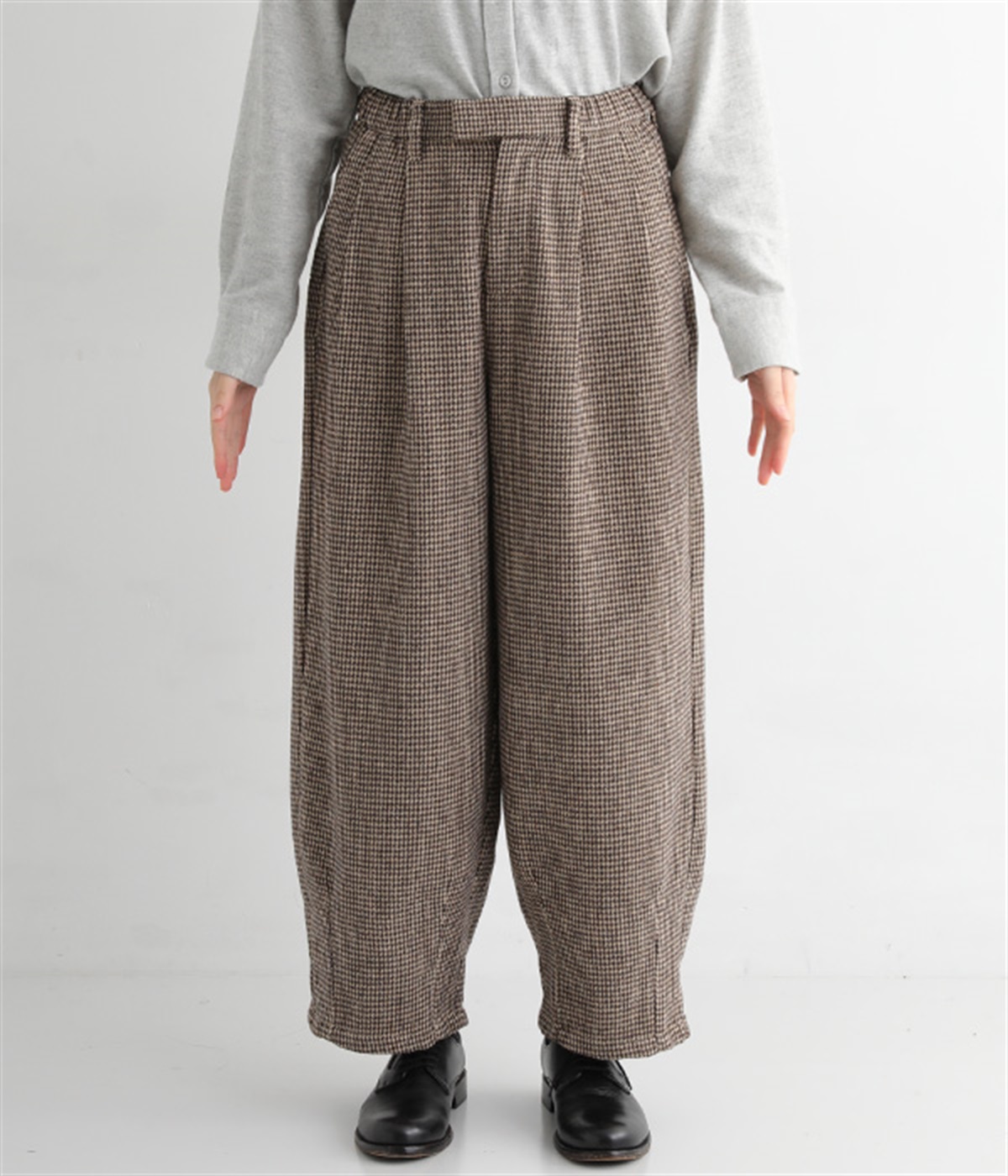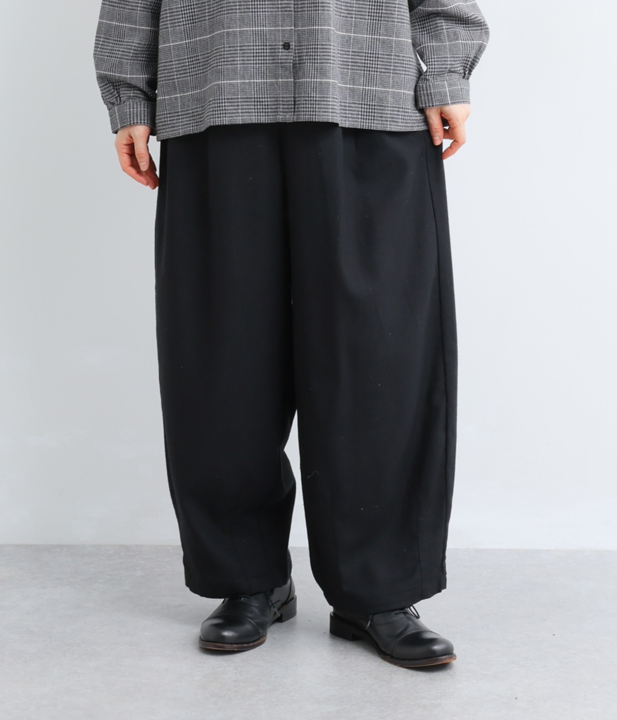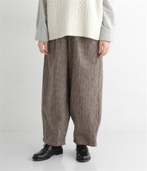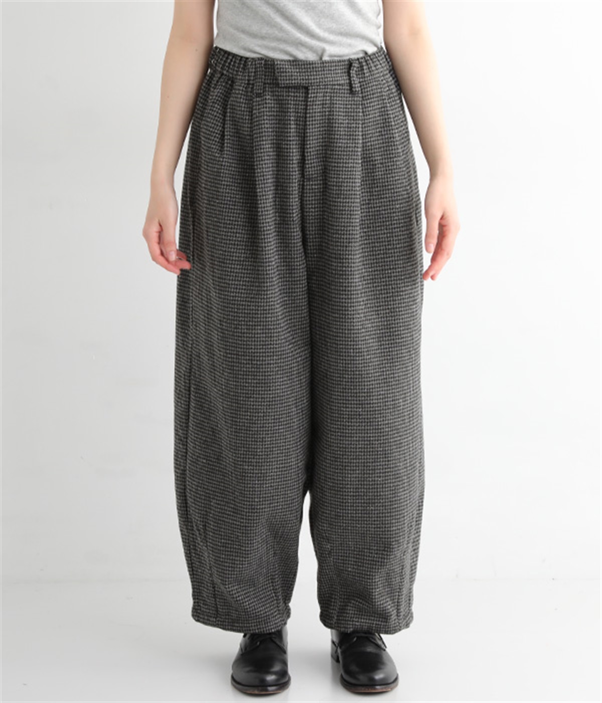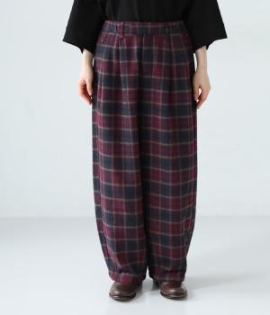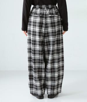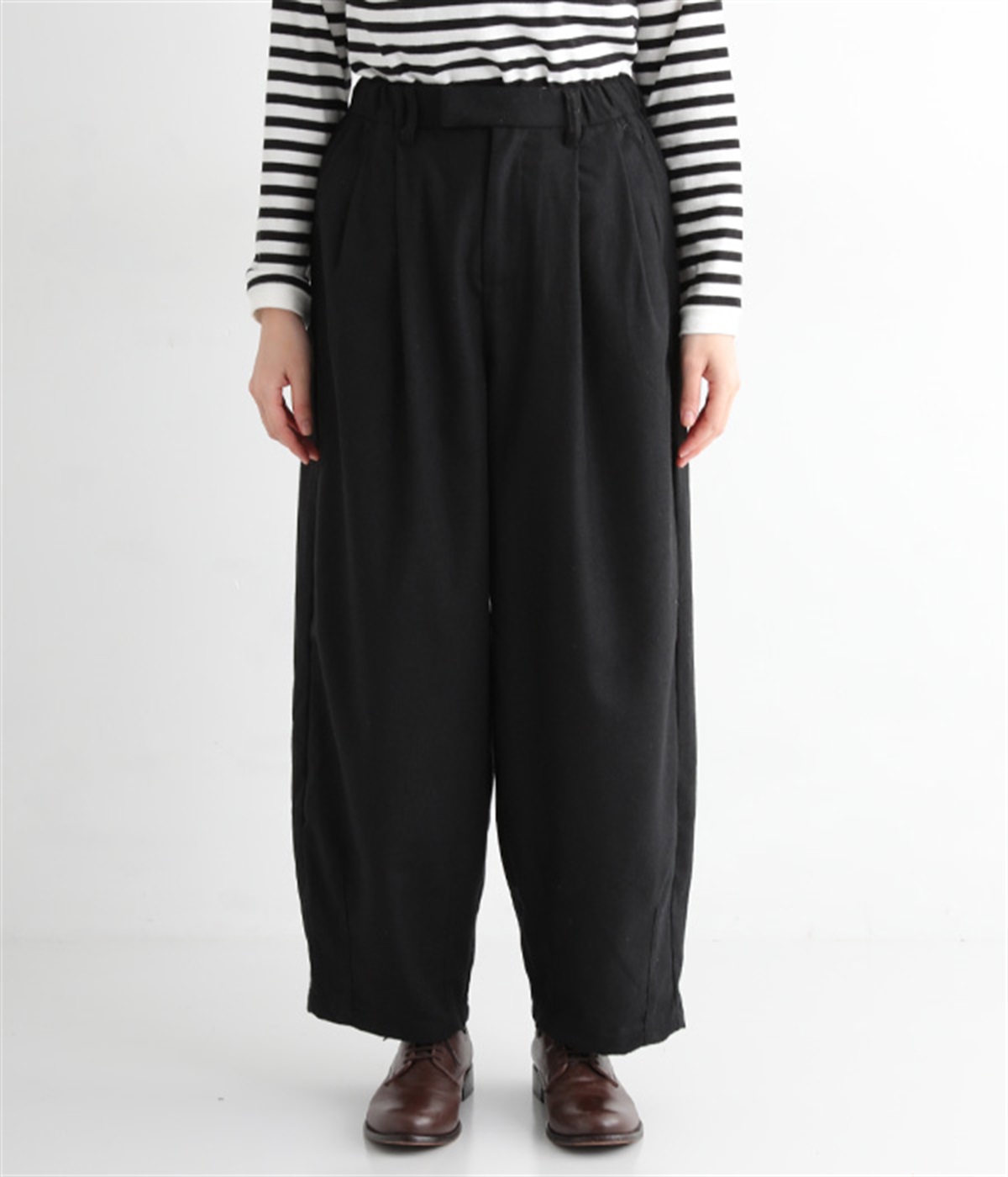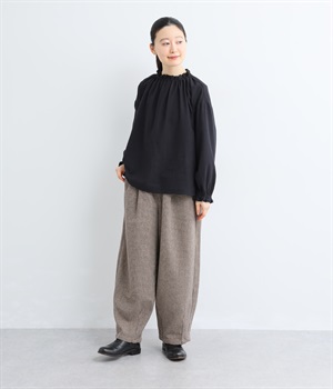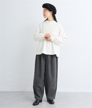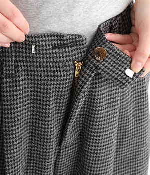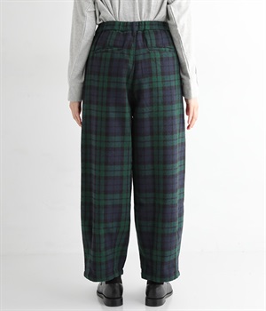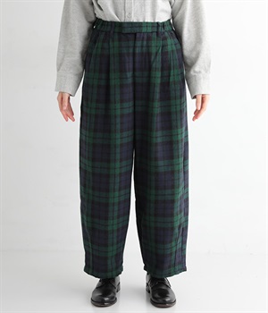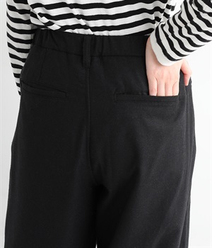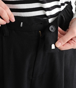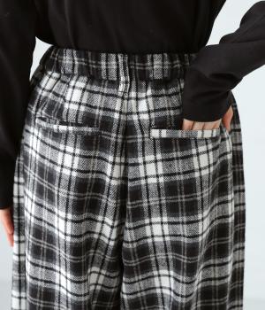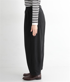 前ウエストにタックを、裾にダーツを入れて丸みのある立体的なボリュームシルエットに仕上げたサーカスパンツ。体のラインをカバーしつつ、ボトムスを主役にしたおしゃれなスタイルを叶えてくれます。ウエストは後ろのみゴム仕様で、前はすっきりとしたファスナー仕様です。