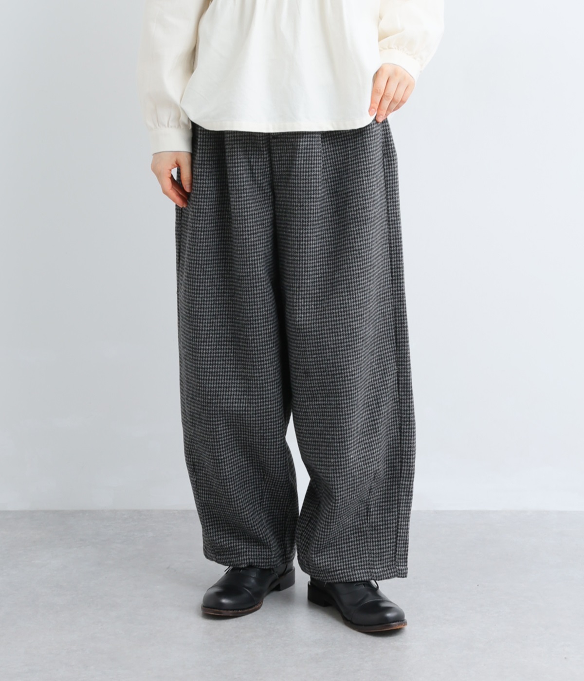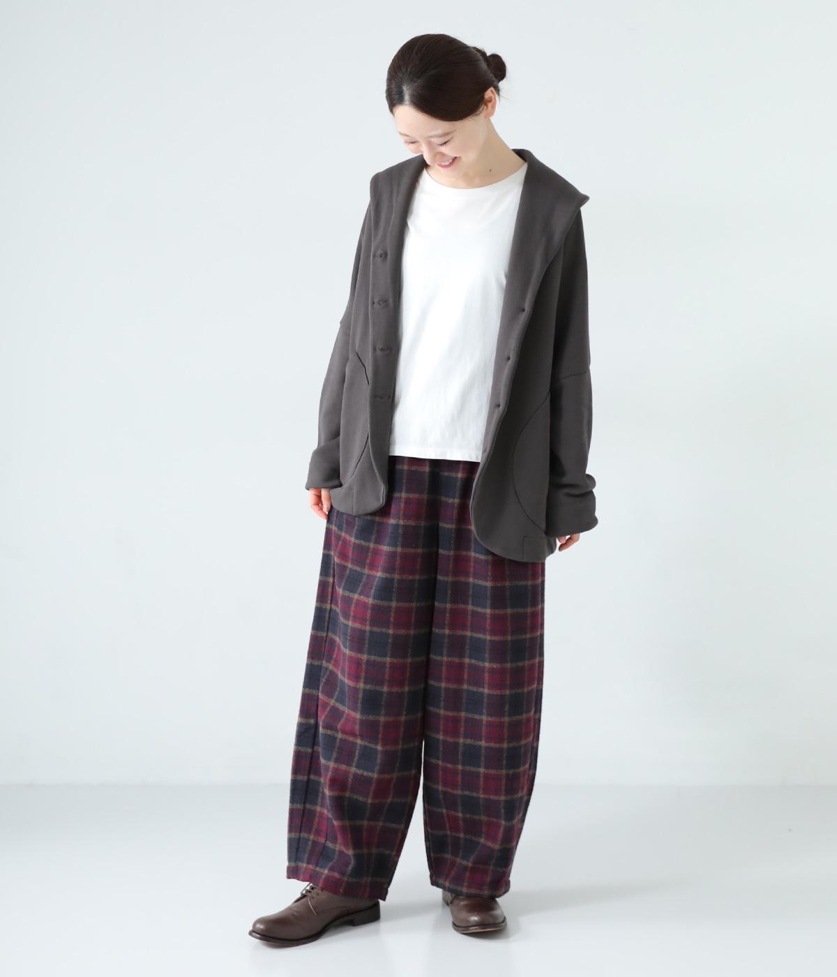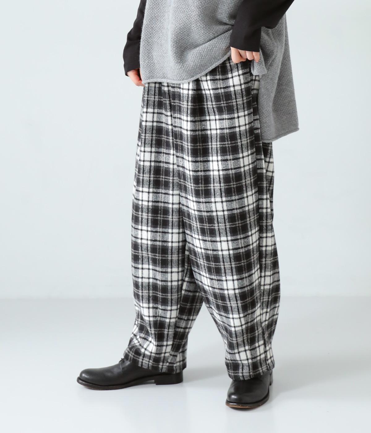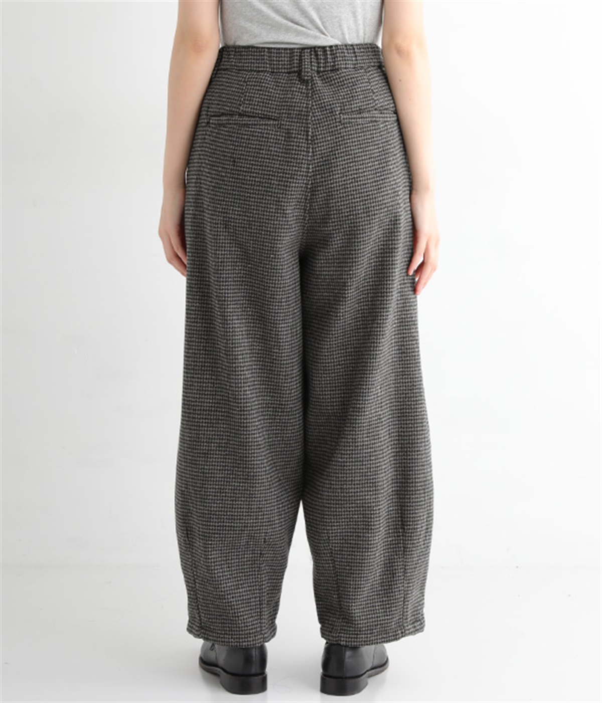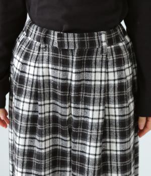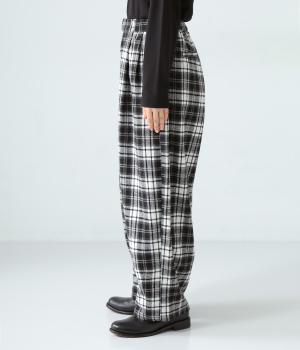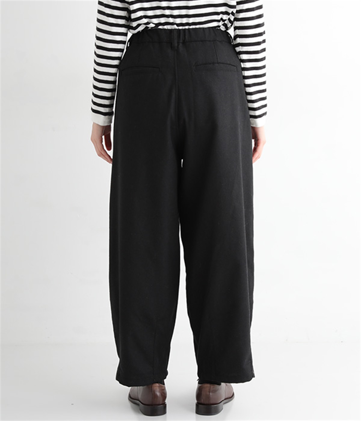 前ウエストにタックを、裾にダーツを入れて丸みのある立体的なボリュームシルエットに仕上げたサーカスパンツ。体のラインをカバーしつつ、ボトムスを主役にしたおしゃれなスタイルを叶えてくれます。ウエストは後ろのみゴム仕様で、前はすっきりとしたファスナー仕様です。