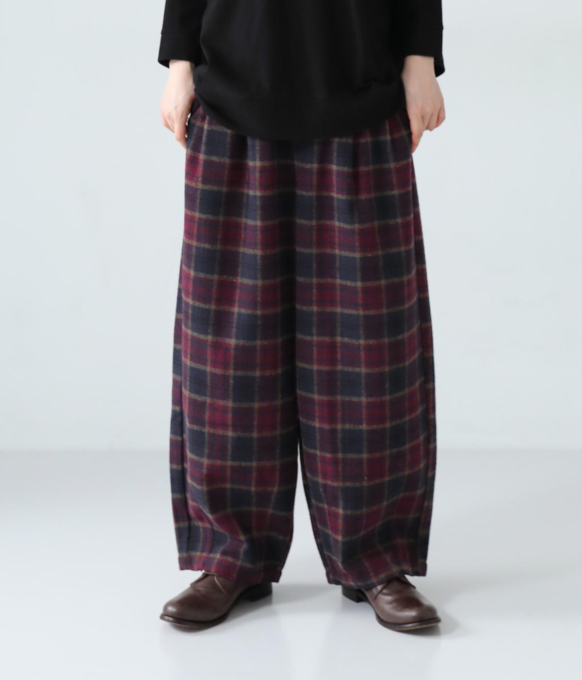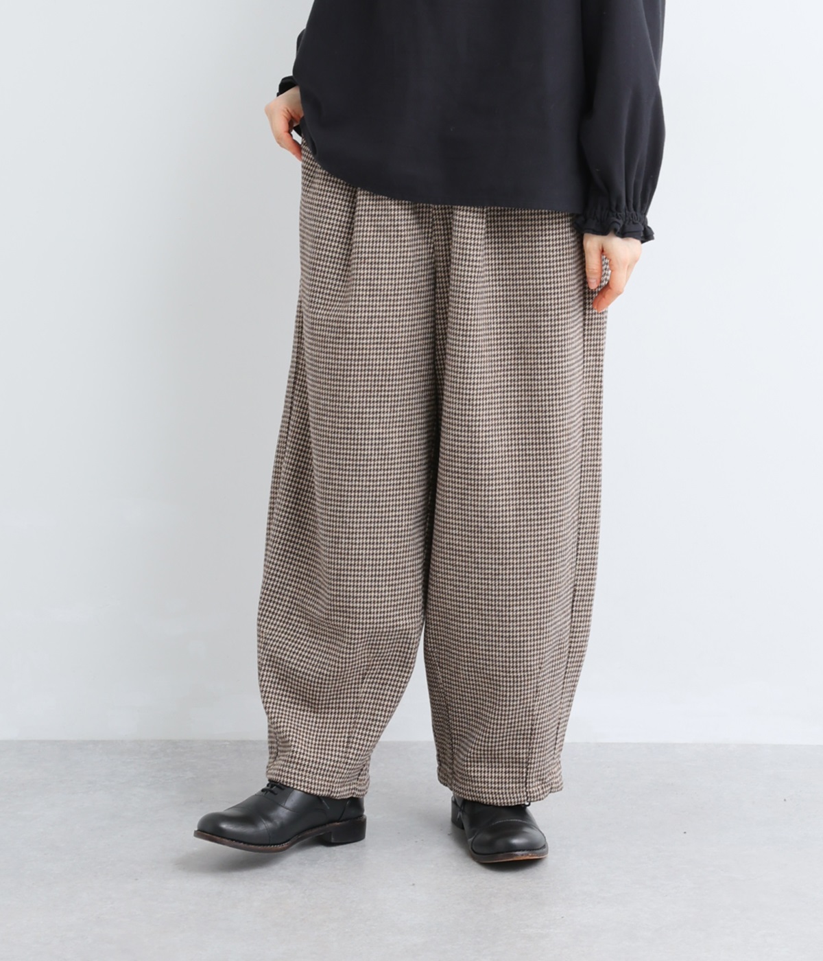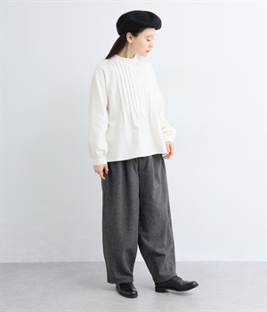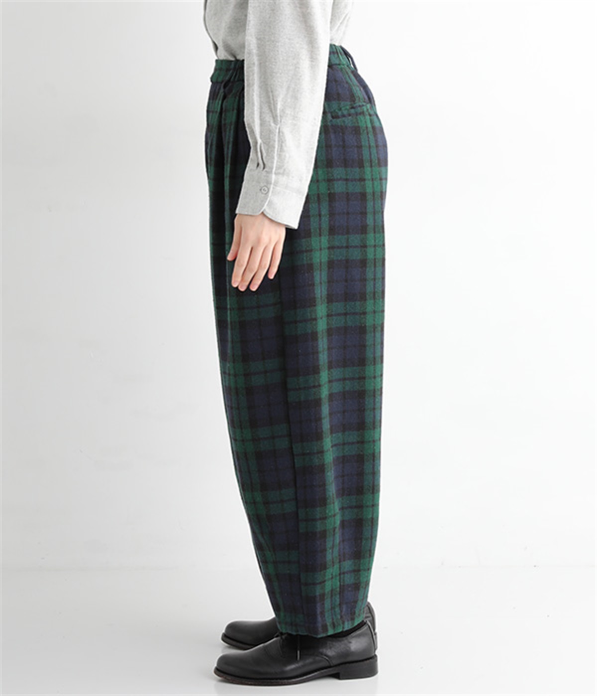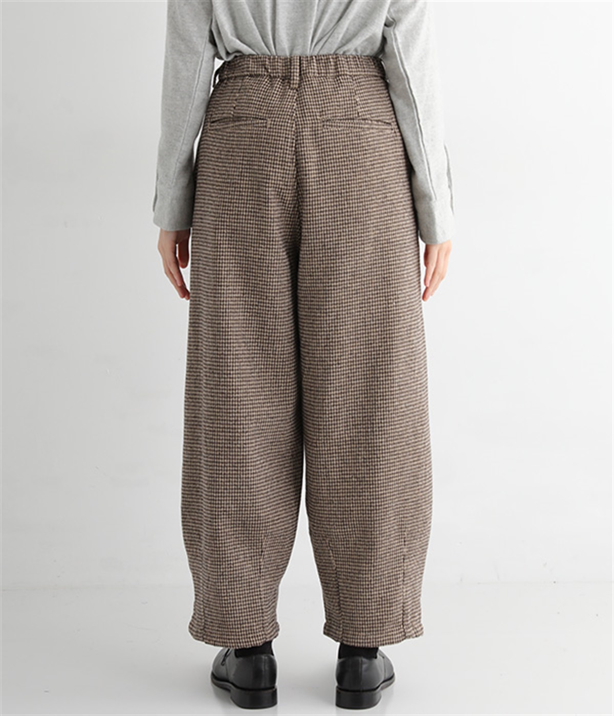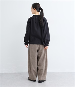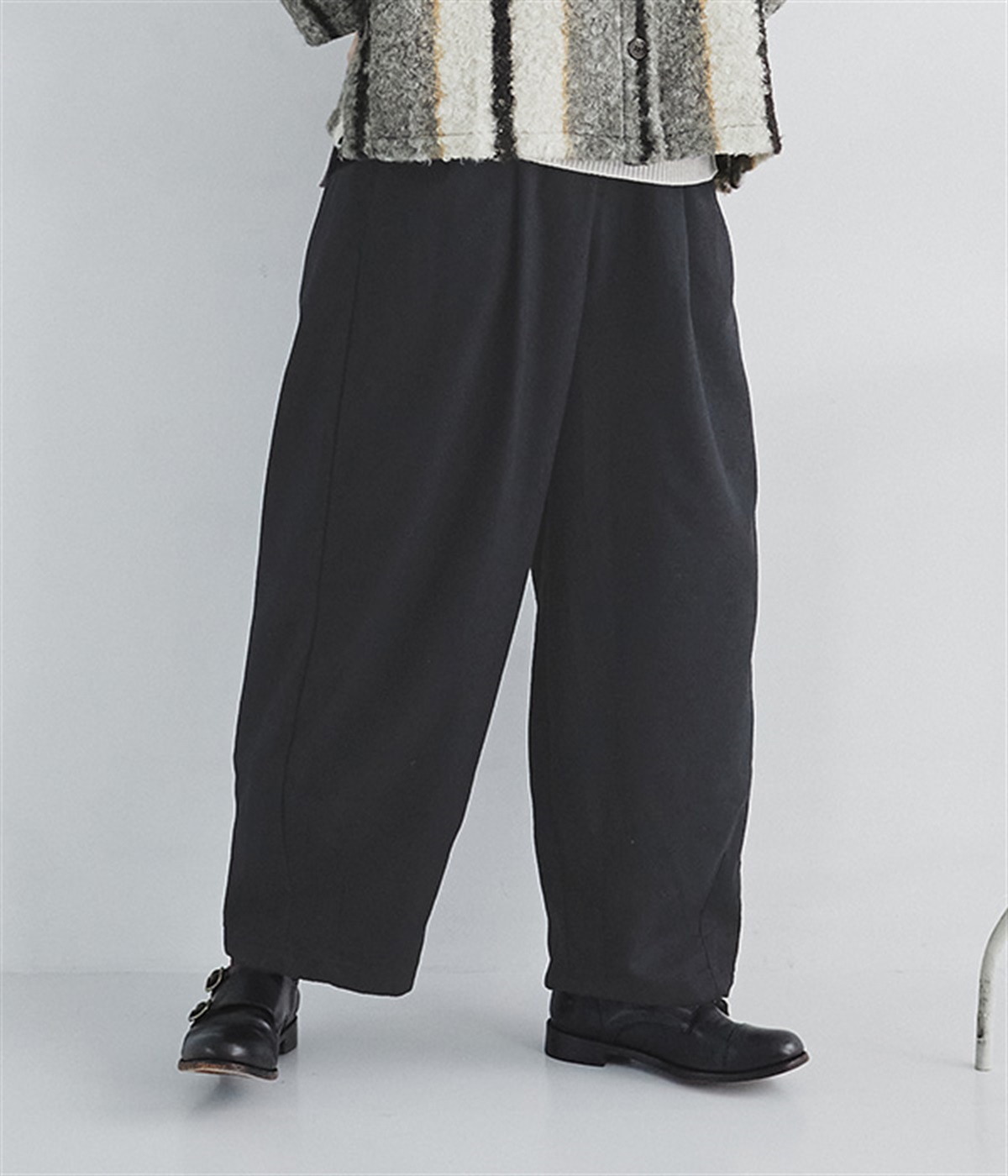 前ウエストにタックを、裾にダーツを入れて丸みのある立体的なボリュームシルエットに仕上げたサーカスパンツ。体のラインをカバーしつつ、ボトムスを主役にしたおしゃれなスタイルを叶えてくれます。ウエストは後ろのみゴム仕様で、前はすっきりとしたファスナー仕様です。