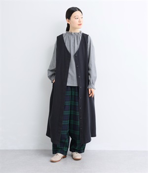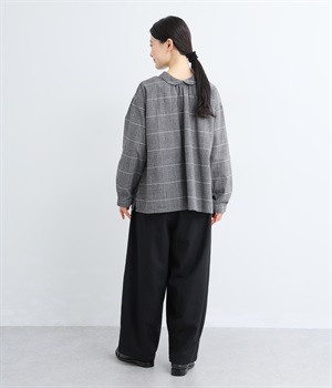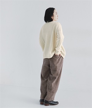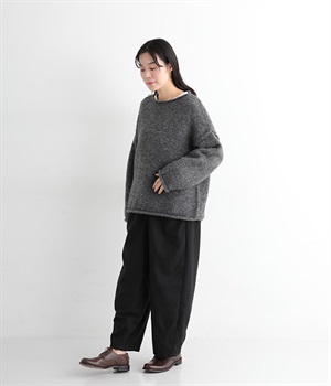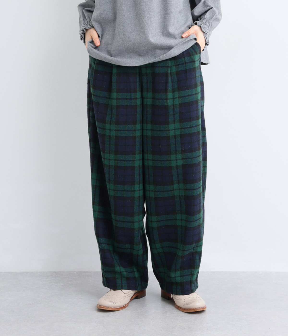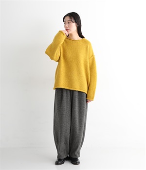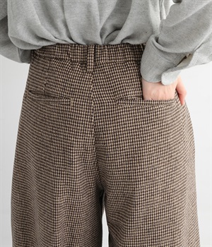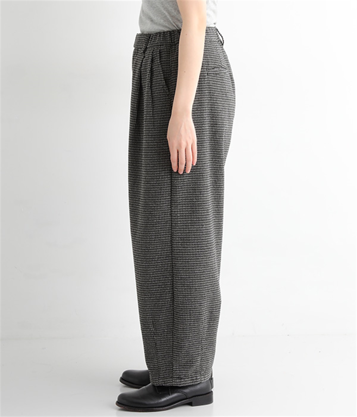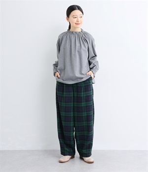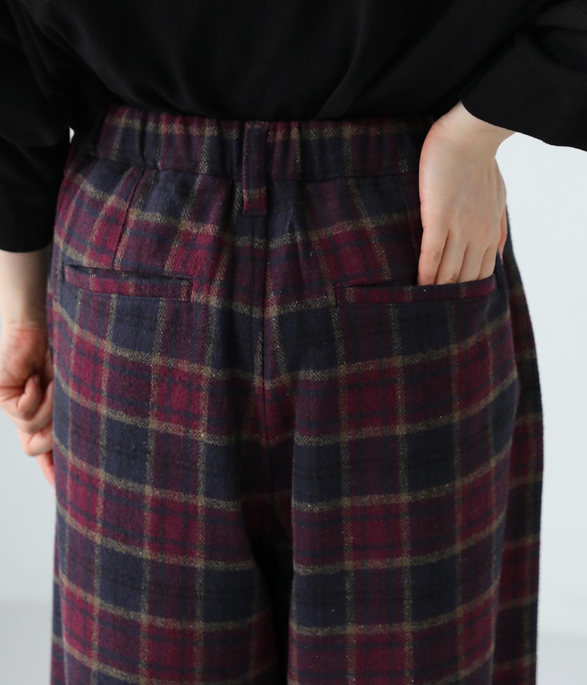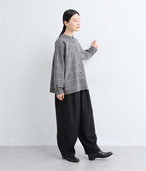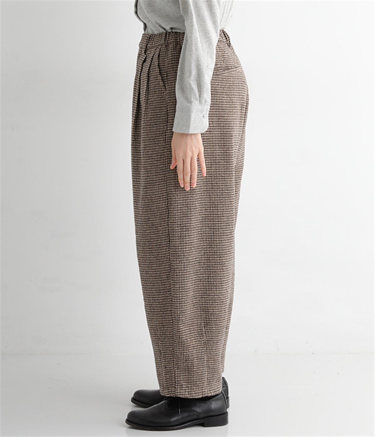 前ウエストにタックを、裾にダーツを入れて丸みのある立体的なボリュームシルエットに仕上げたサーカスパンツ。体のラインをカバーしつつ、ボトムスを主役にしたおしゃれなスタイルを叶えてくれます。ウエストは後ろのみゴム仕様で、前はすっきりとしたファスナー仕様です。