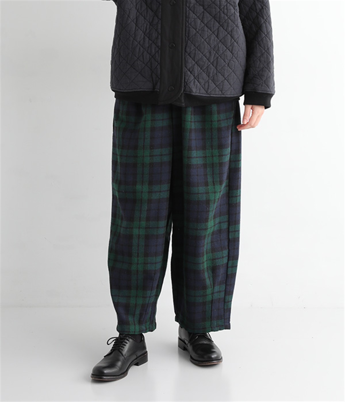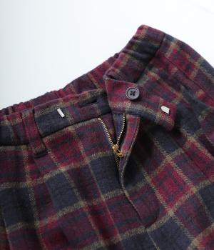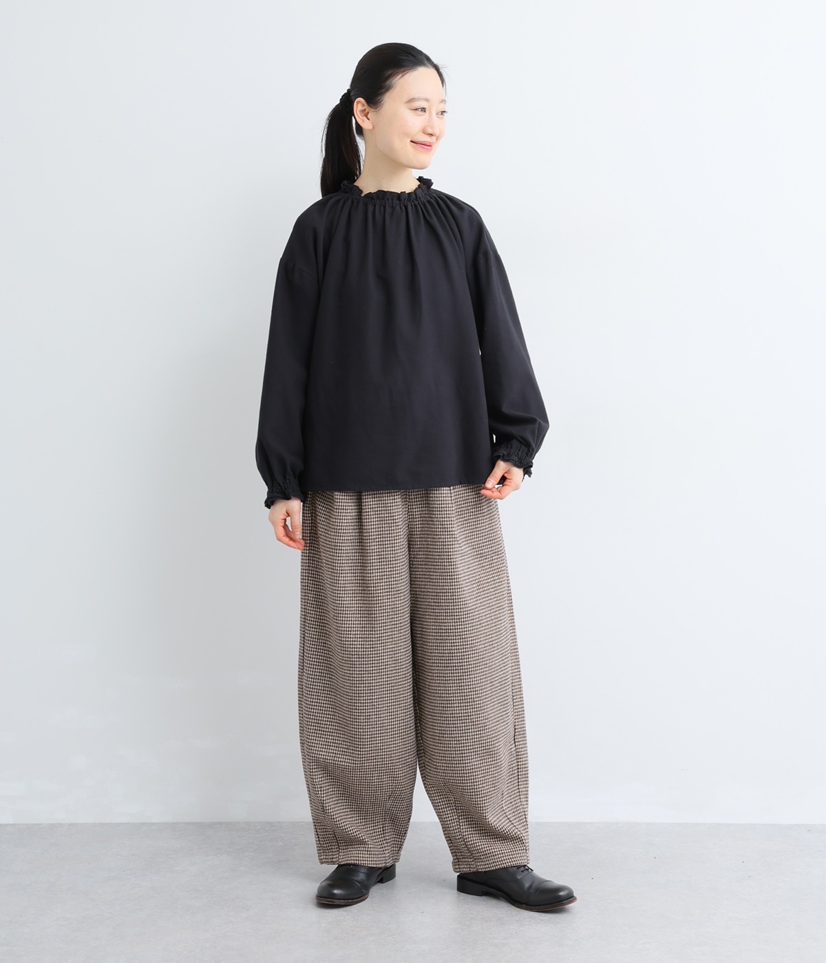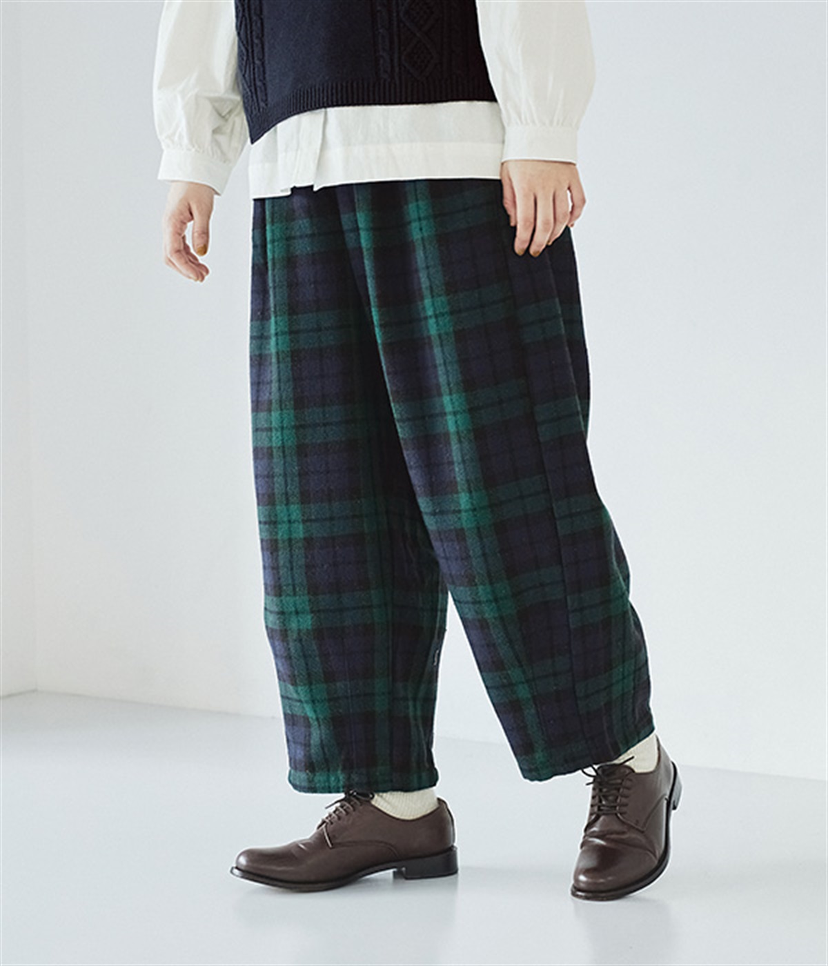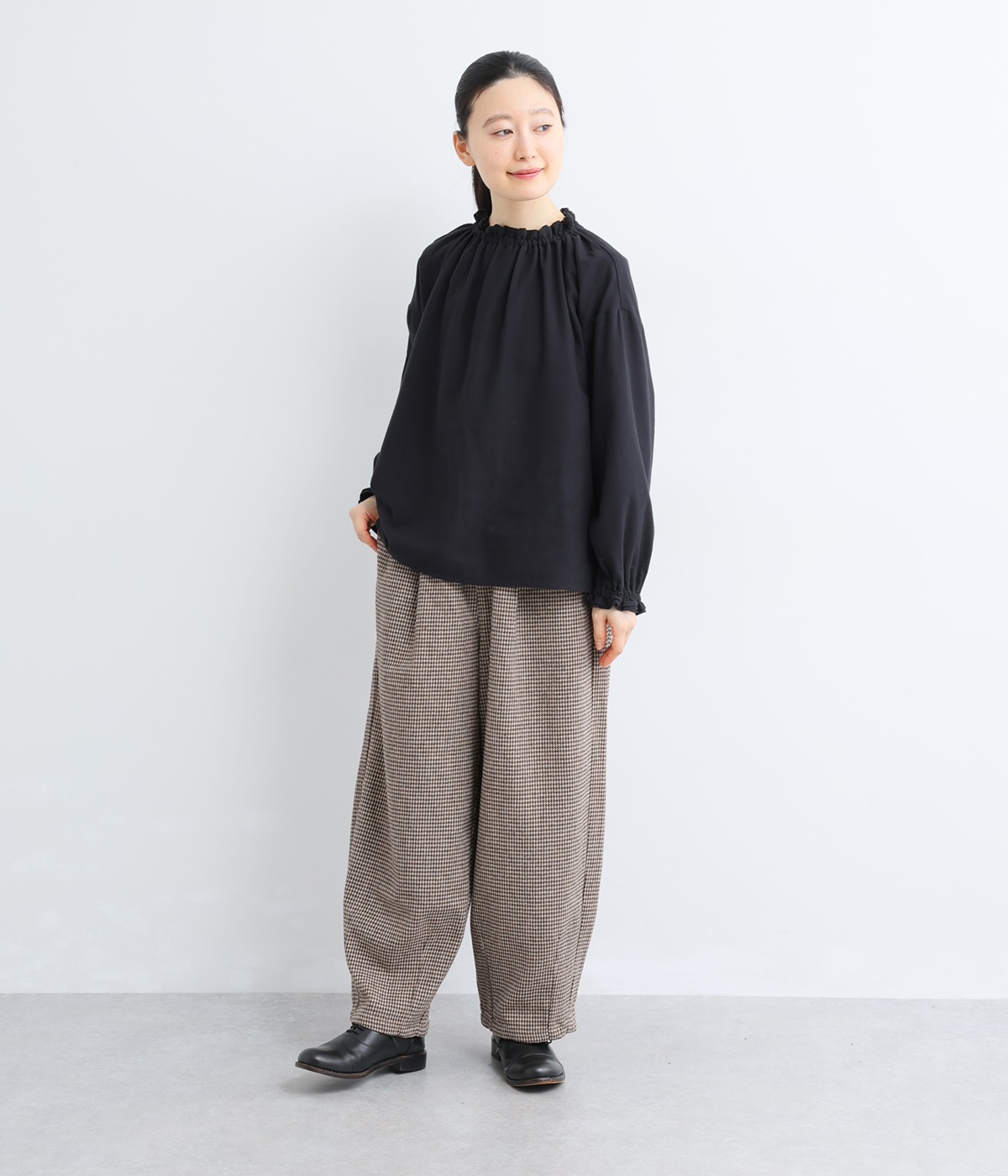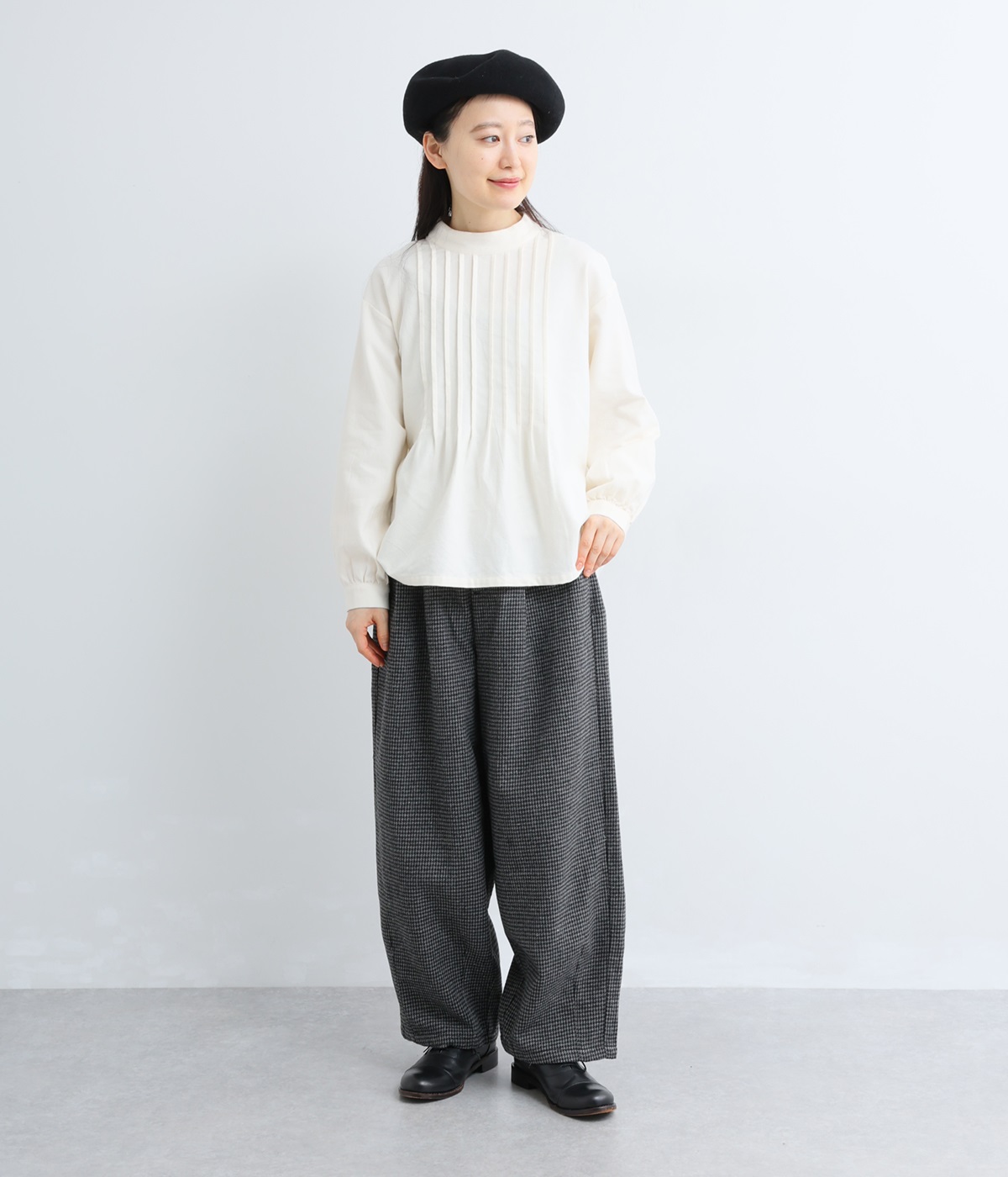 前ウエストにタックを、裾にダーツを入れて丸みのある立体的なボリュームシルエットに仕上げたサーカスパンツ。体のラインをカバーしつつ、ボトムスを主役にしたおしゃれなスタイルを叶えてくれます。ウエストは後ろのみゴム仕様で、前はすっきりとしたファスナー仕様です。