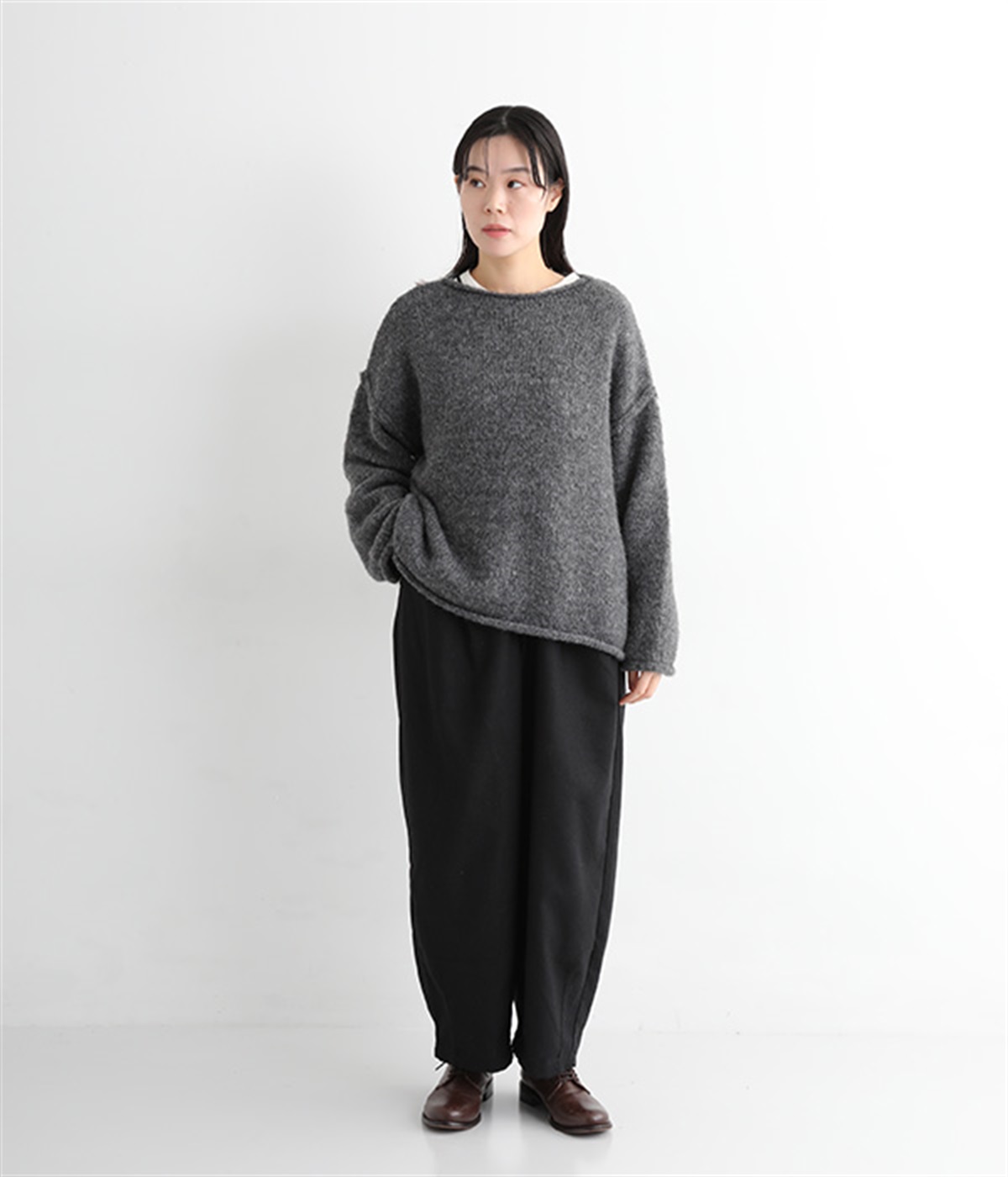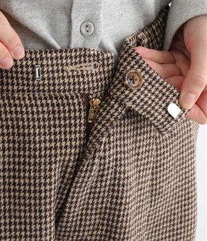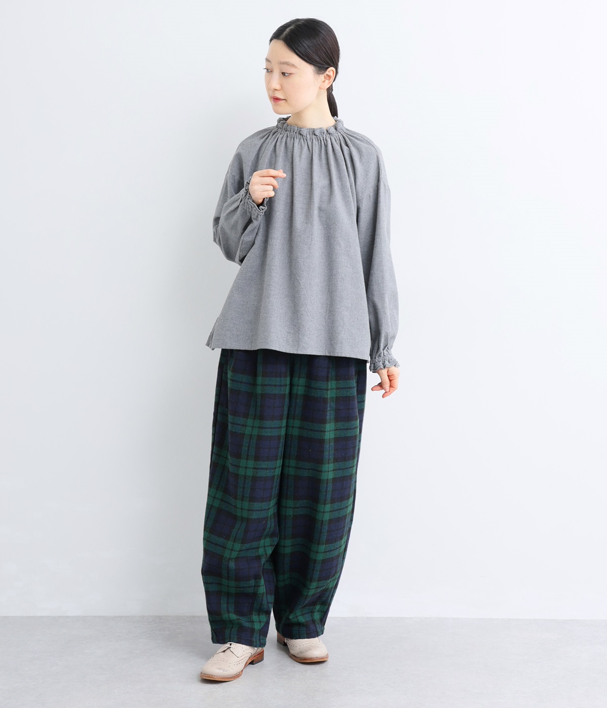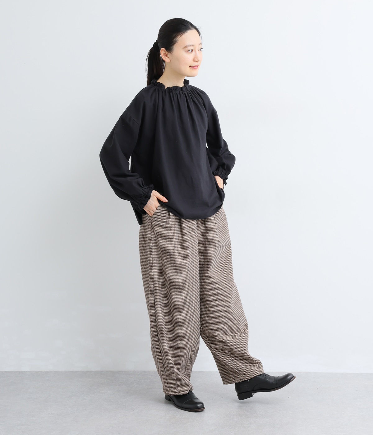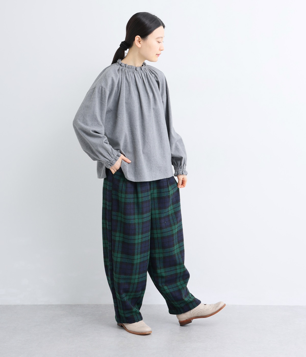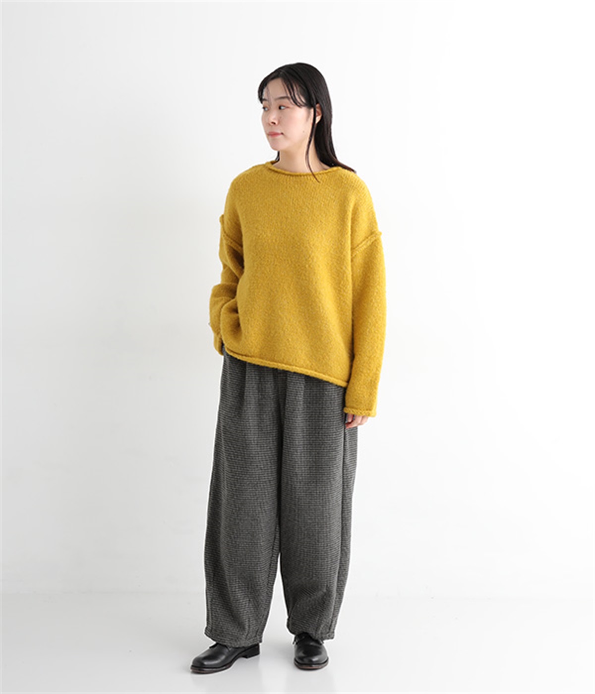 前ウエストにタックを、裾にダーツを入れて丸みのある立体的なボリュームシルエットに仕上げたサーカスパンツ。体のラインをカバーしつつ、ボトムスを主役にしたおしゃれなスタイルを叶えてくれます。ウエストは後ろのみゴム仕様で、前はすっきりとしたファスナー仕様です。