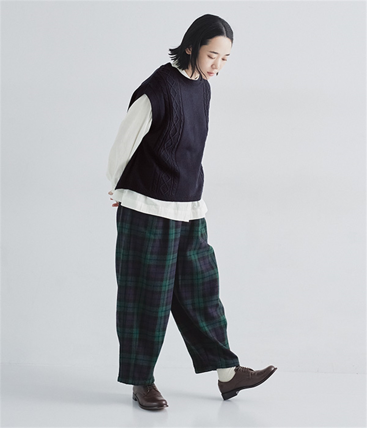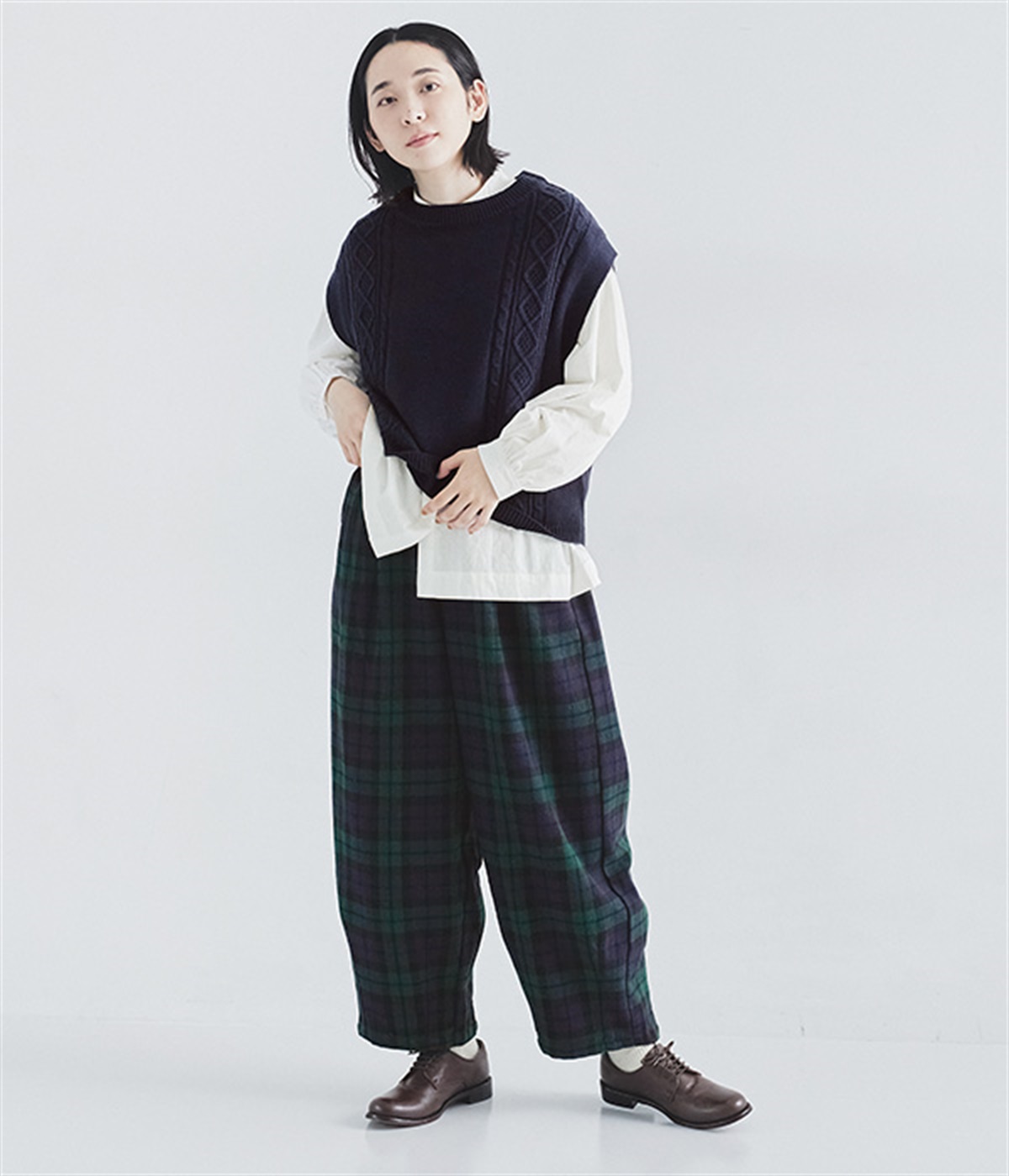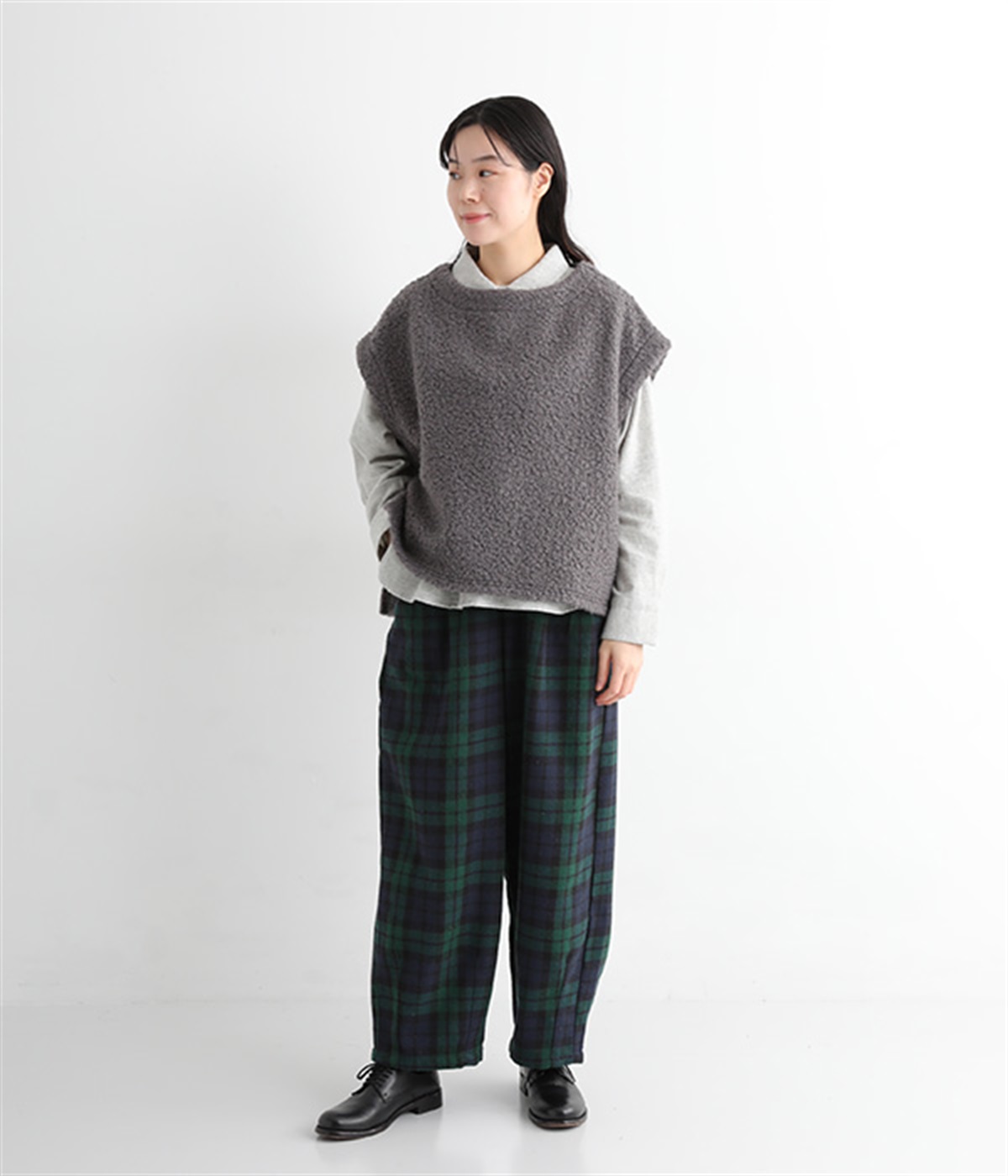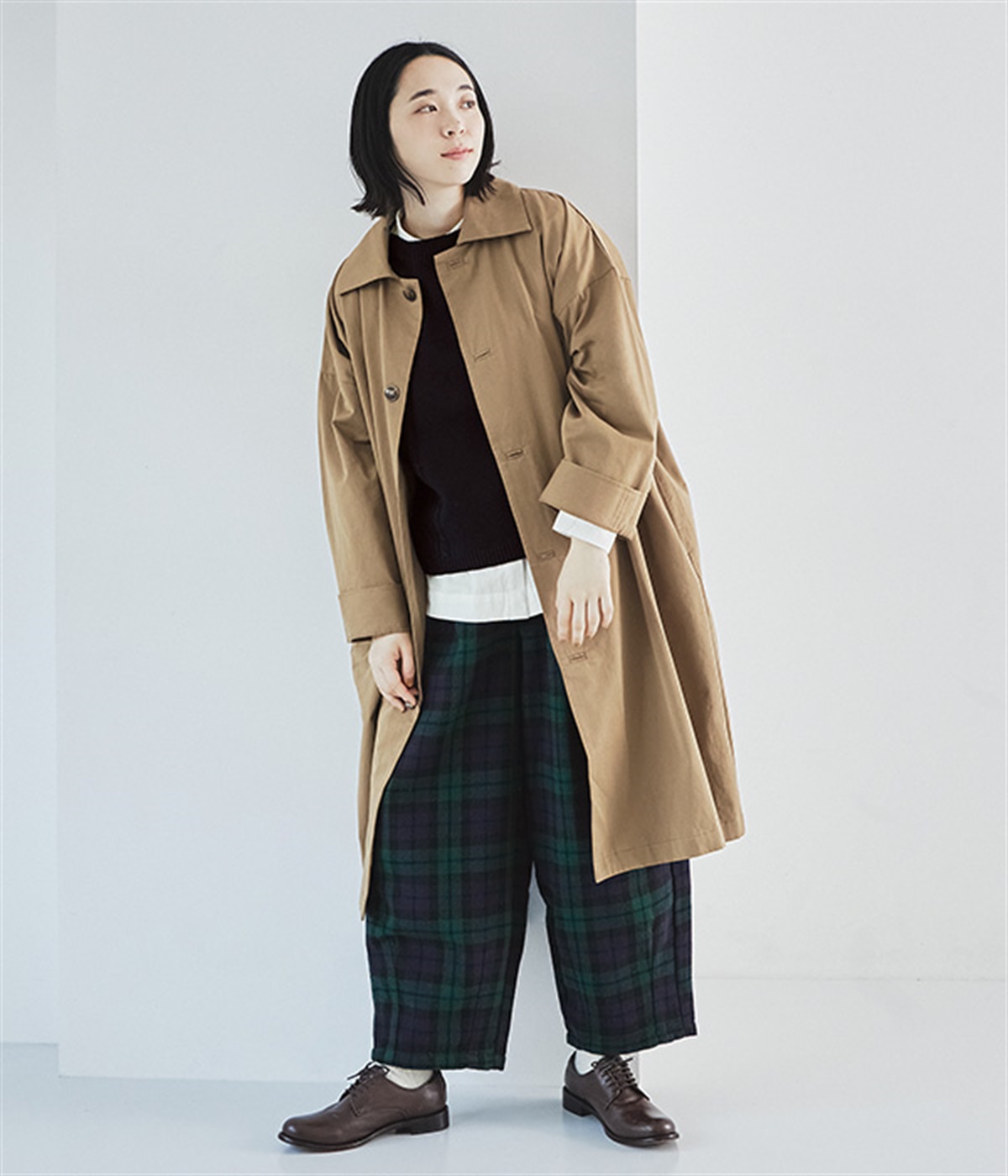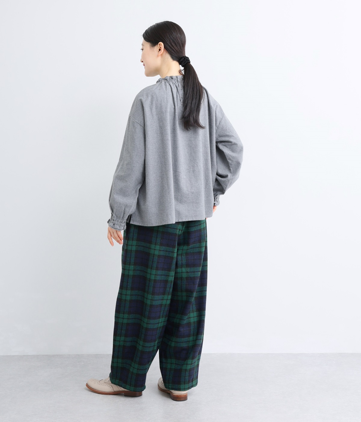 前ウエストにタックを、裾にダーツを入れて丸みのある立体的なボリュームシルエットに仕上げたサーカスパンツ。体のラインをカバーしつつ、ボトムスを主役にしたおしゃれなスタイルを叶えてくれます。ウエストは後ろのみゴム仕様で、前はすっきりとしたファスナー仕様です。