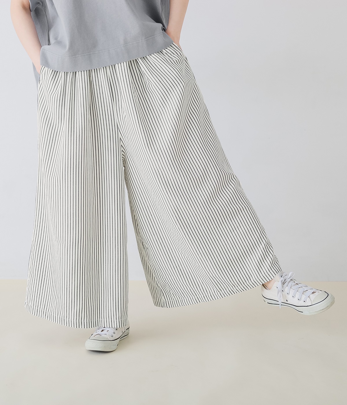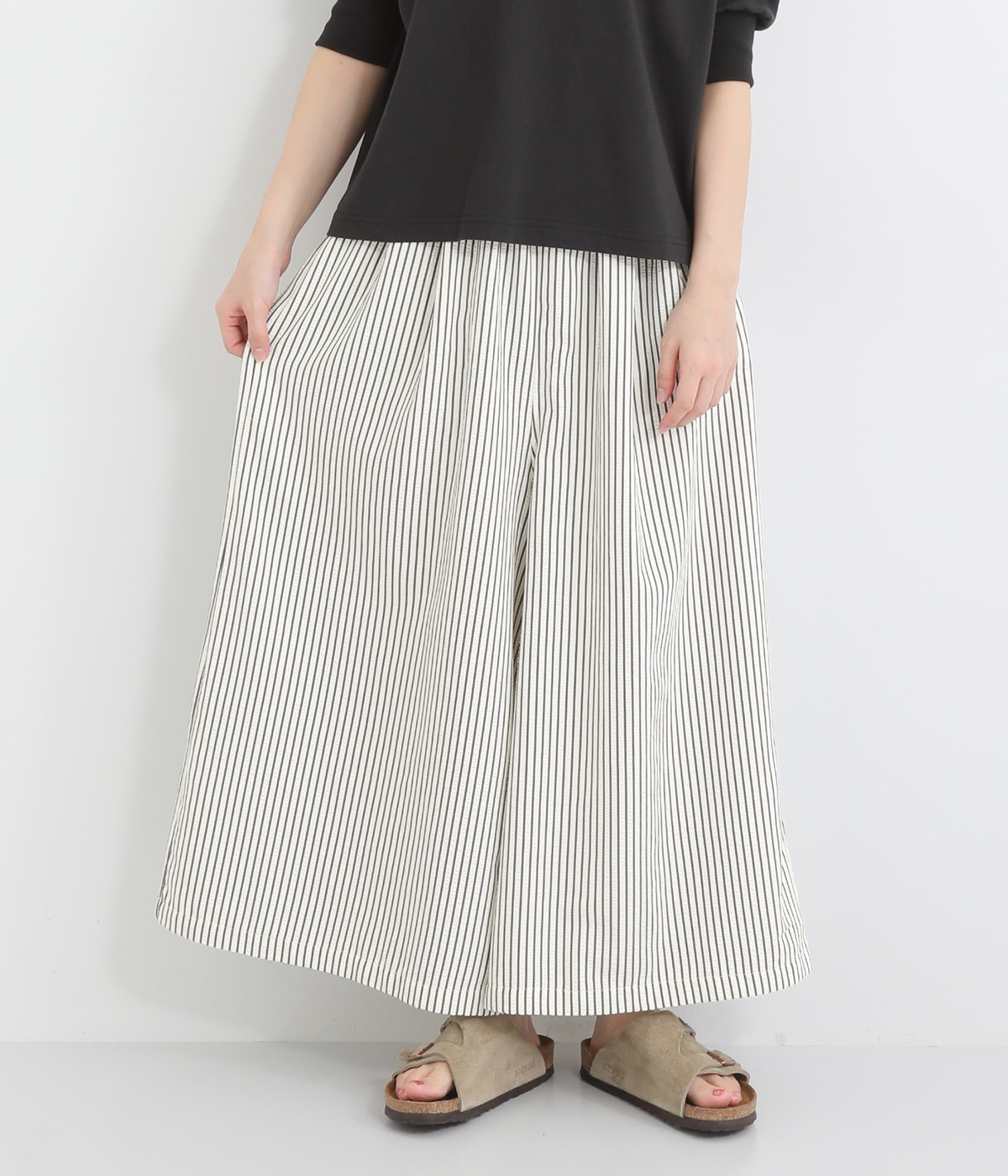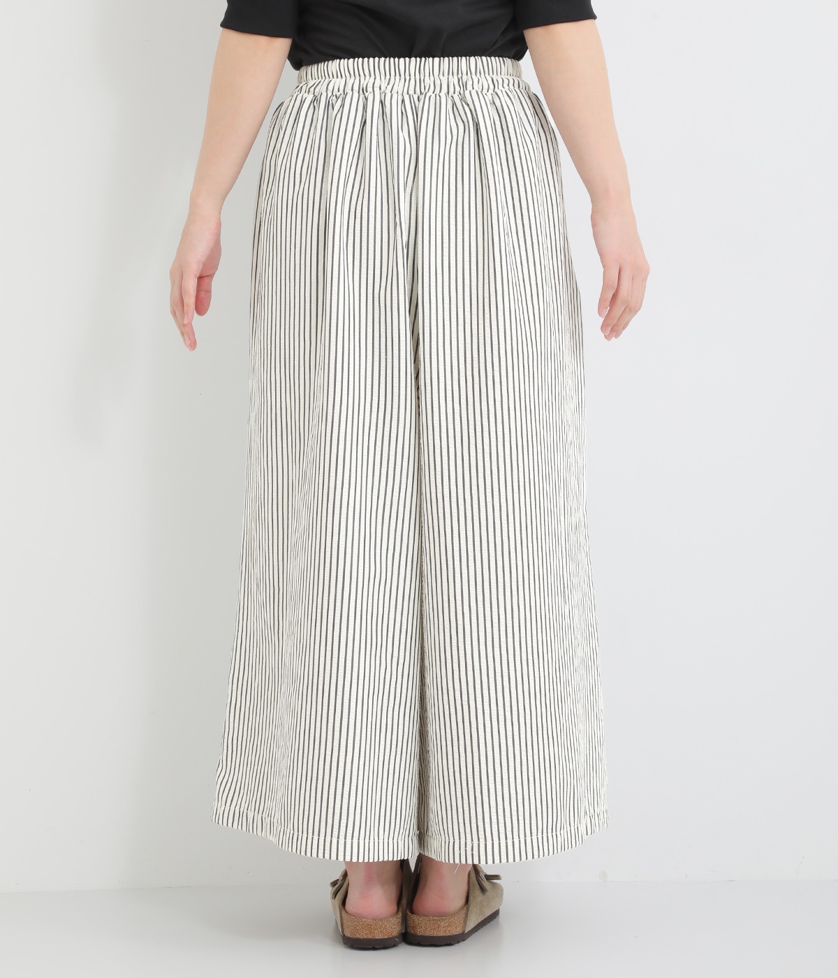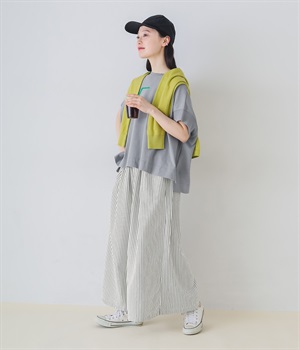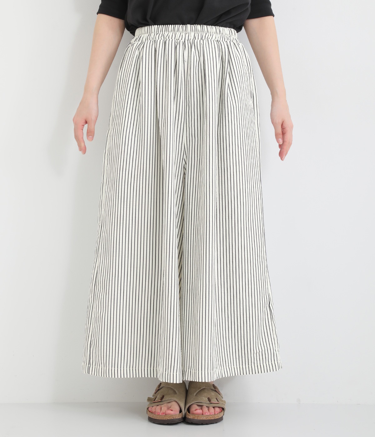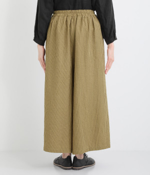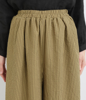 ストライプ柄を印象づけるボリュームたっぷりのフレアシルエットです。デイリースタイルにゆとりを感じさせ、もちろんはき心地もイージー。ウエストは総ゴム仕立てで、サイズ調節可能なドロストコードつきです。