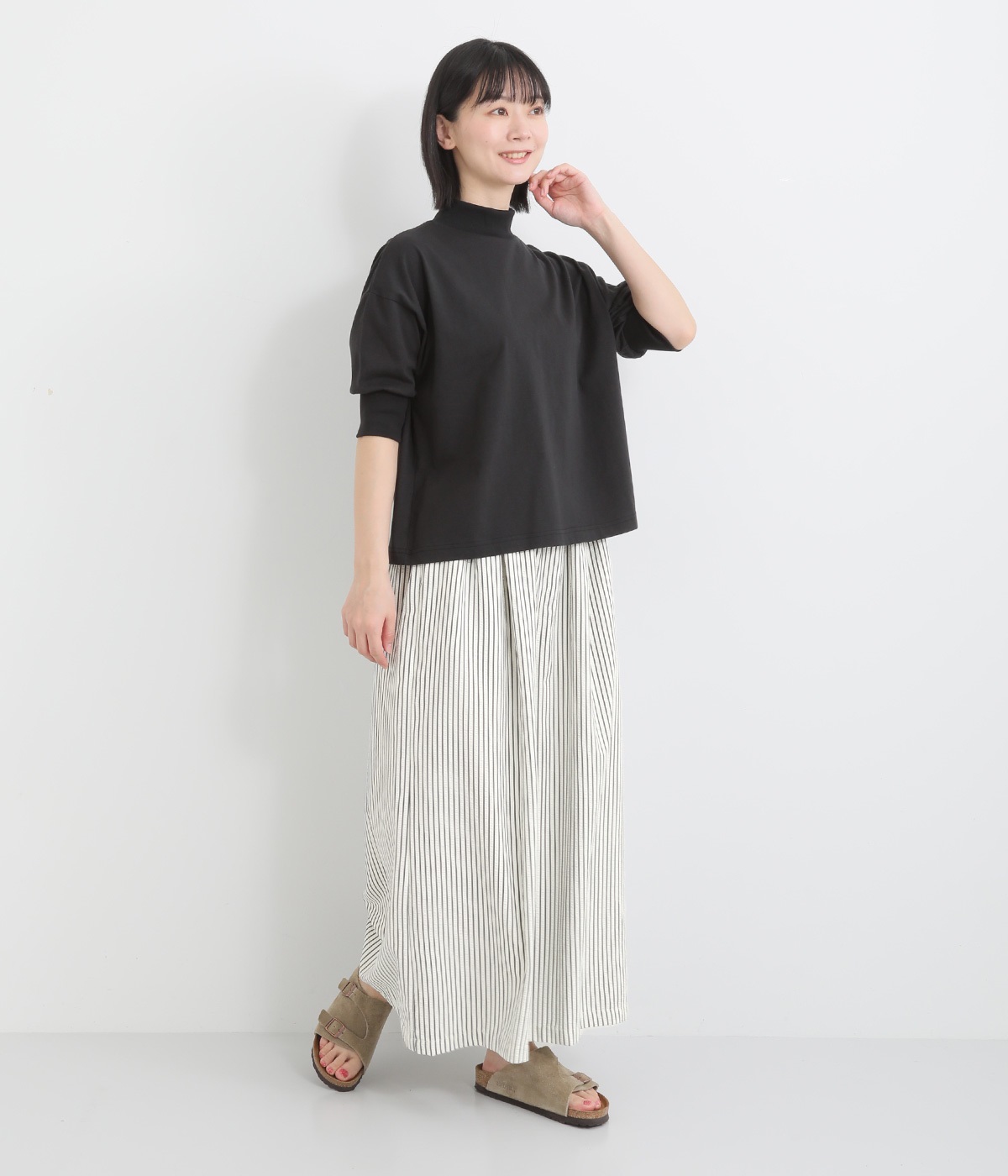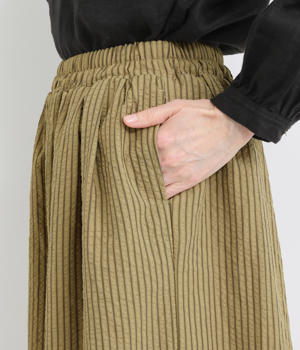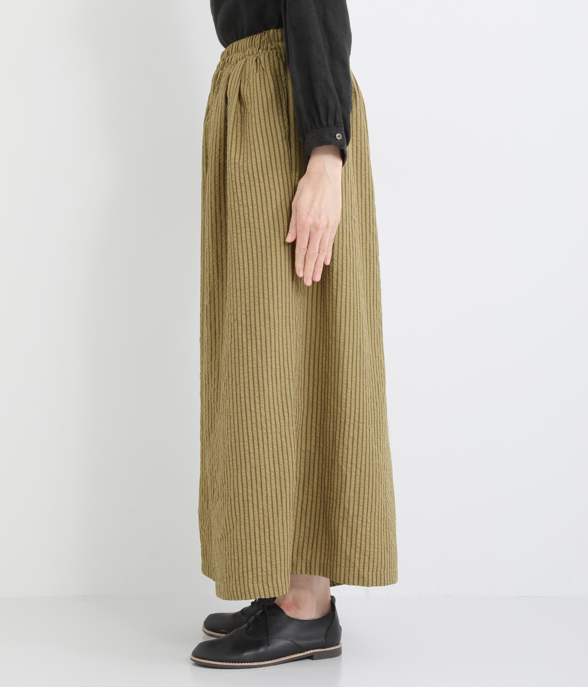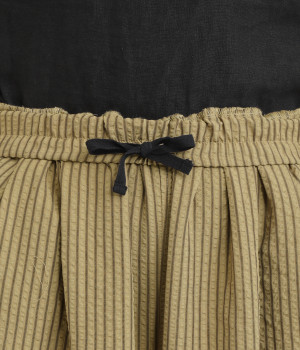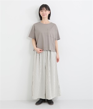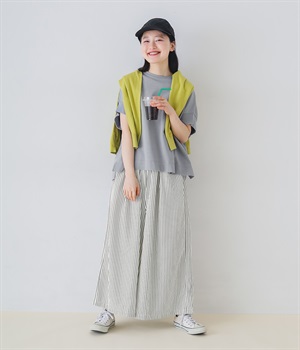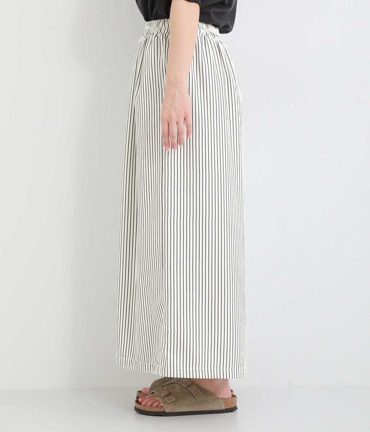 ストライプ柄を印象づけるボリュームたっぷりのフレアシルエットです。デイリースタイルにゆとりを感じさせ、もちろんはき心地もイージー。ウエストは総ゴム仕立てで、サイズ調節可能なドロストコードつきです。