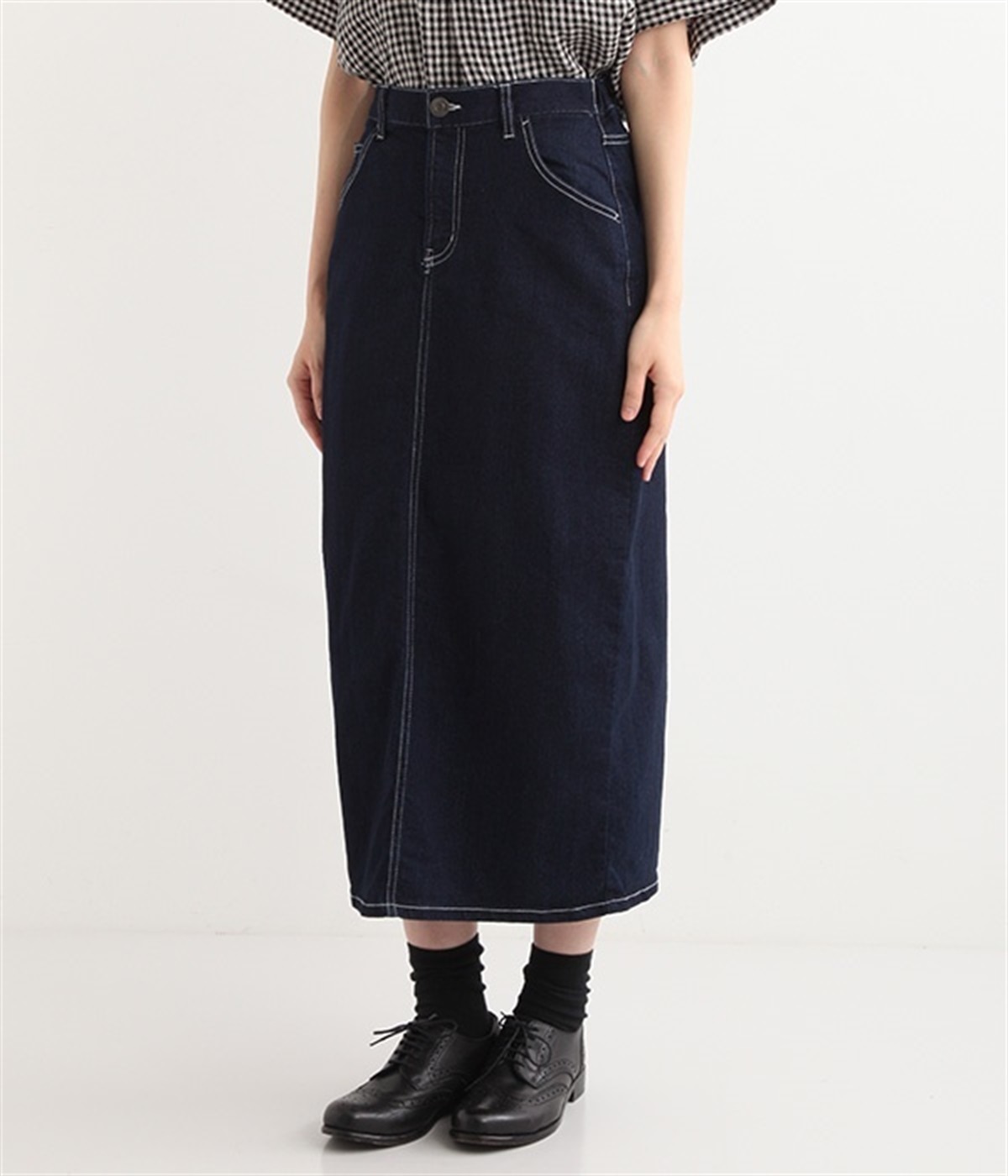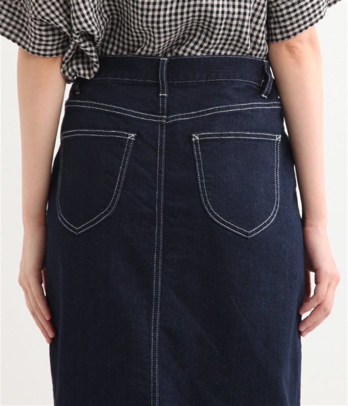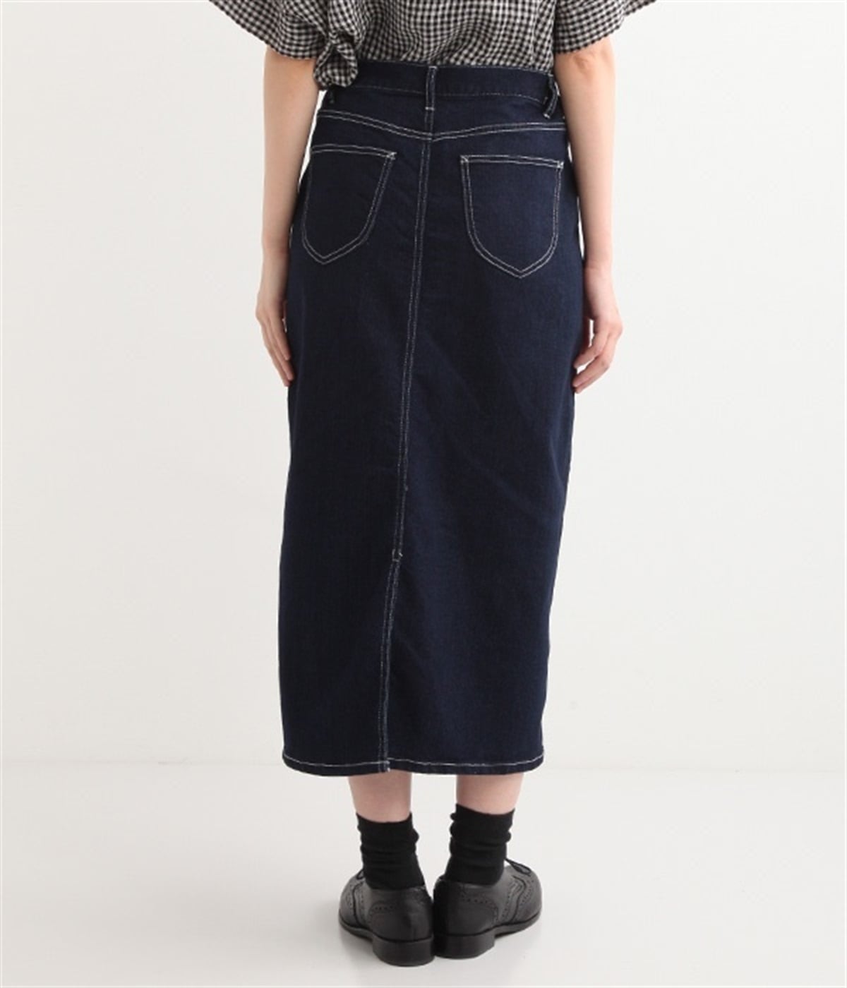 端切れを再利用して作った糸でできたリサイクルデニムが環境にも優しいデニムスカートです。カジュアルなデニムスカートも、バックスリットを入れることで抜け感と女性らしさをプラスしています。ストレッチが効いて履き心地が良い上に、足のラインを拾わないセミタイトなデザインでキレイに着こなせるのも嬉しいポイントです。