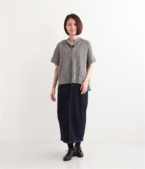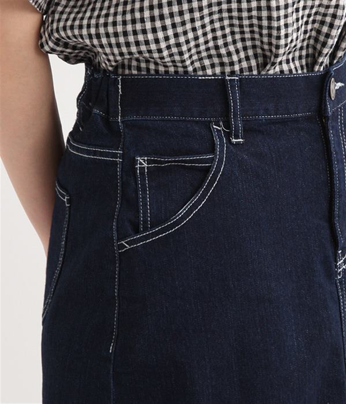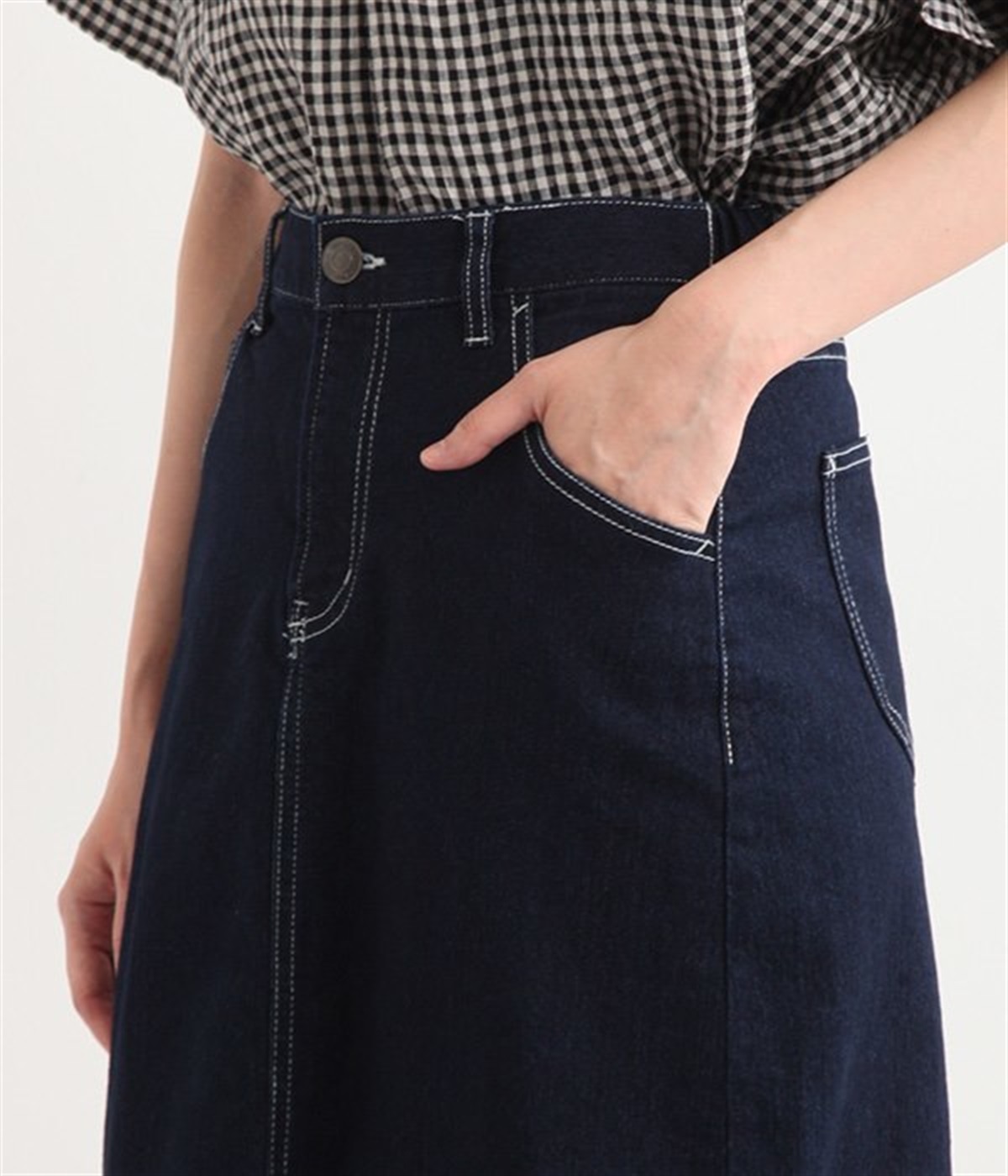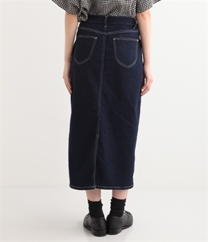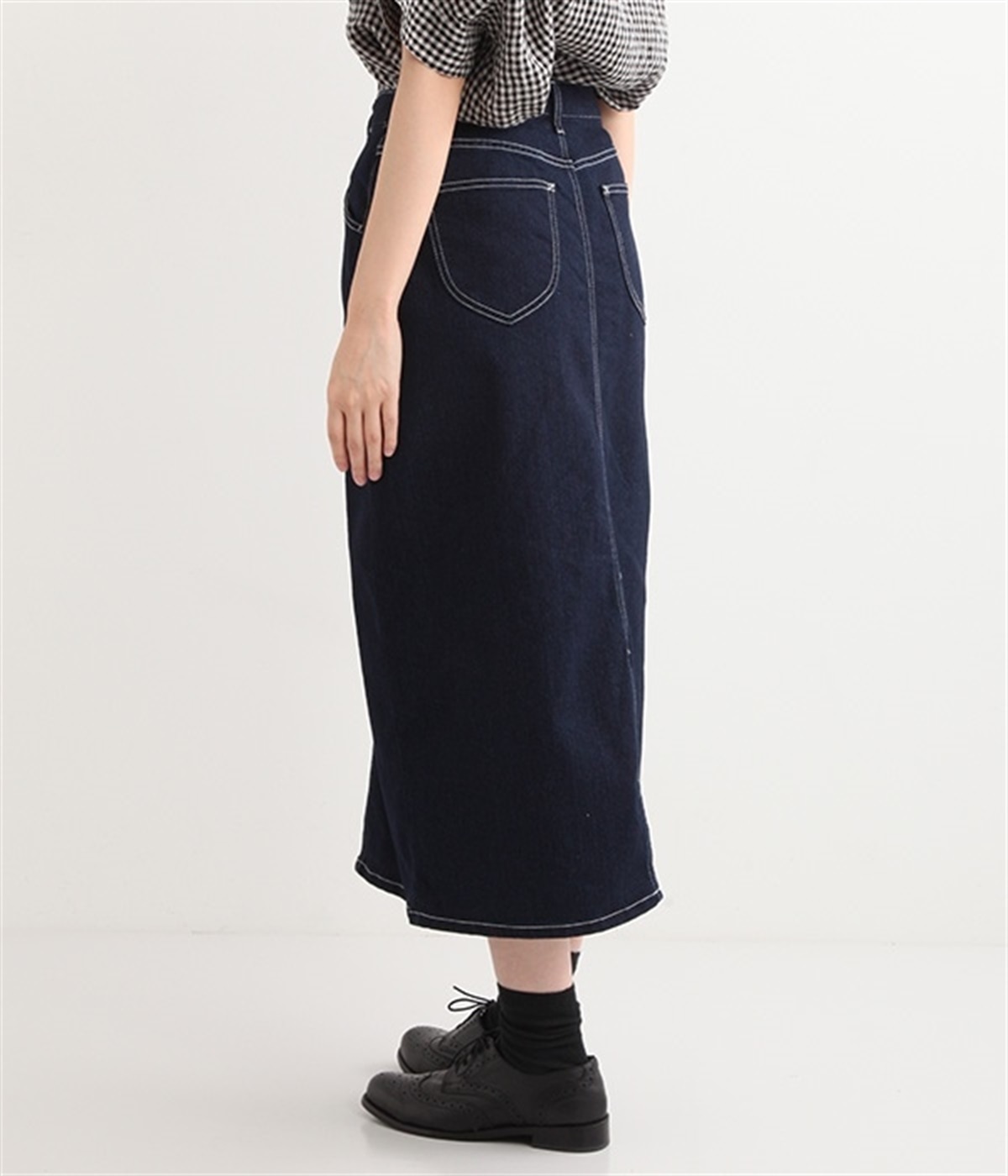 端切れを再利用して作った糸でできたリサイクルデニムが環境にも優しいデニムスカートです。カジュアルなデニムスカートも、バックスリットを入れることで抜け感と女性らしさをプラスしています。ストレッチが効いて履き心地が良い上に、足のラインを拾わないセミタイトなデザインでキレイに着こなせるのも嬉しいポイントです。