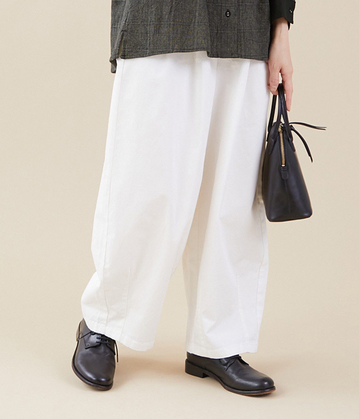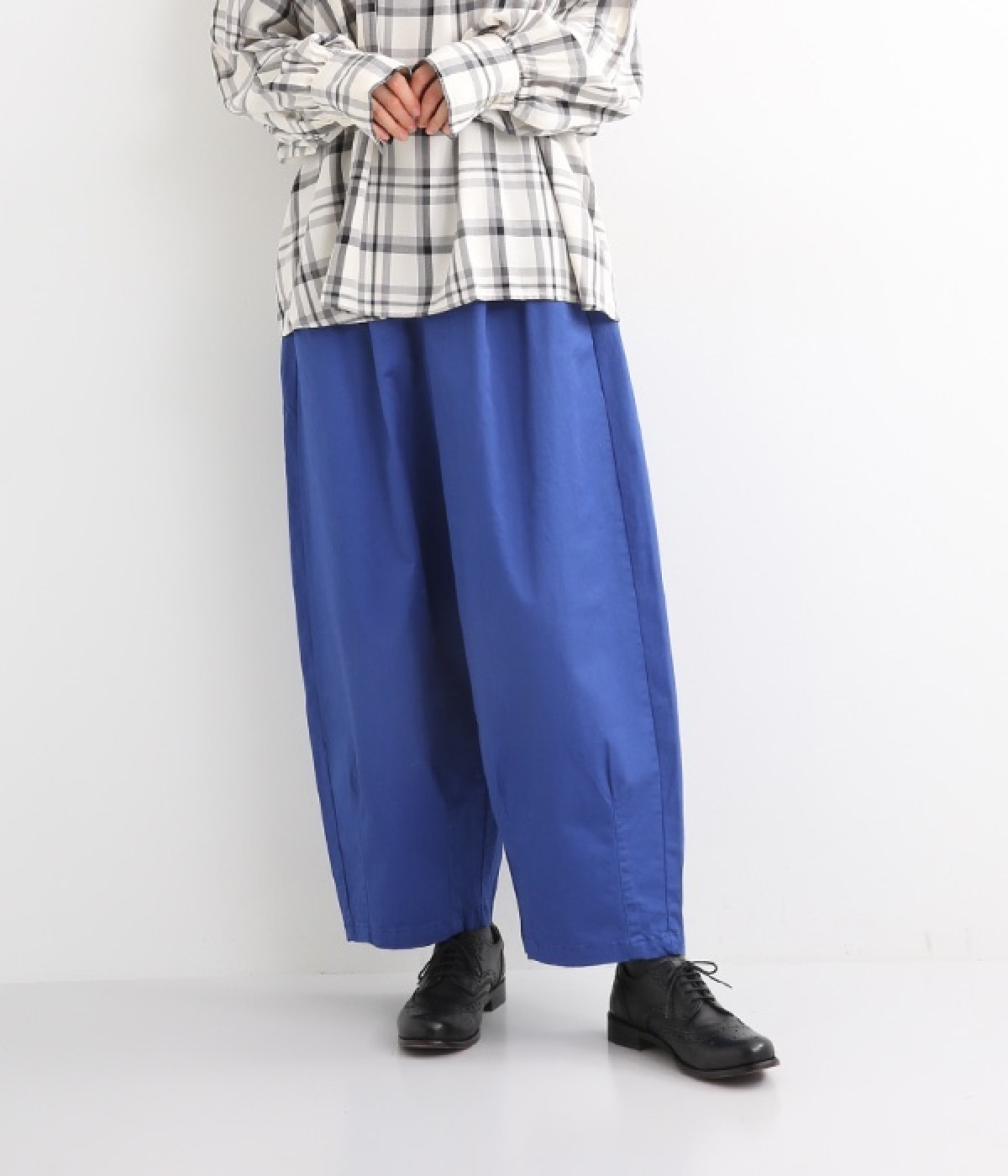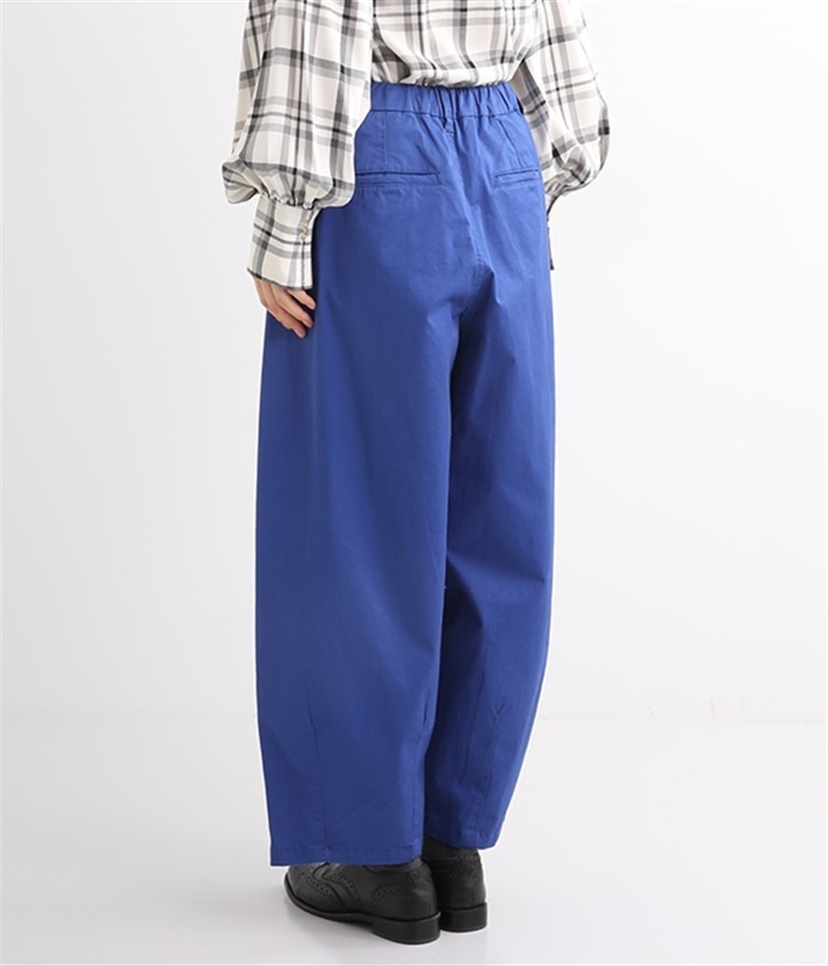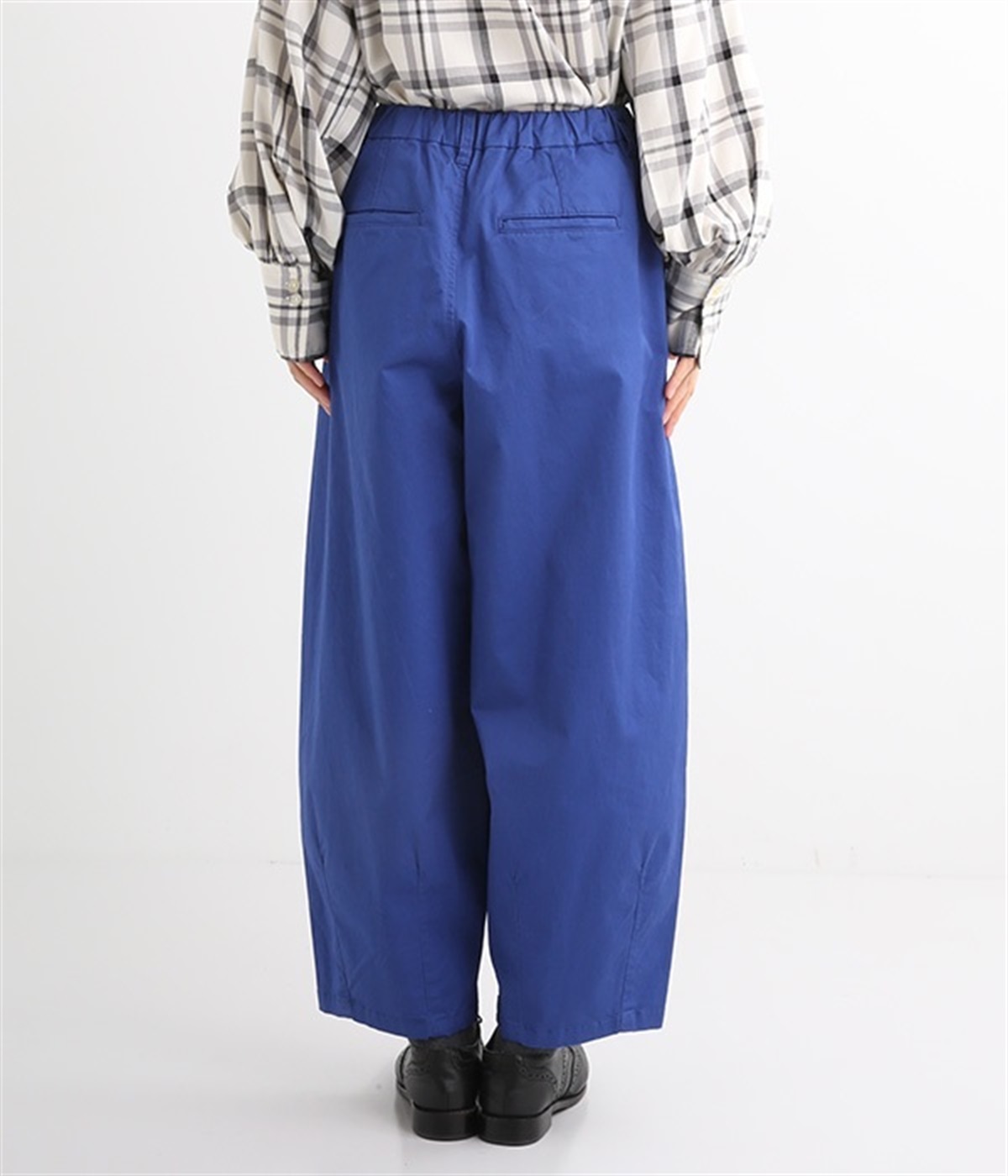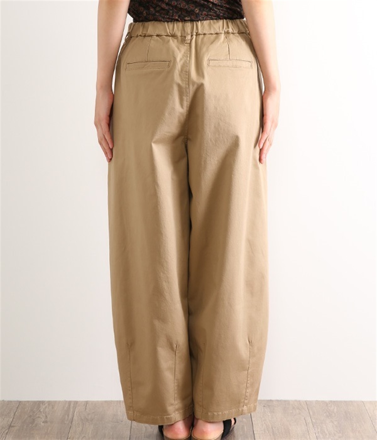 ワイドなボリューム感とテーパードのすっきり感をミックスしたバルーンシルエットのパンツです。より丸みを出すために入れた裾のダーツがワンポイントに。通常のバルーンシルエットよりやや細めに仕立てており、あらゆるトップスとのコーデもバランスが良くなるように仕上げています。ウエストは後ろ部分のみゴム仕様です。両サイド、バックにポケット付き。