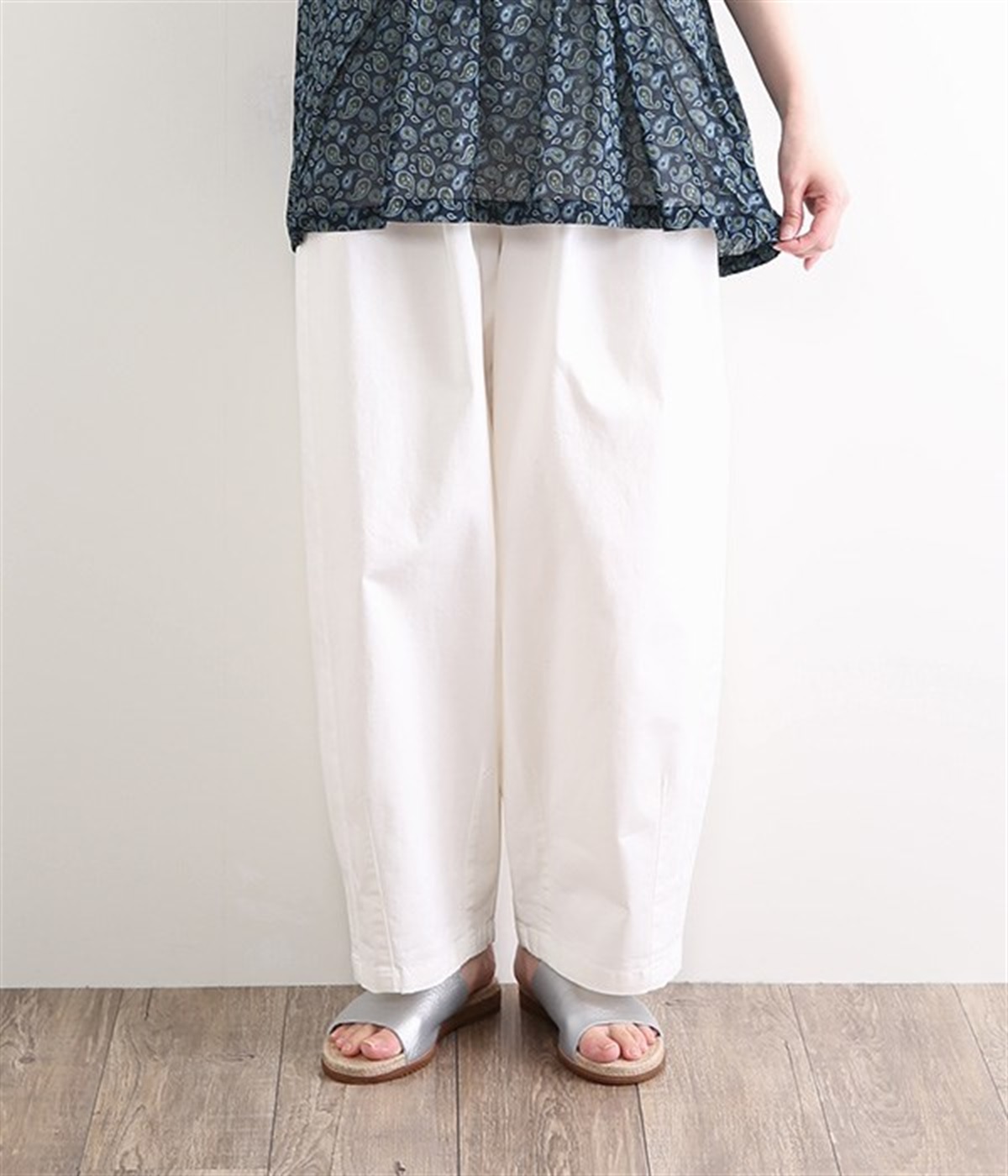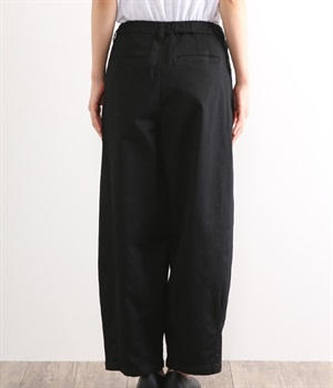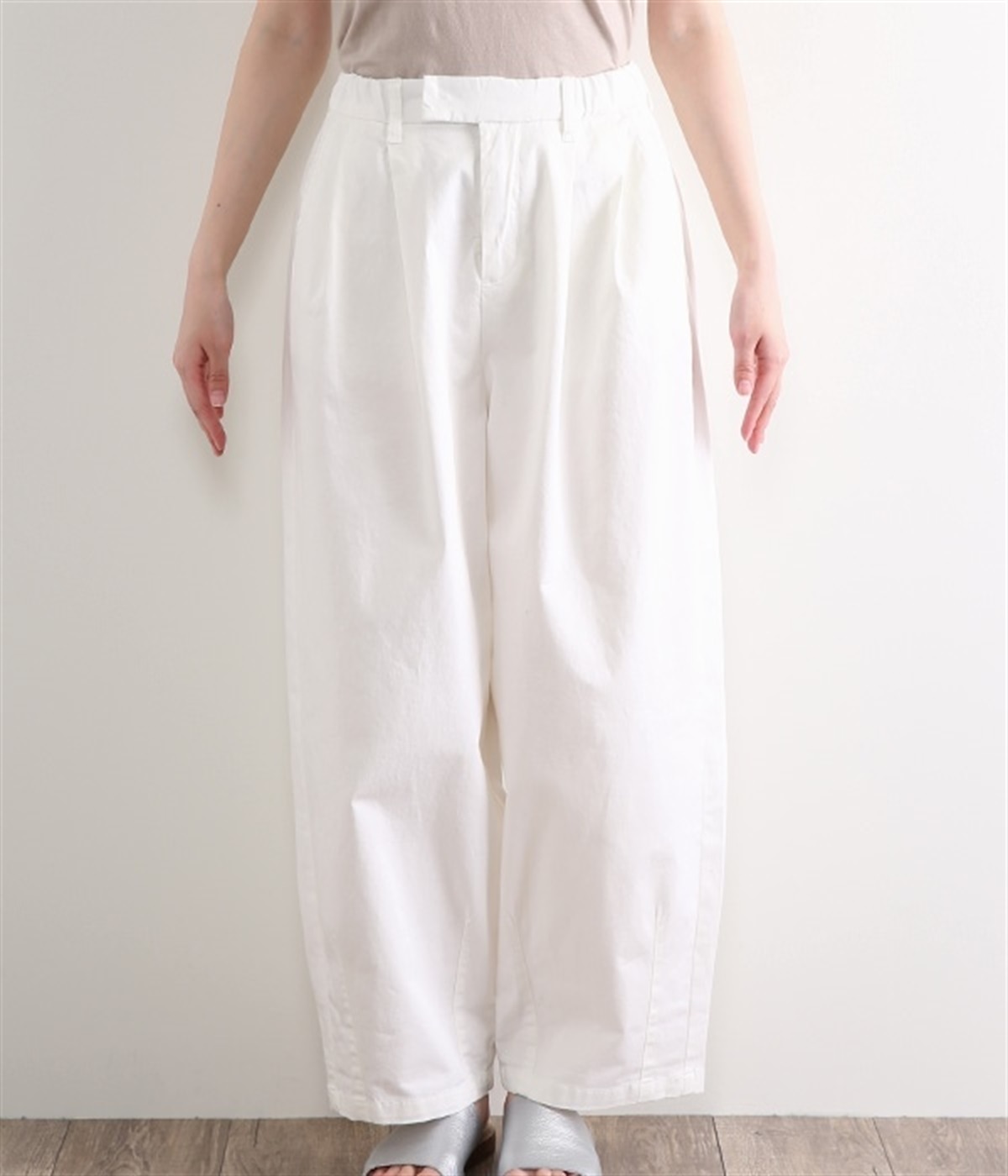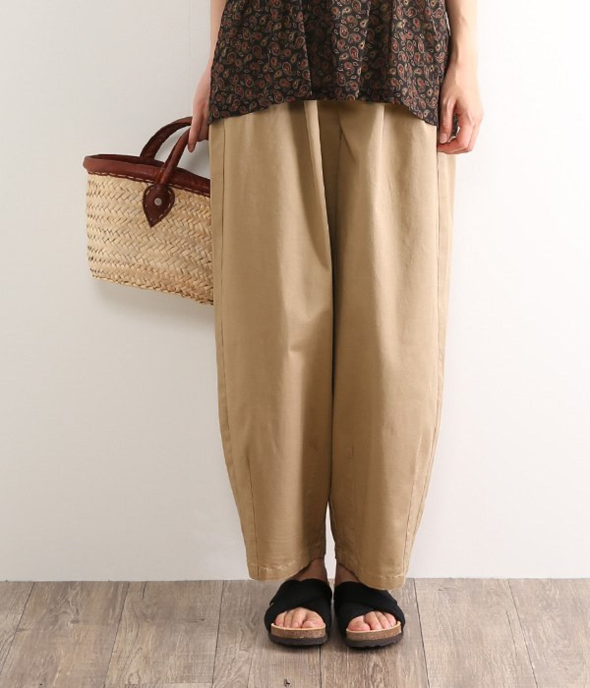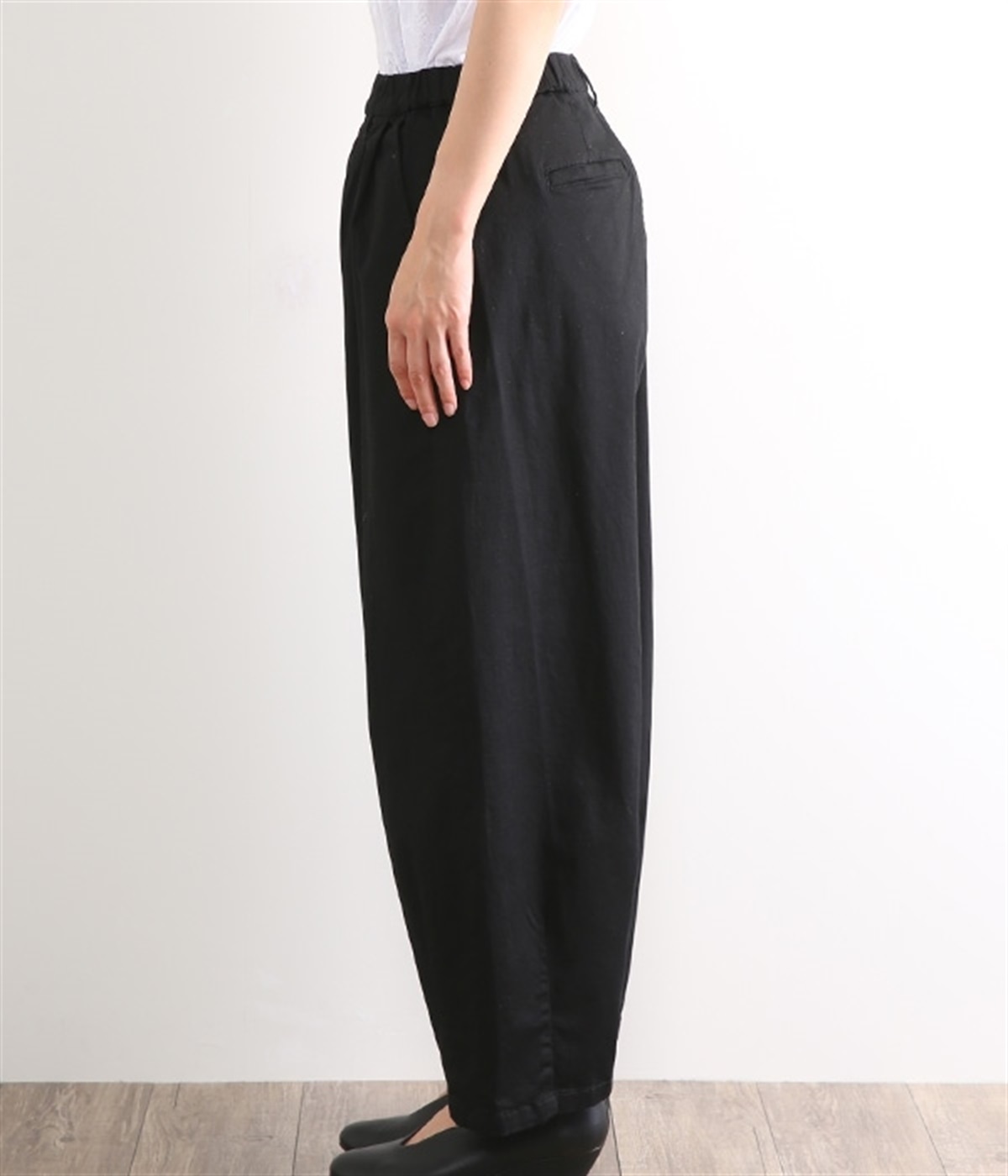 ワイドなボリューム感とテーパードのすっきり感をミックスしたバルーンシルエットのパンツです。より丸みを出すために入れた裾のダーツがワンポイントに。通常のバルーンシルエットよりやや細めに仕立てており、あらゆるトップスとのコーデもバランスが良くなるように仕上げています。ウエストは後ろ部分のみゴム仕様です。両サイド、バックにポケット付き。