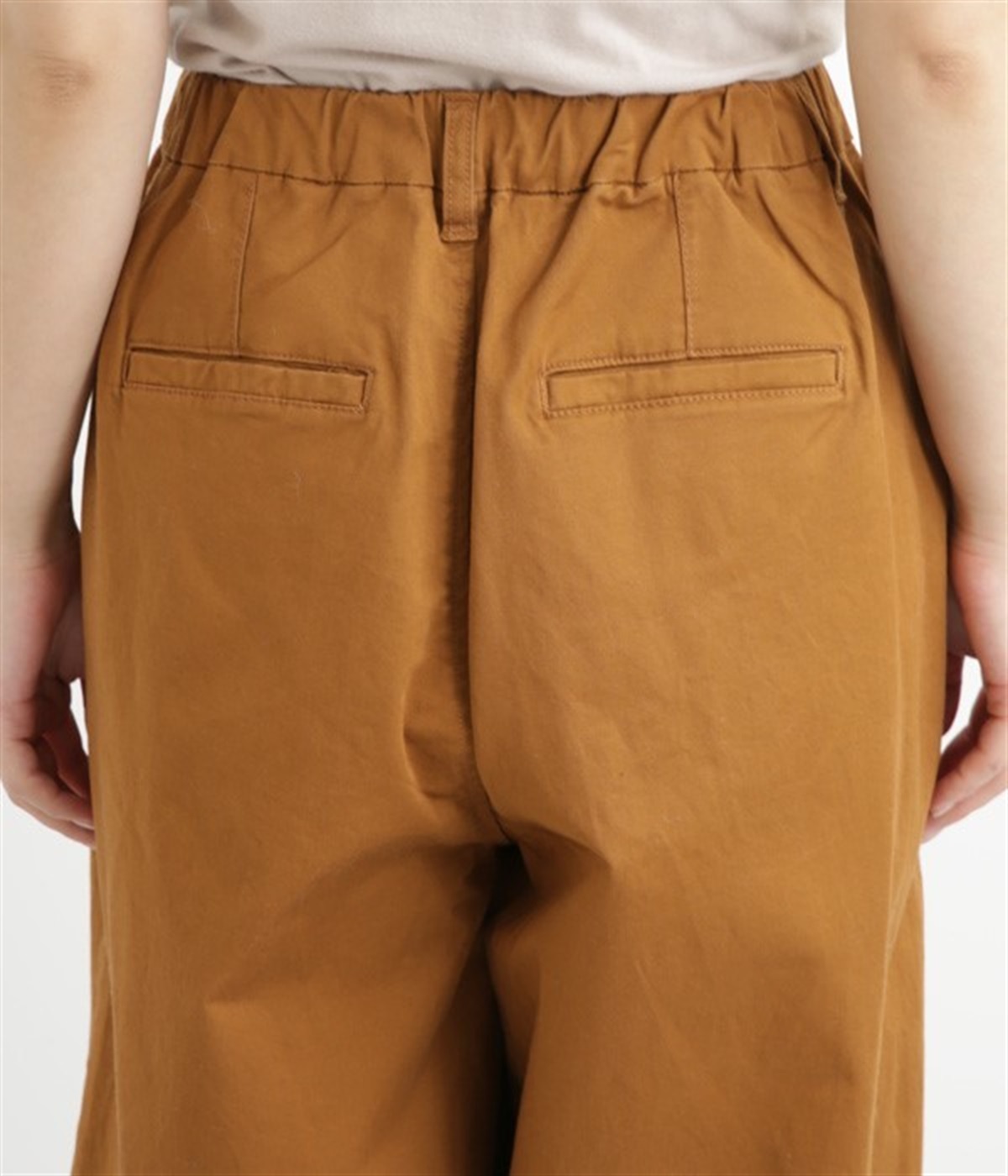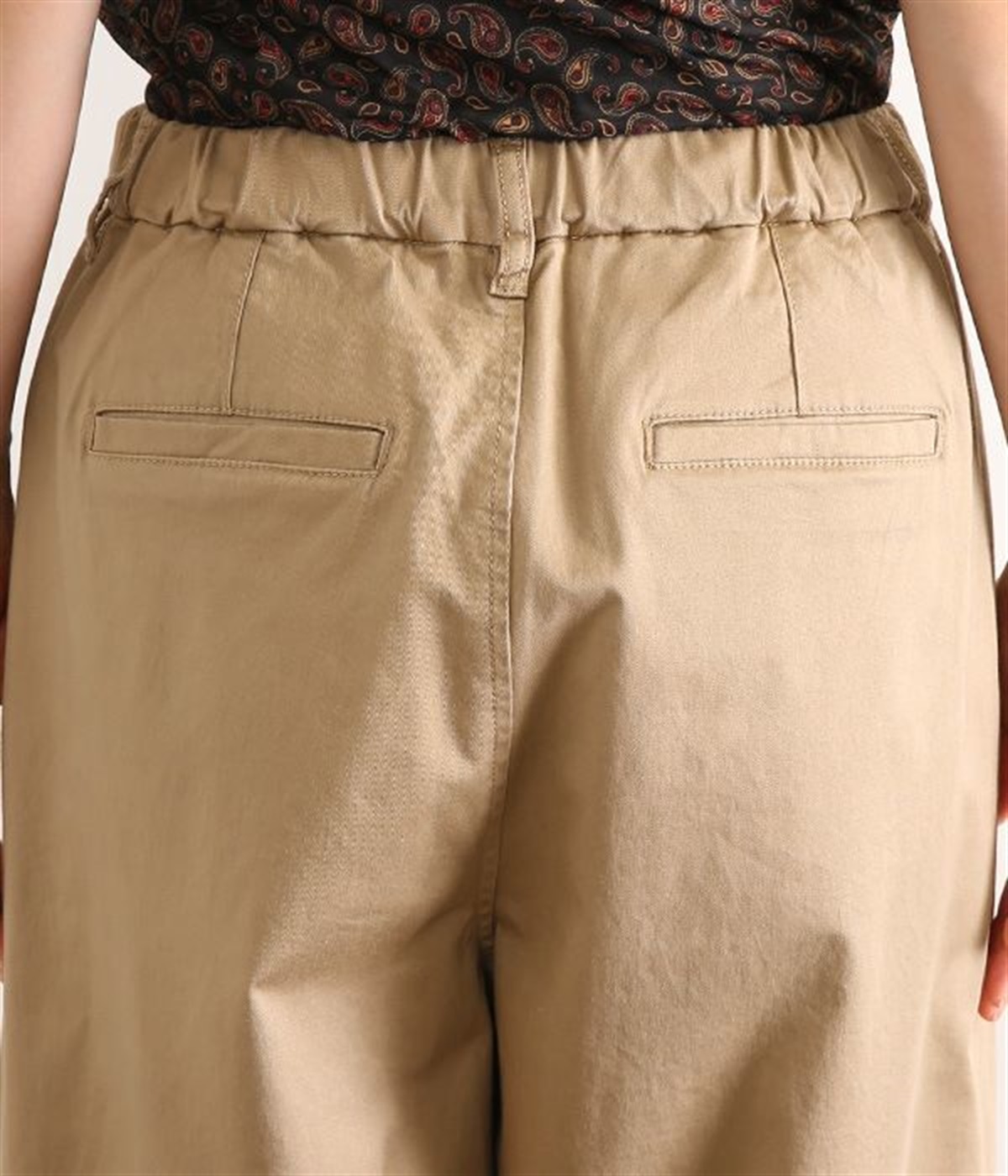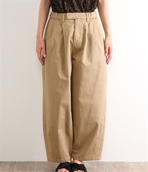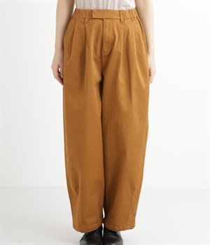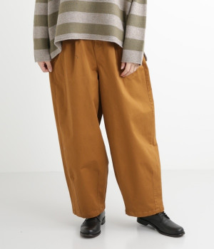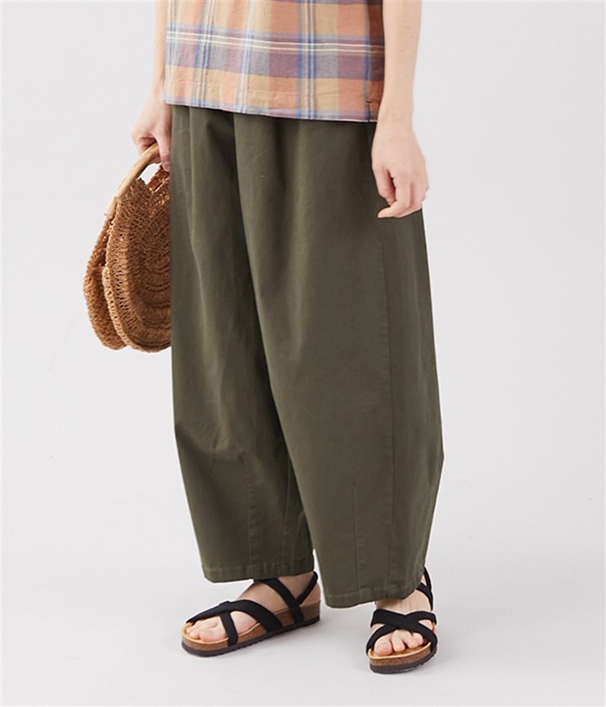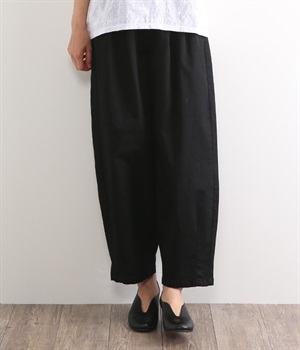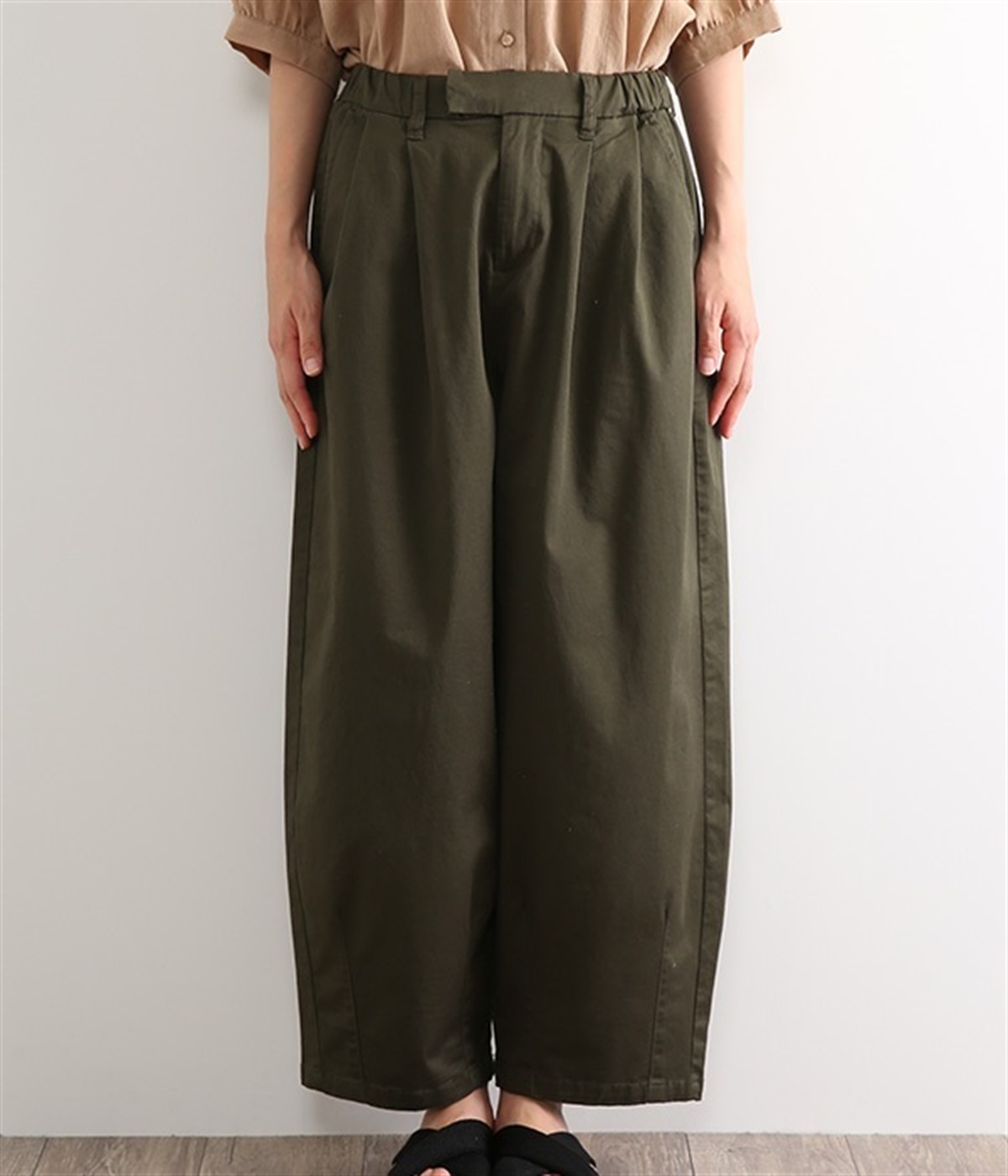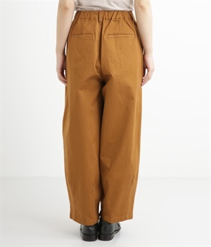 ワイドなボリューム感とテーパードのすっきり感をミックスしたバルーンシルエットのパンツです。より丸みを出すために入れた裾のダーツがワンポイントに。通常のバルーンシルエットよりやや細めに仕立てており、あらゆるトップスとのコーデもバランスが良くなるように仕上げています。ウエストは後ろ部分のみゴム仕様です。両サイド、バックにポケット付き。