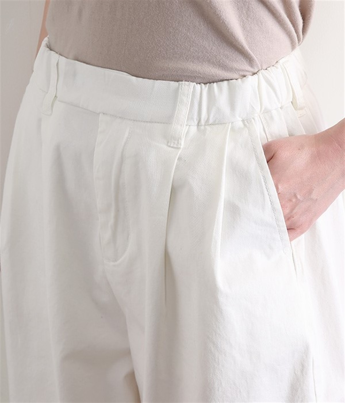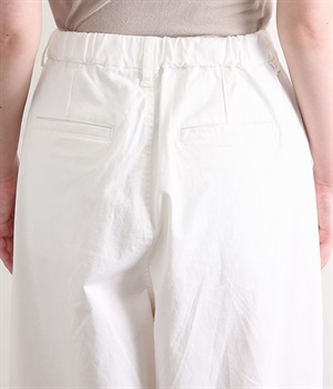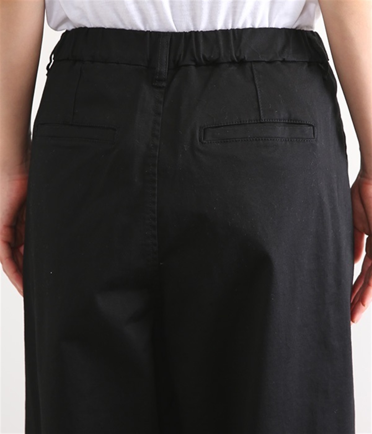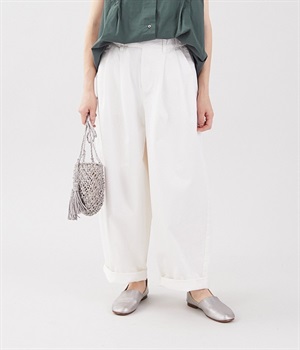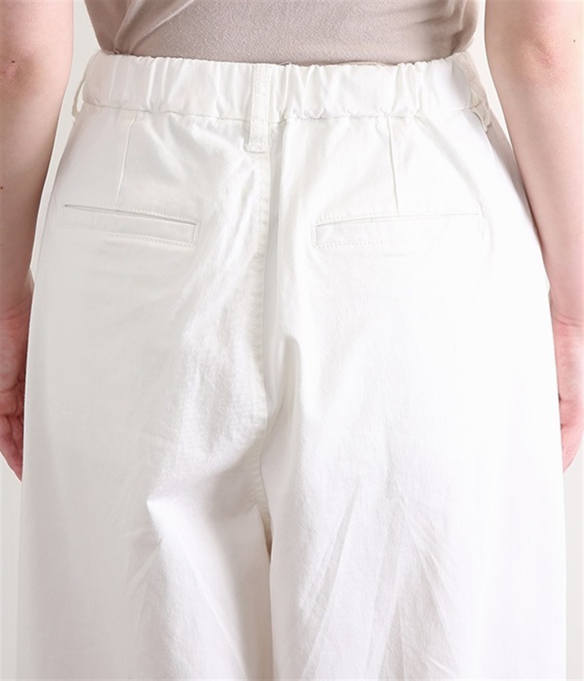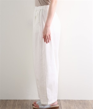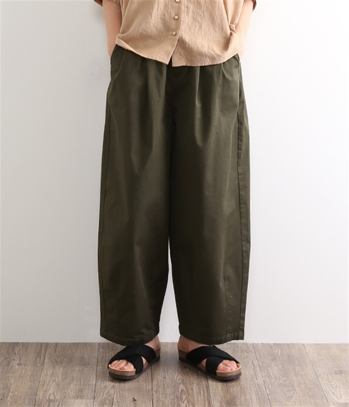 ワイドなボリューム感とテーパードのすっきり感をミックスしたバルーンシルエットのパンツです。より丸みを出すために入れた裾のダーツがワンポイントに。通常のバルーンシルエットよりやや細めに仕立てており、あらゆるトップスとのコーデもバランスが良くなるように仕上げています。ウエストは後ろ部分のみゴム仕様です。両サイド、バックにポケット付き。