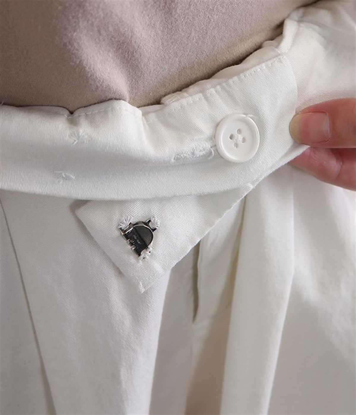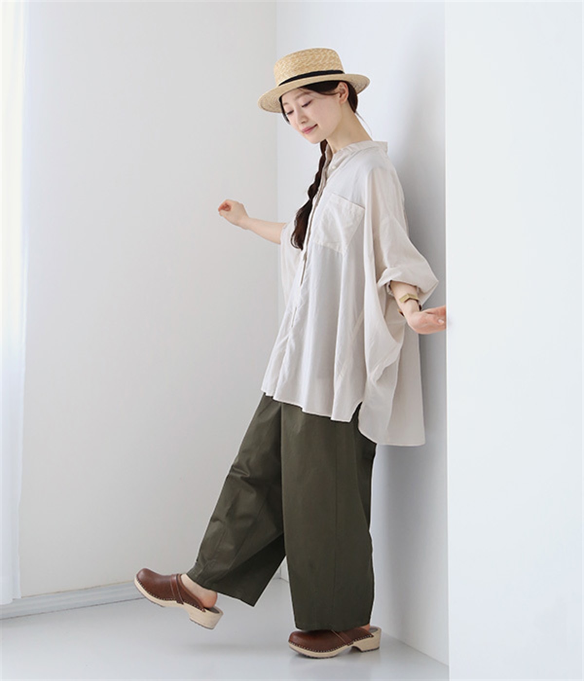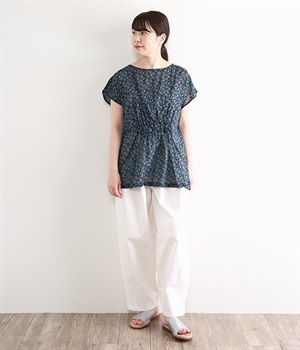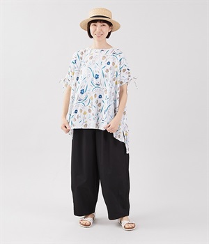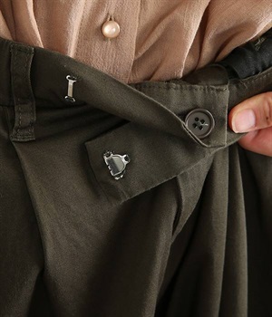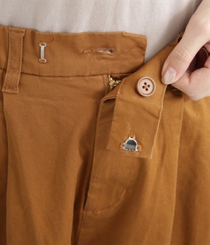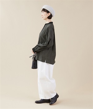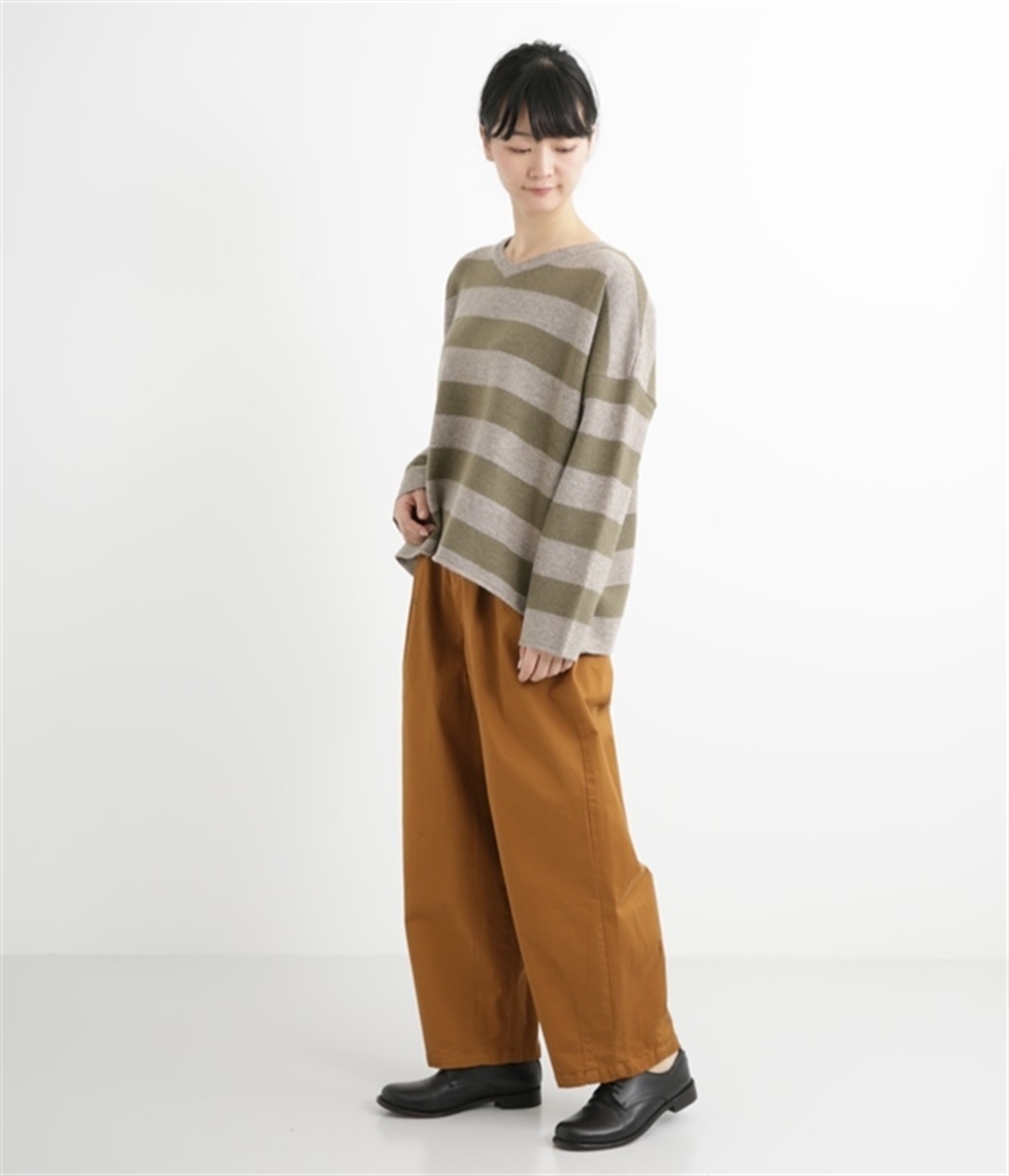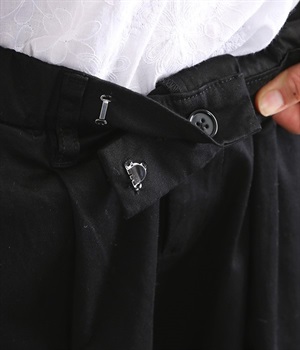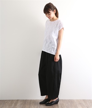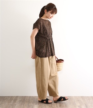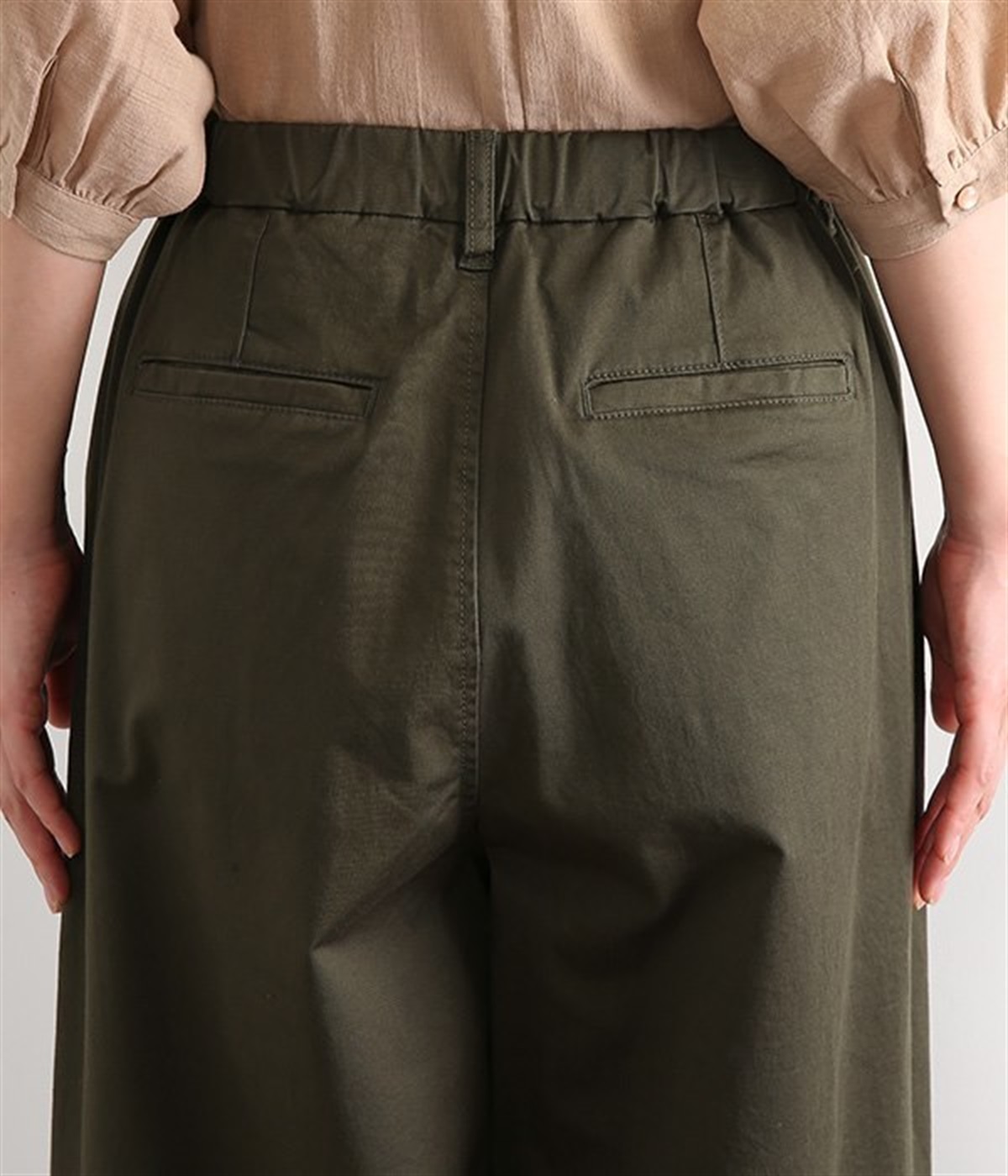 ワイドなボリューム感とテーパードのすっきり感をミックスしたバルーンシルエットのパンツです。より丸みを出すために入れた裾のダーツがワンポイントに。通常のバルーンシルエットよりやや細めに仕立てており、あらゆるトップスとのコーデもバランスが良くなるように仕上げています。ウエストは後ろ部分のみゴム仕様です。両サイド、バックにポケット付き。