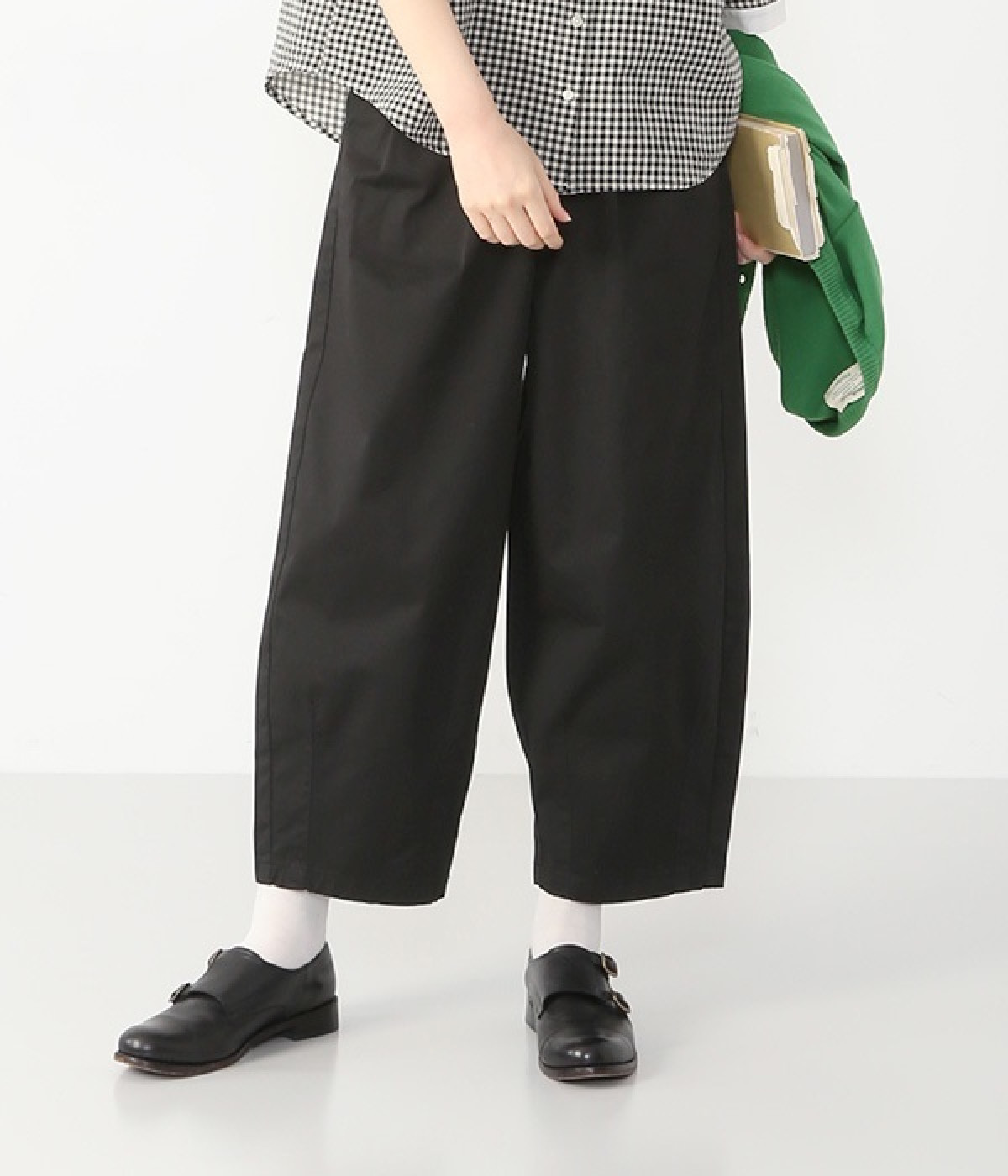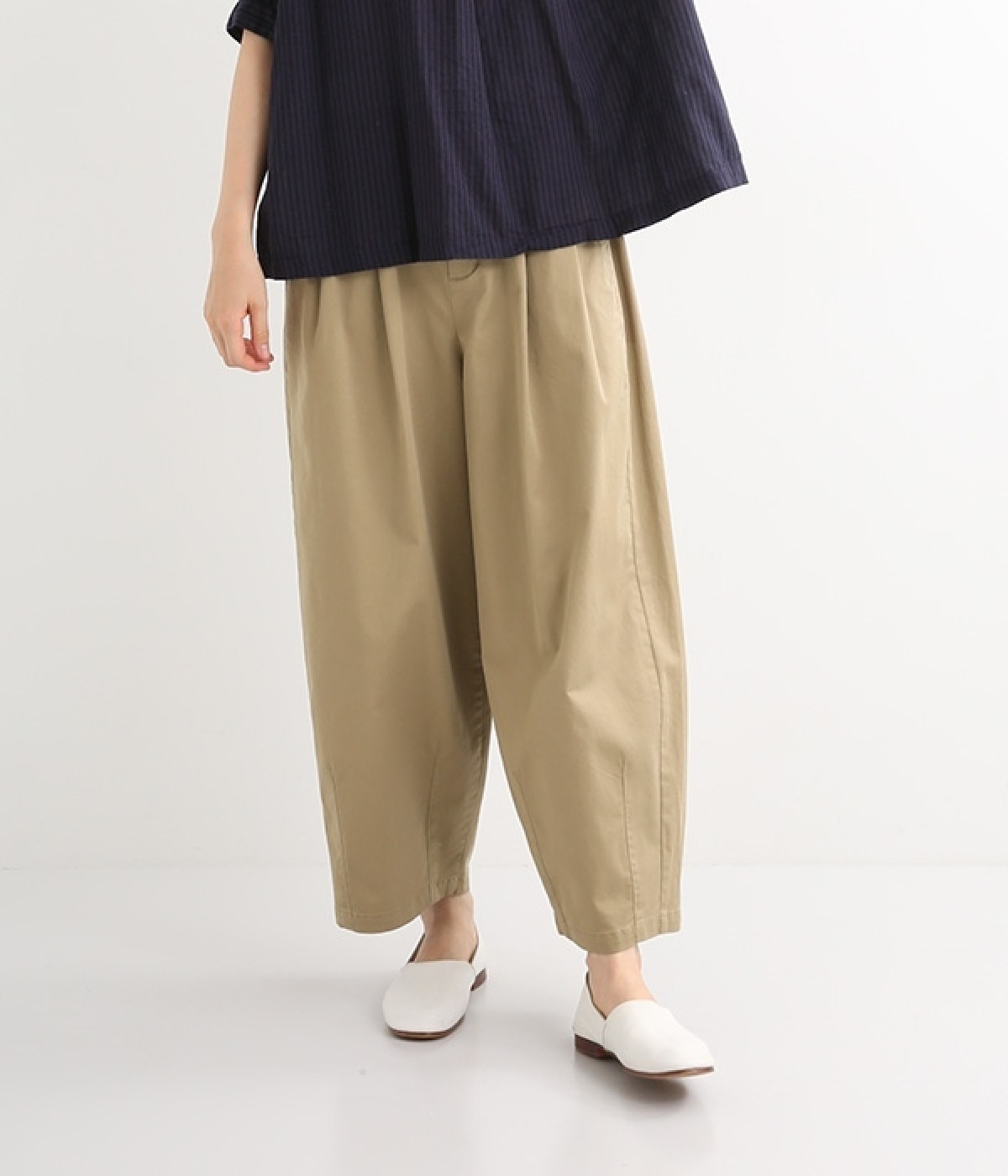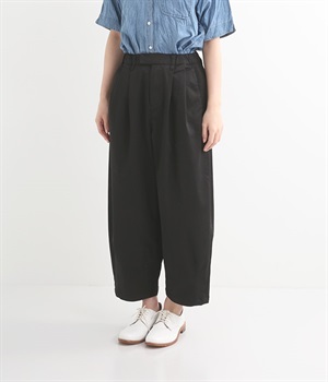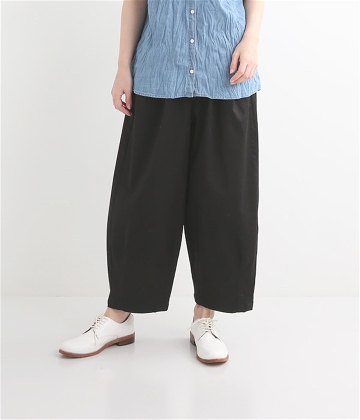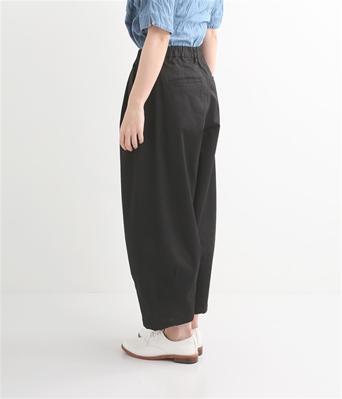 ワイドシルエットにテーパードラインをミックスした、バルーン調のデニムパンツです。より丸みを出すために裾にダーツを施し、きれいな立体感を表現しました。通常のバルーンパンツよりも少し細めに仕上げているので、さまざまなトップスとバランスよくコーディネートできます。フロントはファスナー開閉できちんと感を出し、後ろ側はゴム仕様で快適なはき心地です。