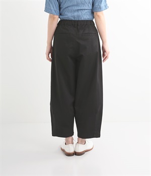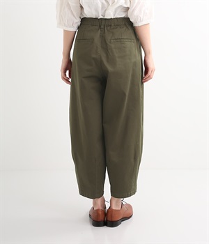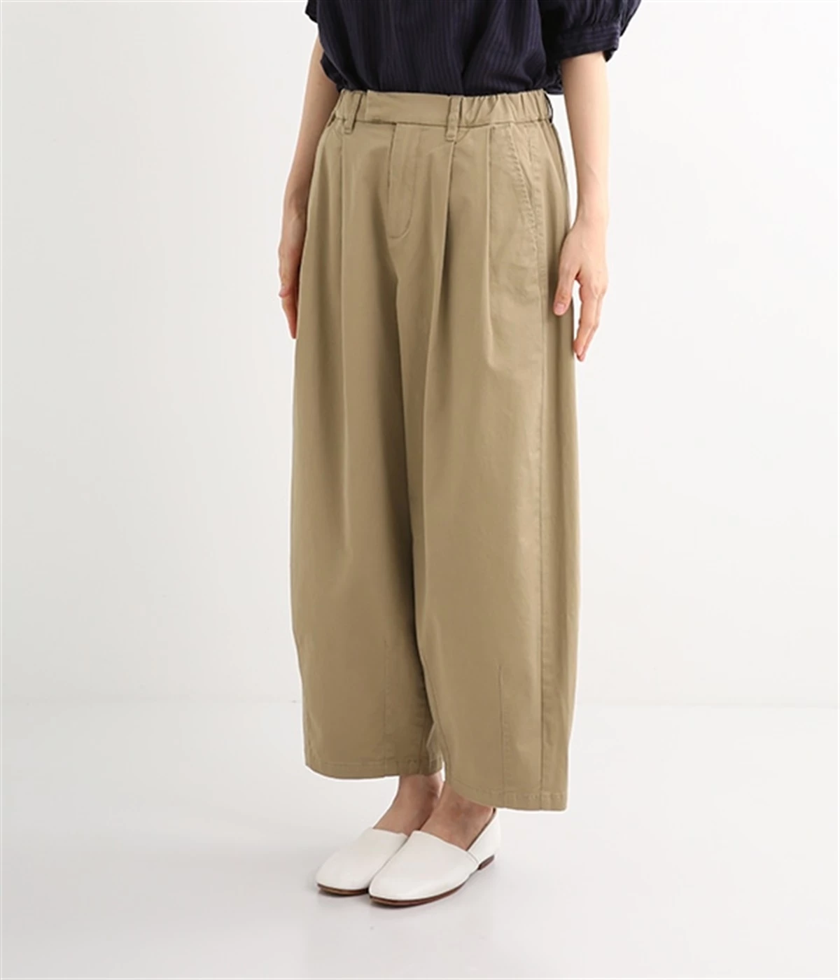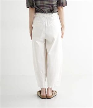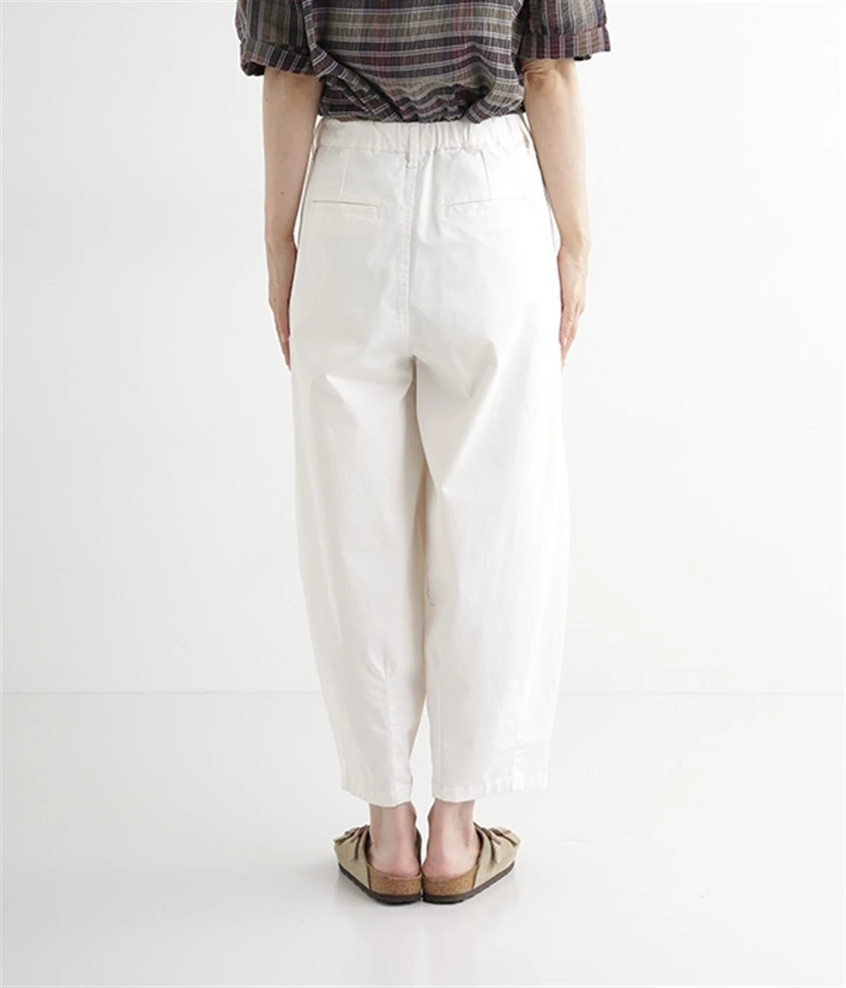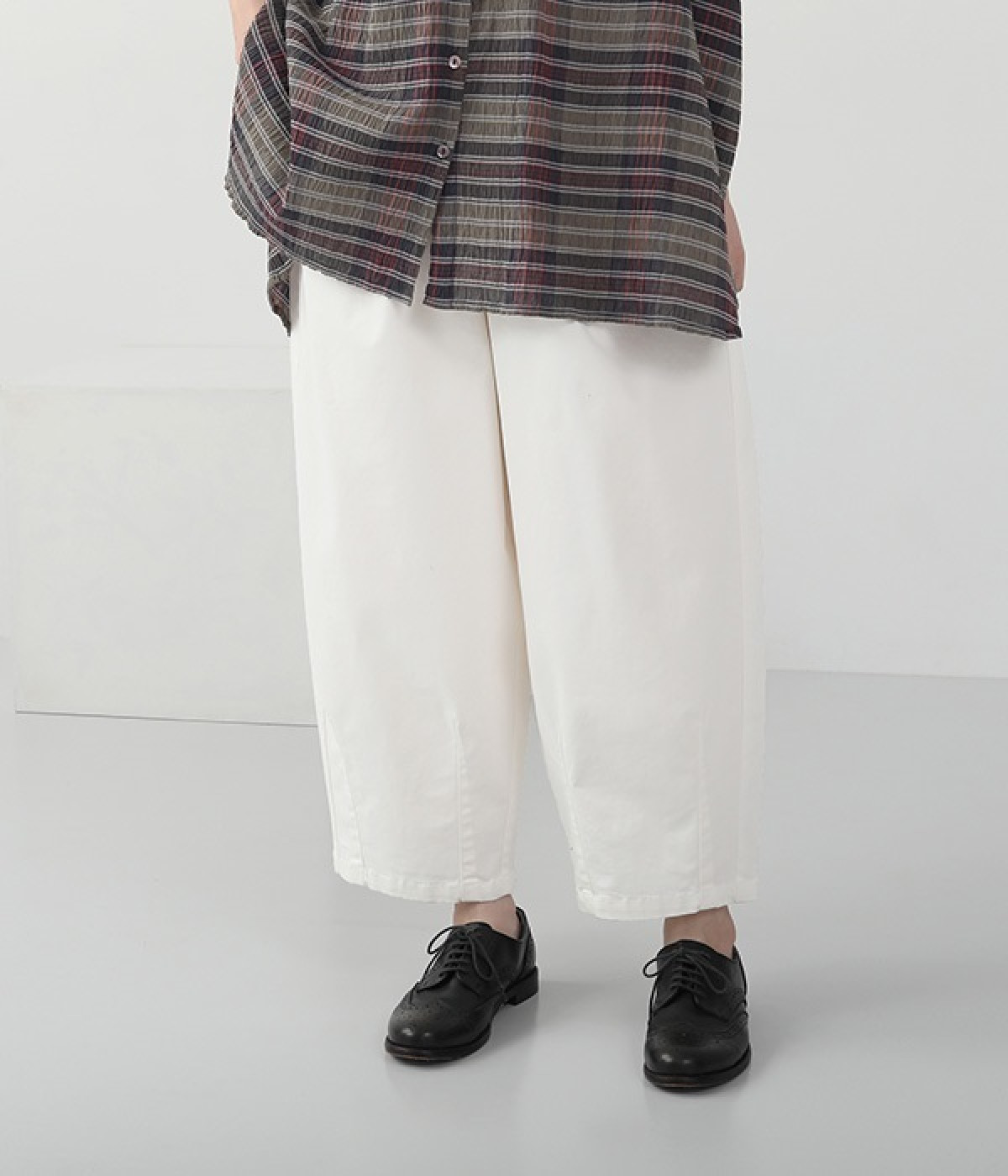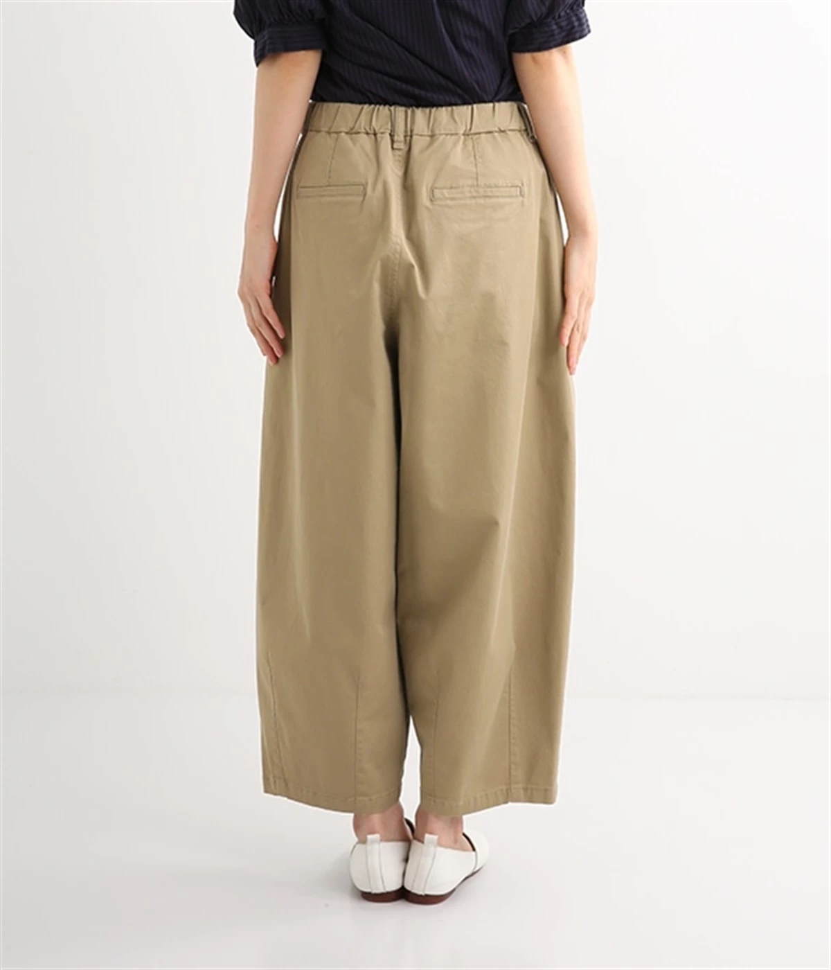 ワイドシルエットにテーパードラインをミックスした、バルーン調のデニムパンツです。より丸みを出すために裾にダーツを施し、きれいな立体感を表現しました。通常のバルーンパンツよりも少し細めに仕上げているので、さまざまなトップスとバランスよくコーディネートできます。フロントはファスナー開閉できちんと感を出し、後ろ側はゴム仕様で快適なはき心地です。