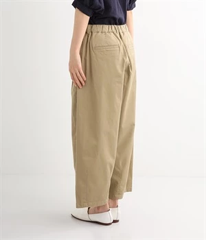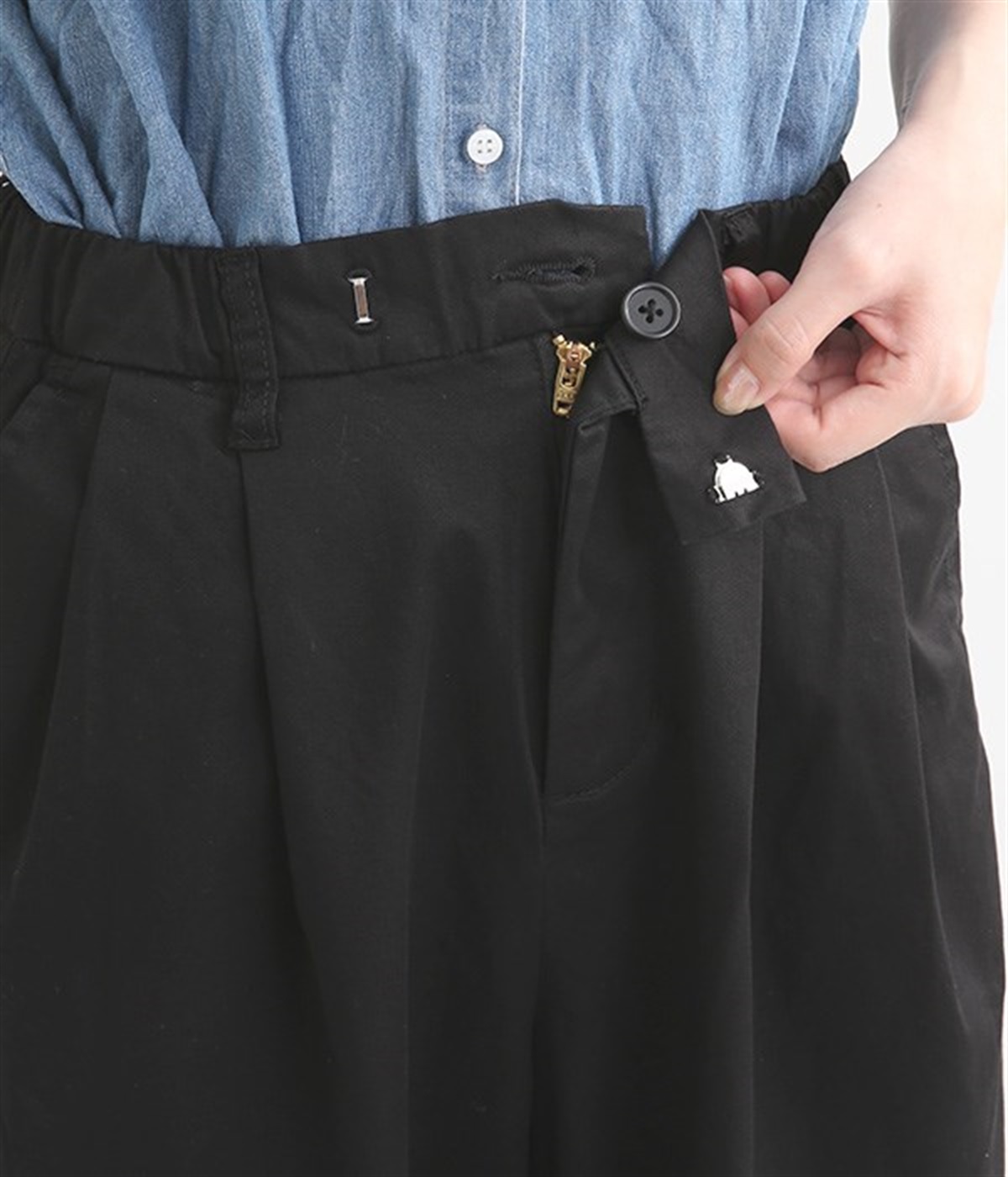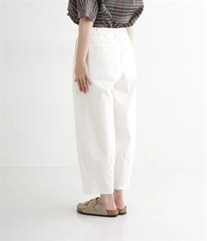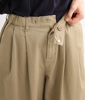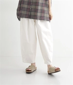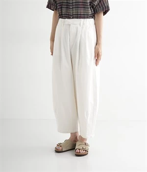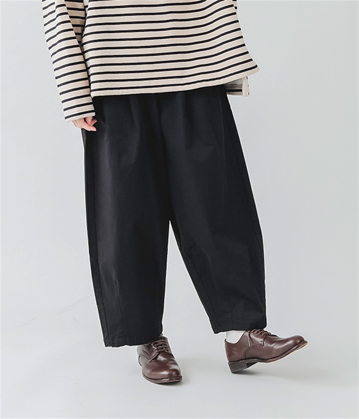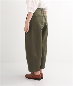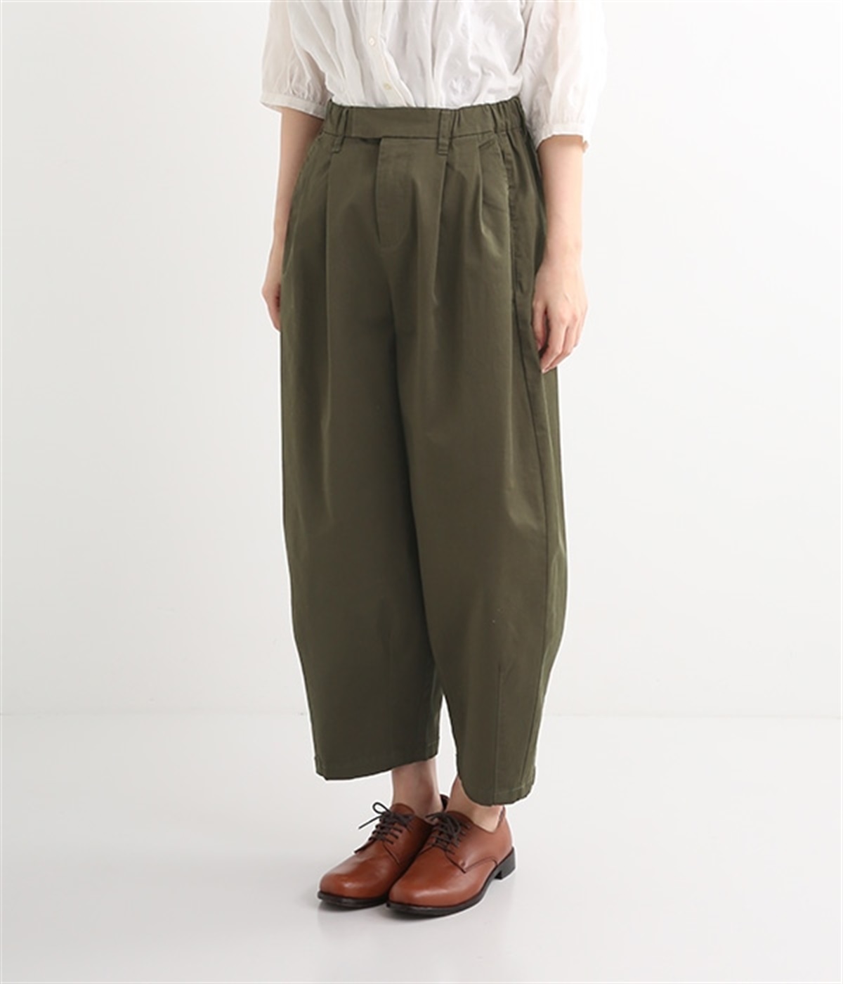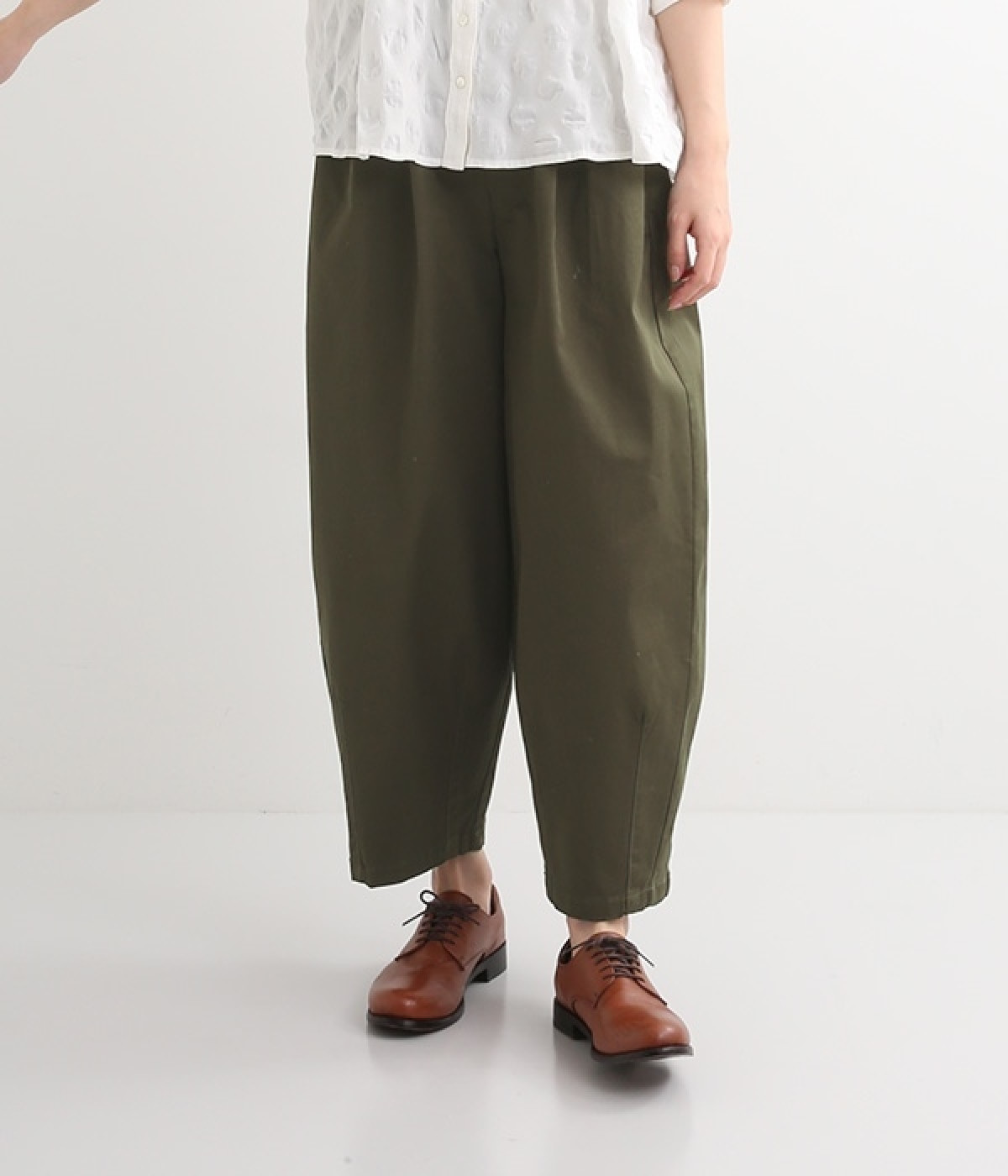 ワイドシルエットにテーパードラインをミックスした、バルーン調のデニムパンツです。より丸みを出すために裾にダーツを施し、きれいな立体感を表現しました。通常のバルーンパンツよりも少し細めに仕上げているので、さまざまなトップスとバランスよくコーディネートできます。フロントはファスナー開閉できちんと感を出し、後ろ側はゴム仕様で快適なはき心地です。
