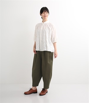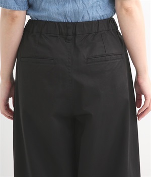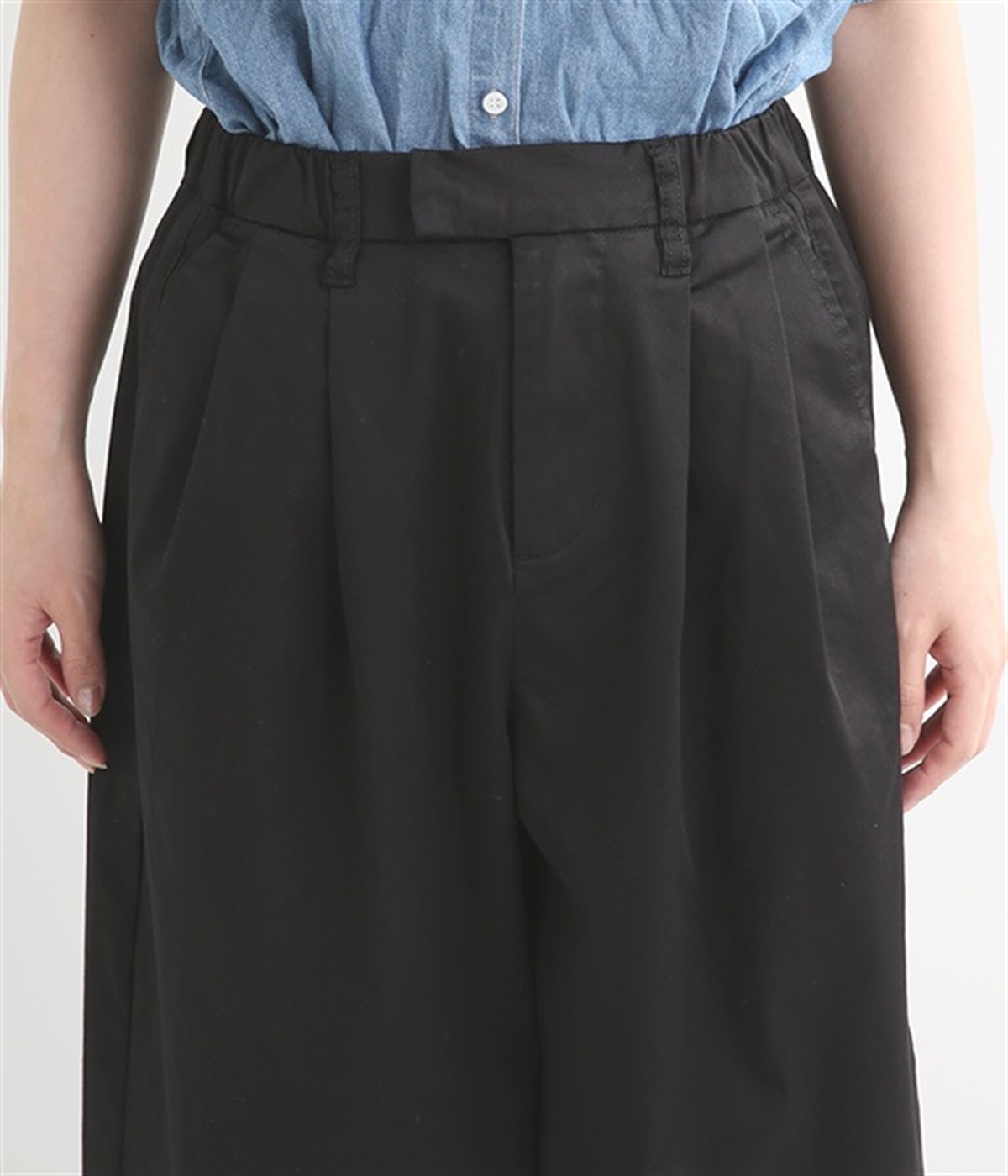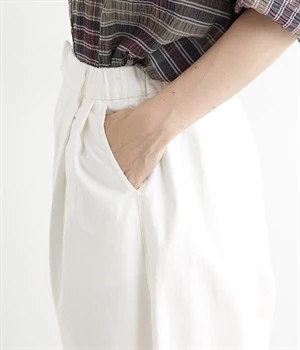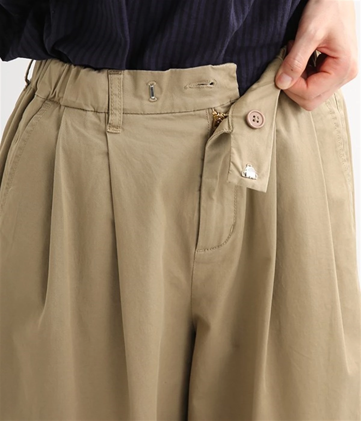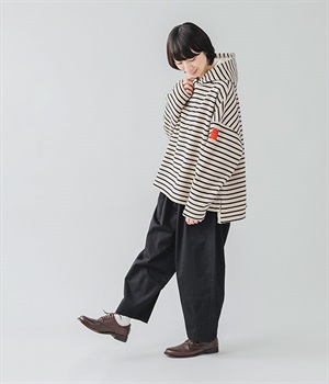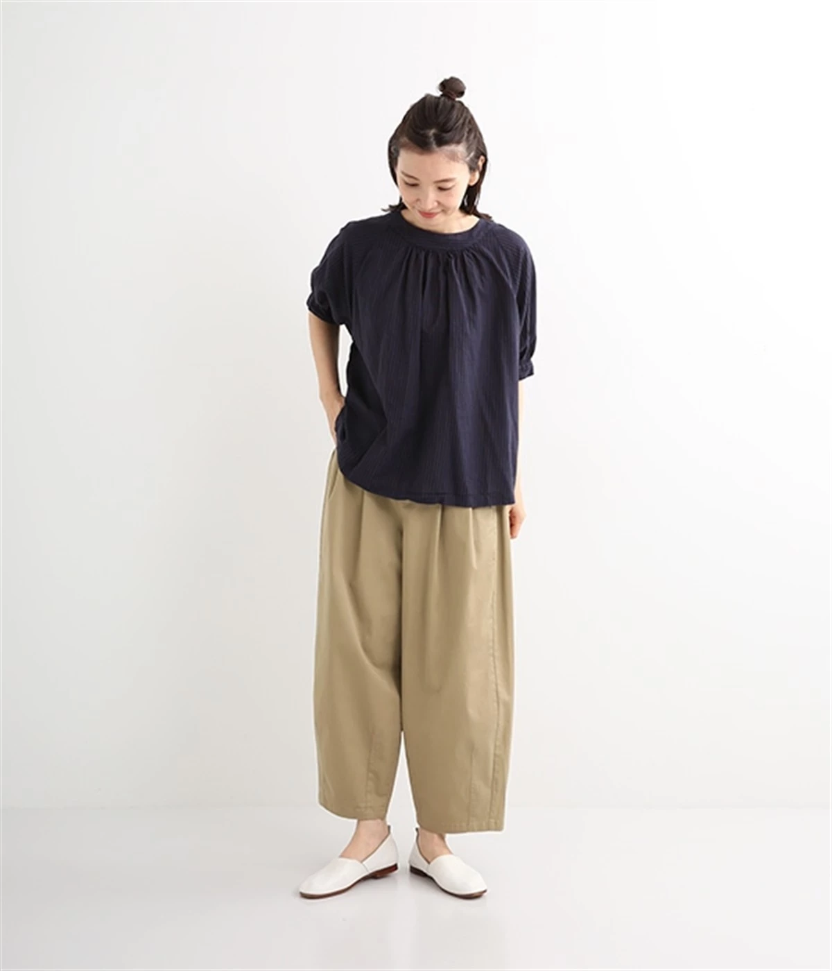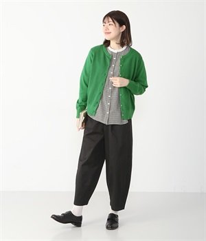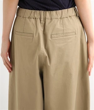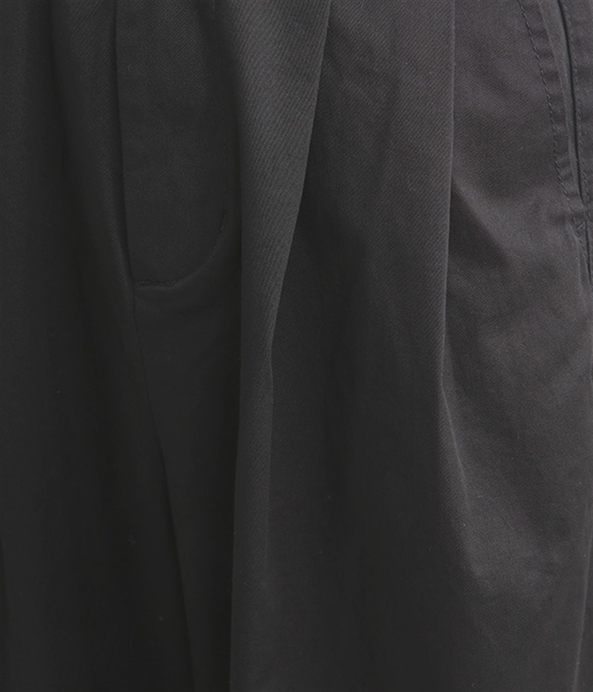 ワイドシルエットにテーパードラインをミックスした、バルーン調のデニムパンツです。より丸みを出すために裾にダーツを施し、きれいな立体感を表現しました。通常のバルーンパンツよりも少し細めに仕上げているので、さまざまなトップスとバランスよくコーディネートできます。フロントはファスナー開閉できちんと感を出し、後ろ側はゴム仕様で快適なはき心地です。