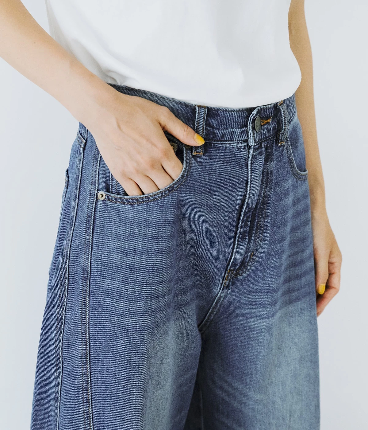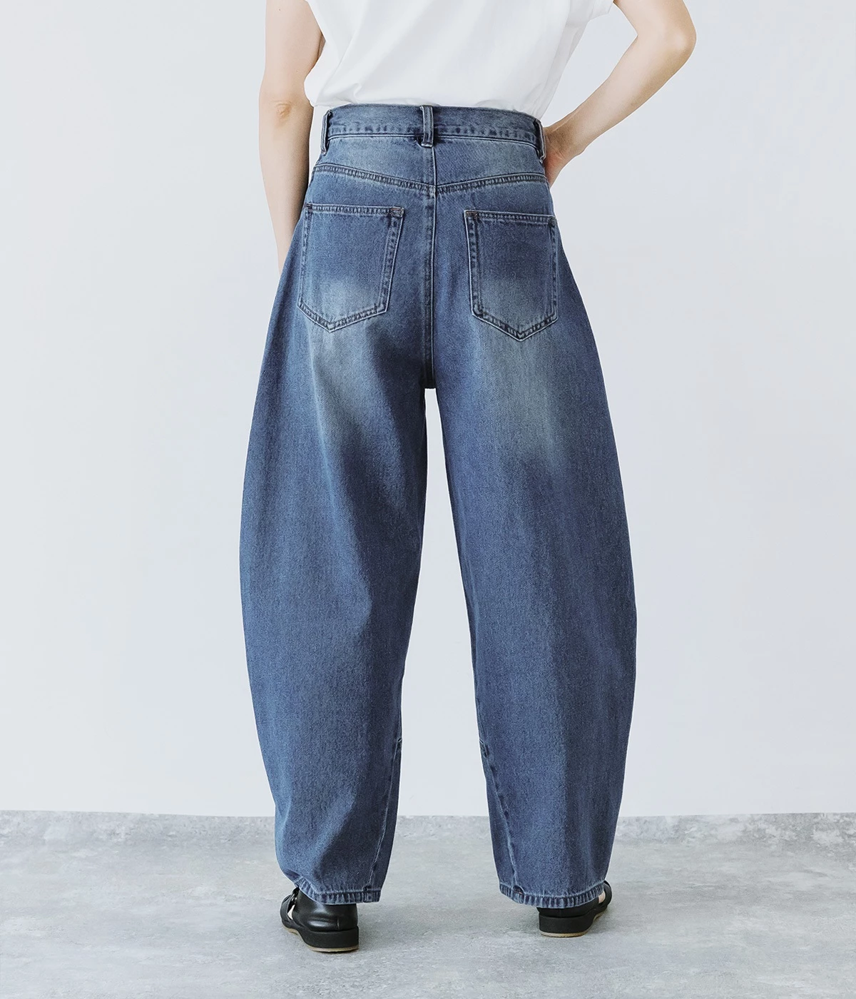 シンプルなTシャツ合わせに、ほどよいエッジを効かせられる<ヴィンテージネイビー>のバルーンデニムパンツ。いつものトップスも、ちょっとひと癖デザインのあるデニムを合わせるだけでおしゃれ度がぐっと上がります。