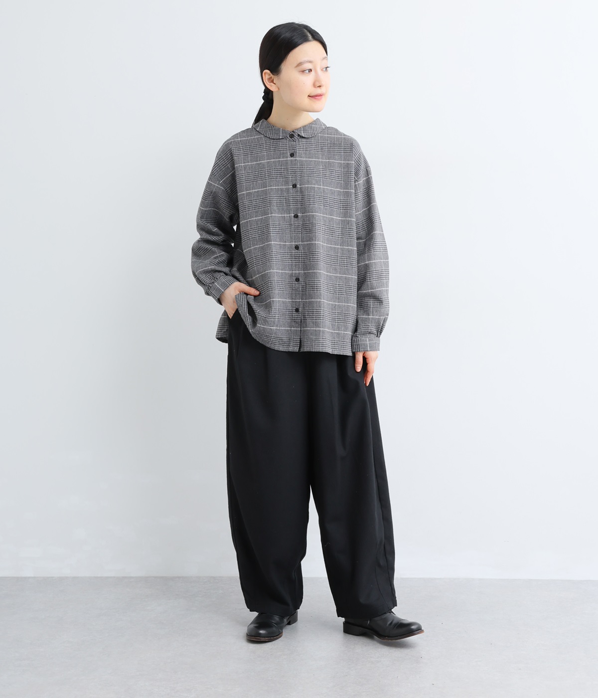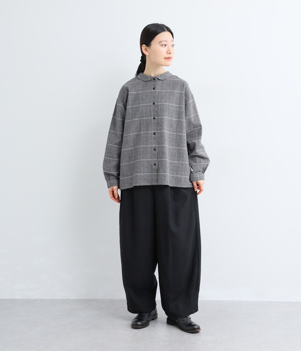 前ウエストにタックを、裾にダーツを入れて丸みのある立体的なボリュームシルエットに仕上げたサーカスパンツ。体のラインをカバーしつつ、ボトムスを主役にしたおしゃれなスタイルを叶えてくれます。ウエストは後ろのみゴム仕様で、前はすっきりとしたファスナー仕様です。