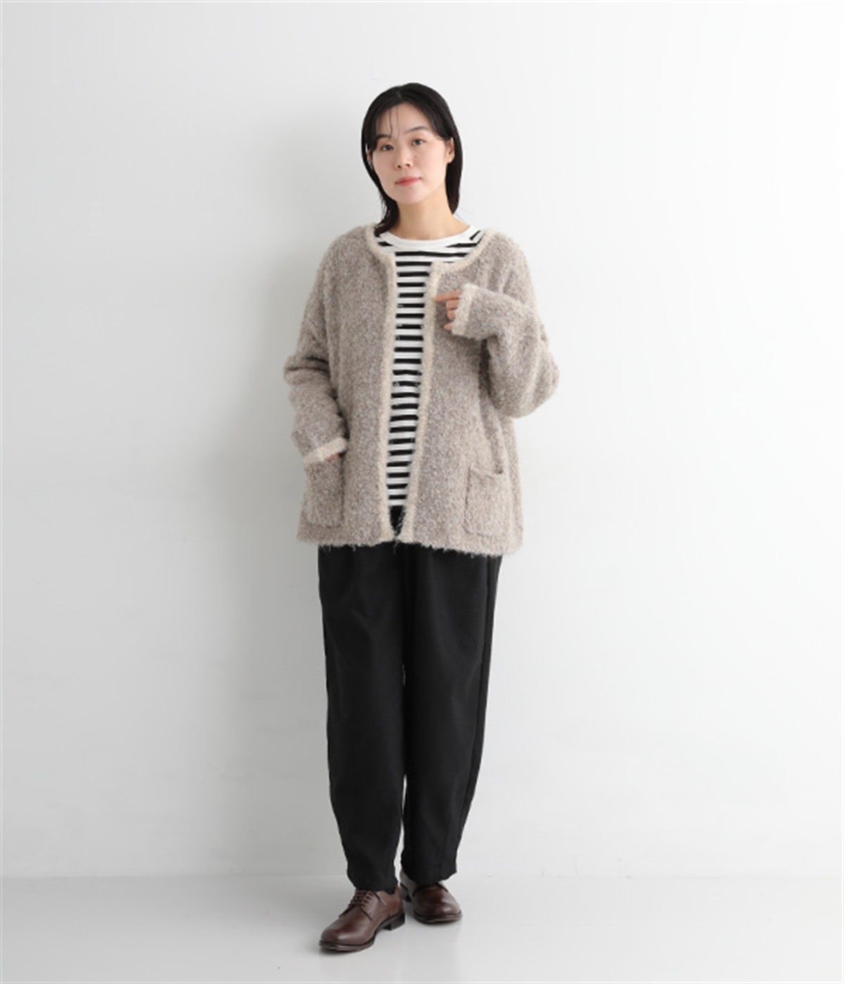 見た目にもあたたかみを感じるふっくらとした起毛感と、やわらかな風合いが魅力のライトメルトン生地を使用。滑りのよいさらりとした裏地をつけて、着用感をアップさせています。