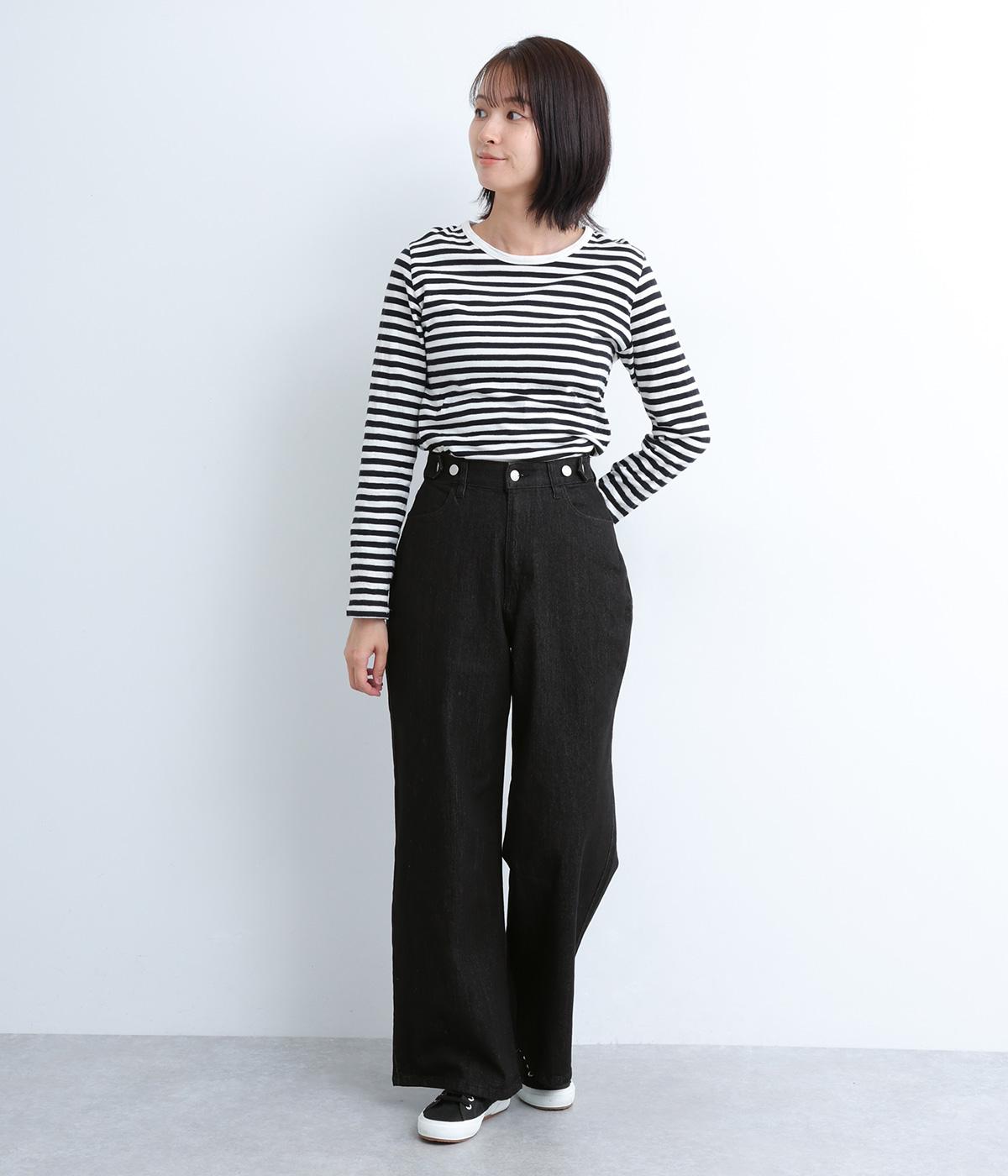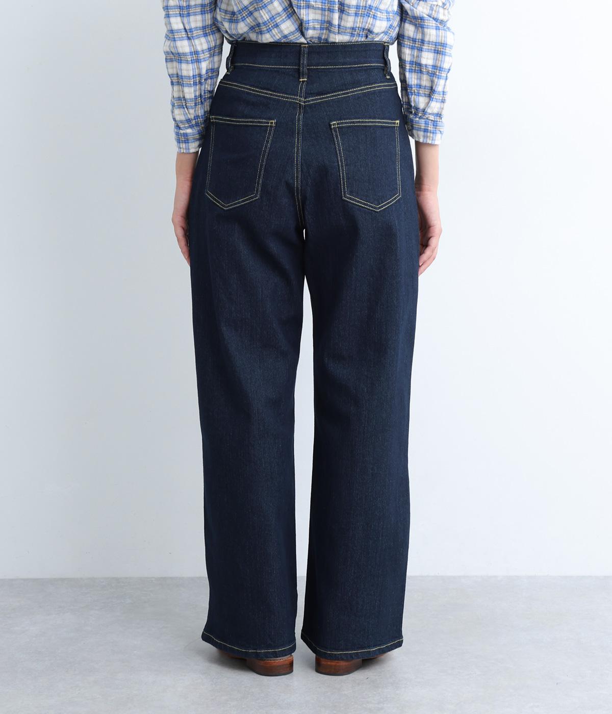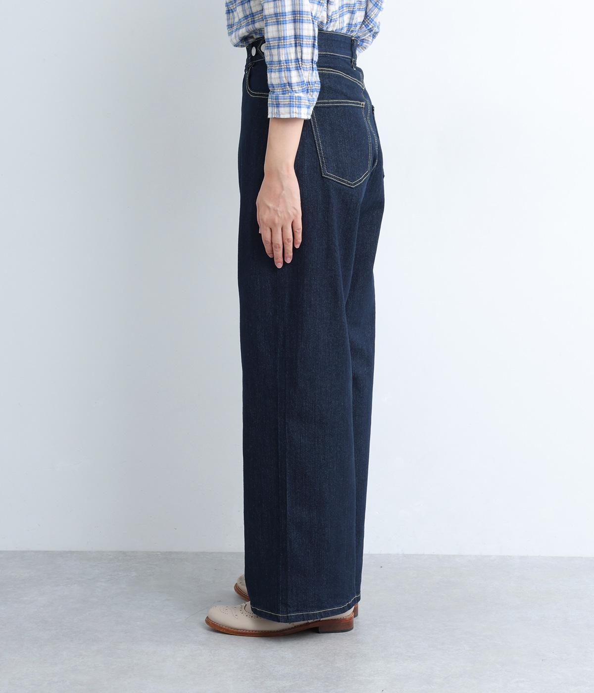 こなれ感のあるワイドシルエットのデニムパンツ。アクセントにウエストボタンをあしらいました。脚のラインを拾わず、ハイウエストでスタイルアップ効果も。カジュアルにもきれいめにも幅広く着こなせる一本です。