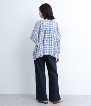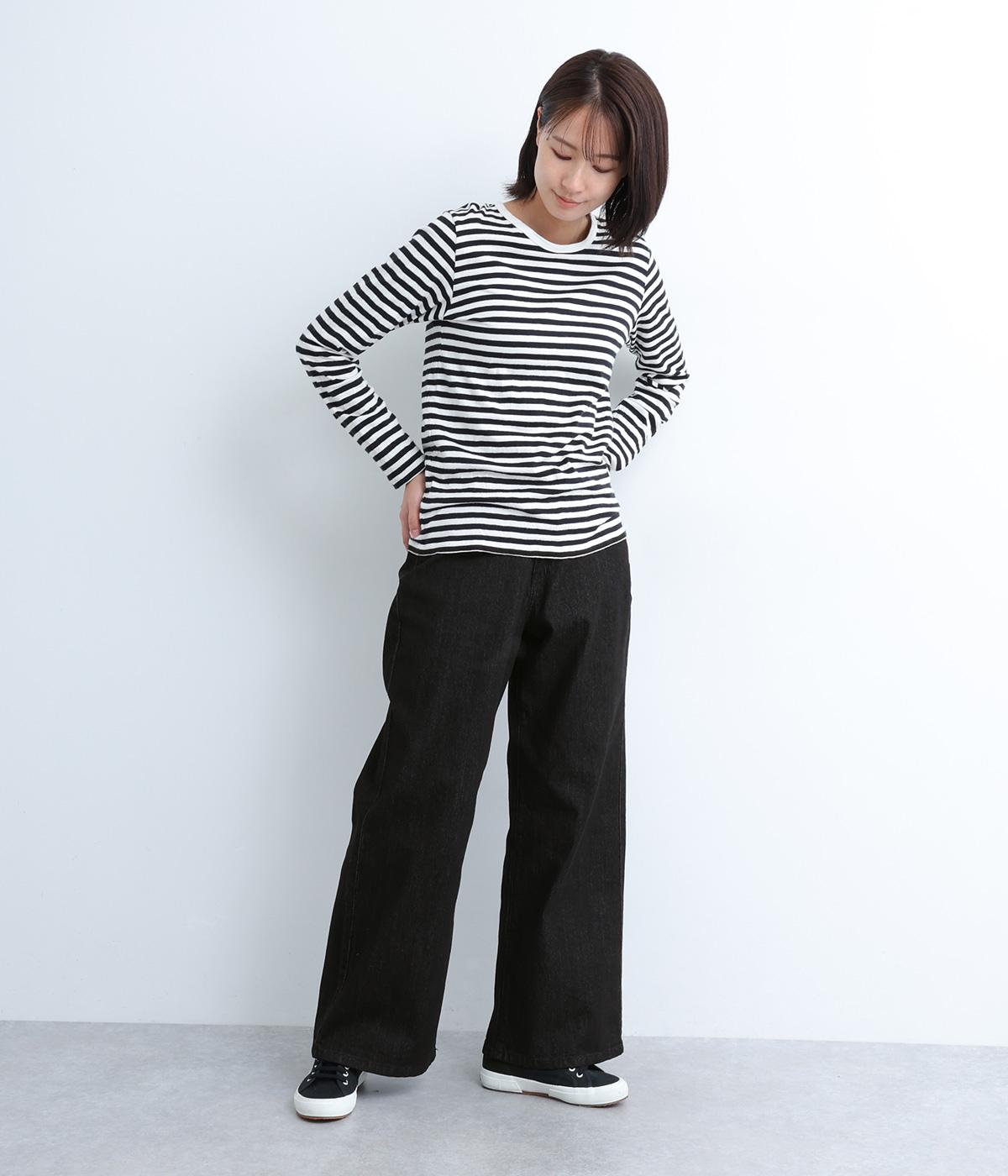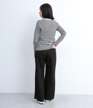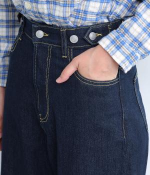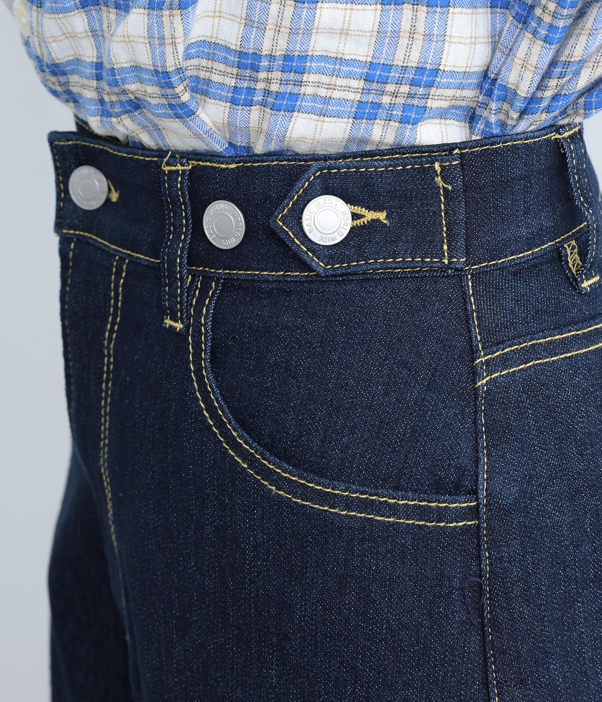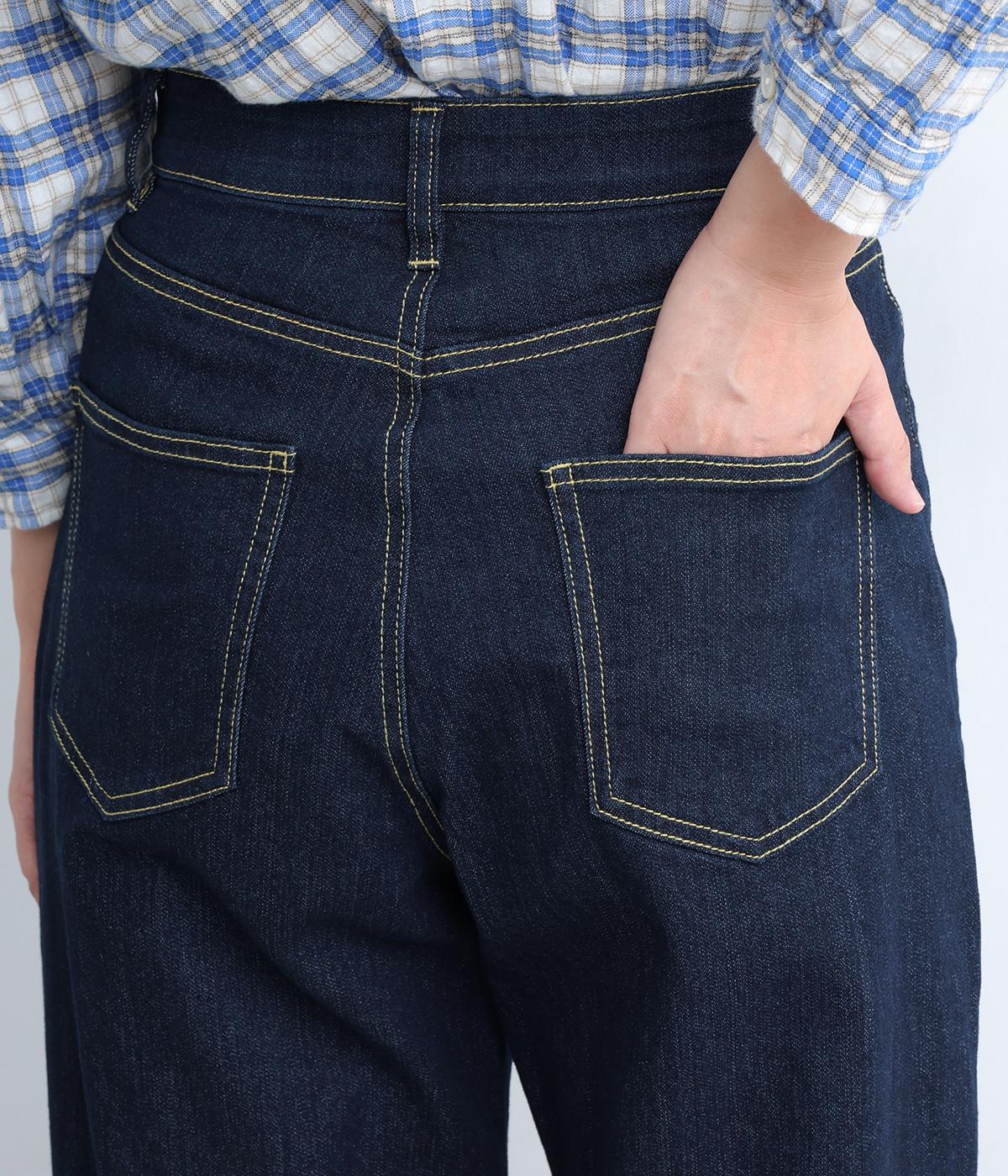 こなれ感のあるワイドシルエットのデニムパンツ。アクセントにウエストボタンをあしらいました。脚のラインを拾わず、ハイウエストでスタイルアップ効果も。カジュアルにもきれいめにも幅広く着こなせる一本です。