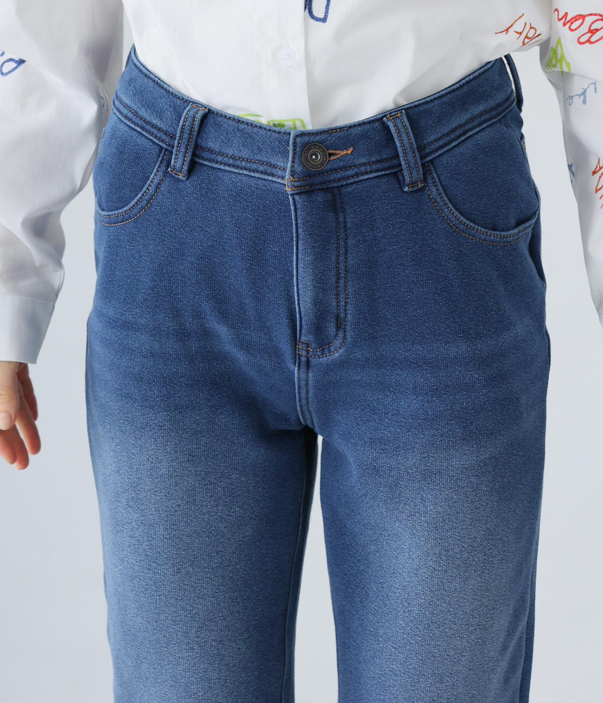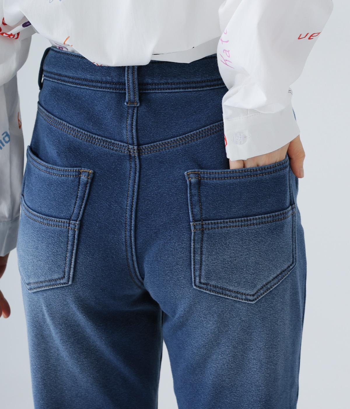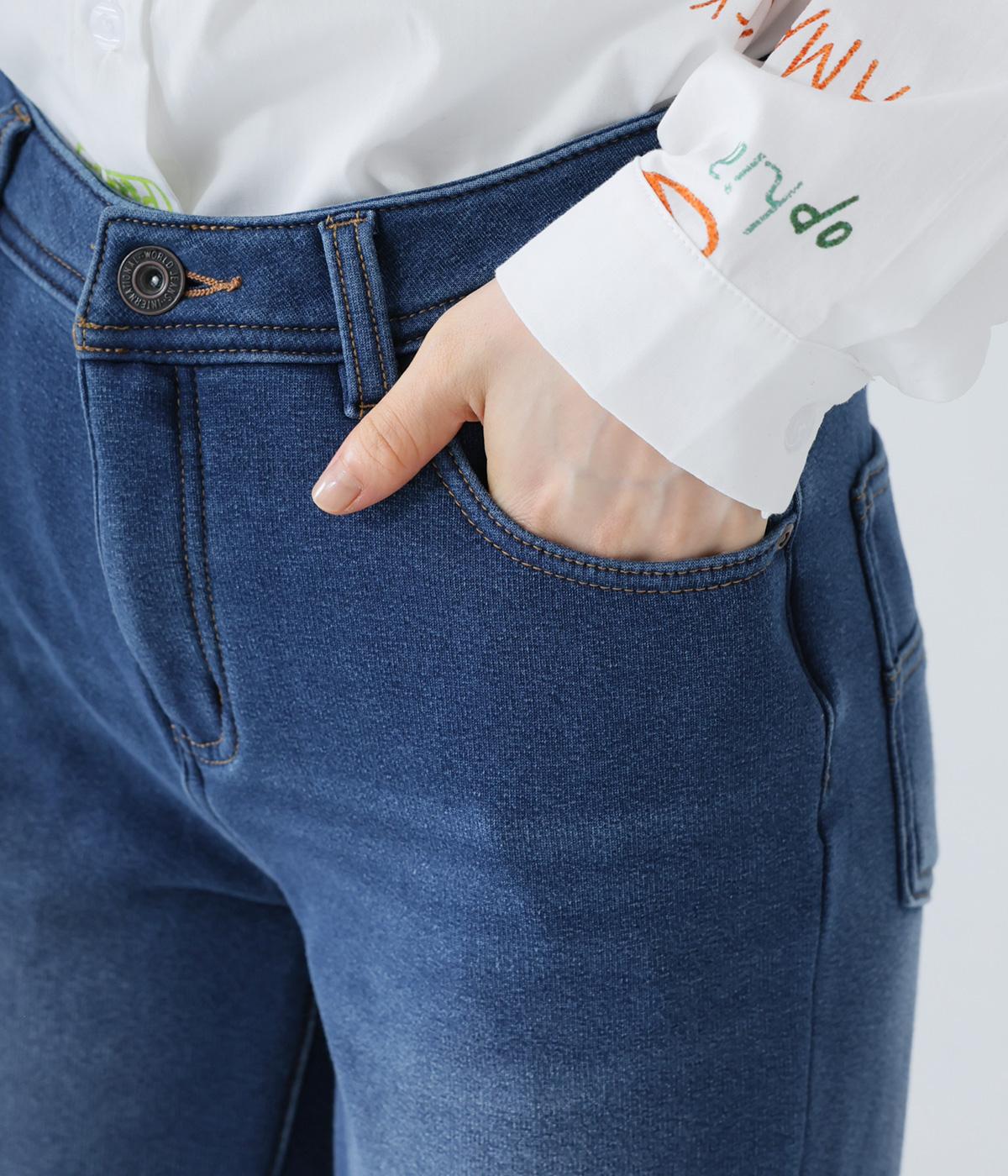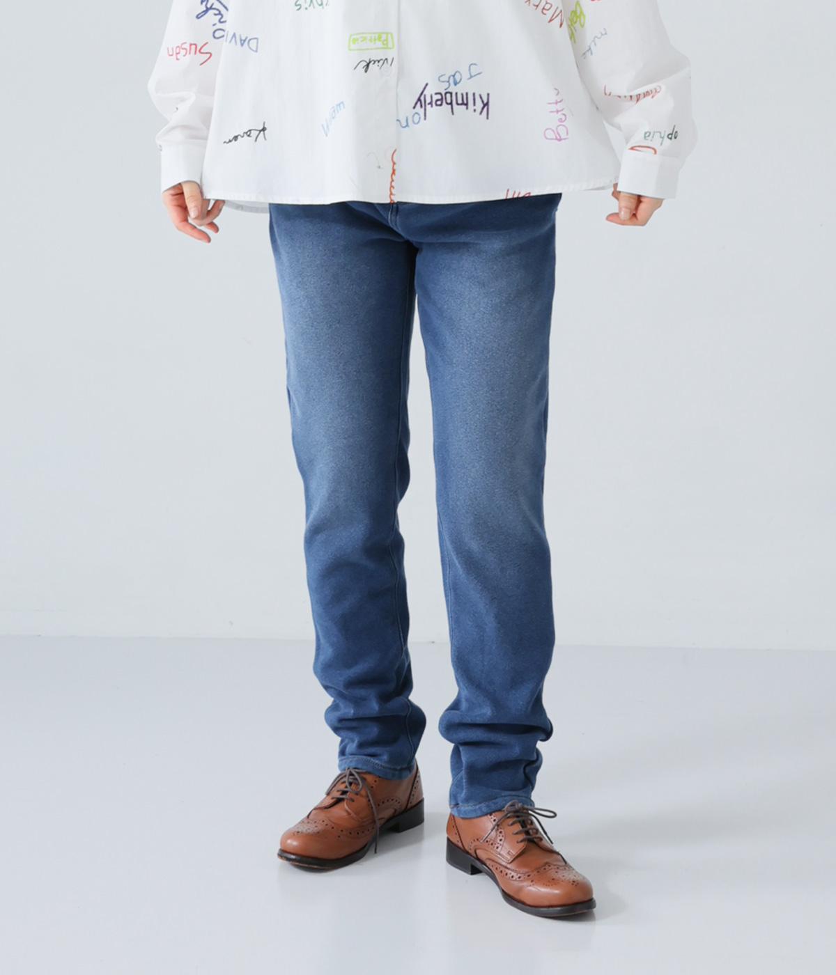 あたたかくイージーな着用感にこだわったコットン混のニットデニム生地。裏面をやわらかなシャギー素材にした、伸縮性の高い生地感です。インディゴ染めを施したデニムならではのカジュアルなルックスが◎。