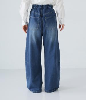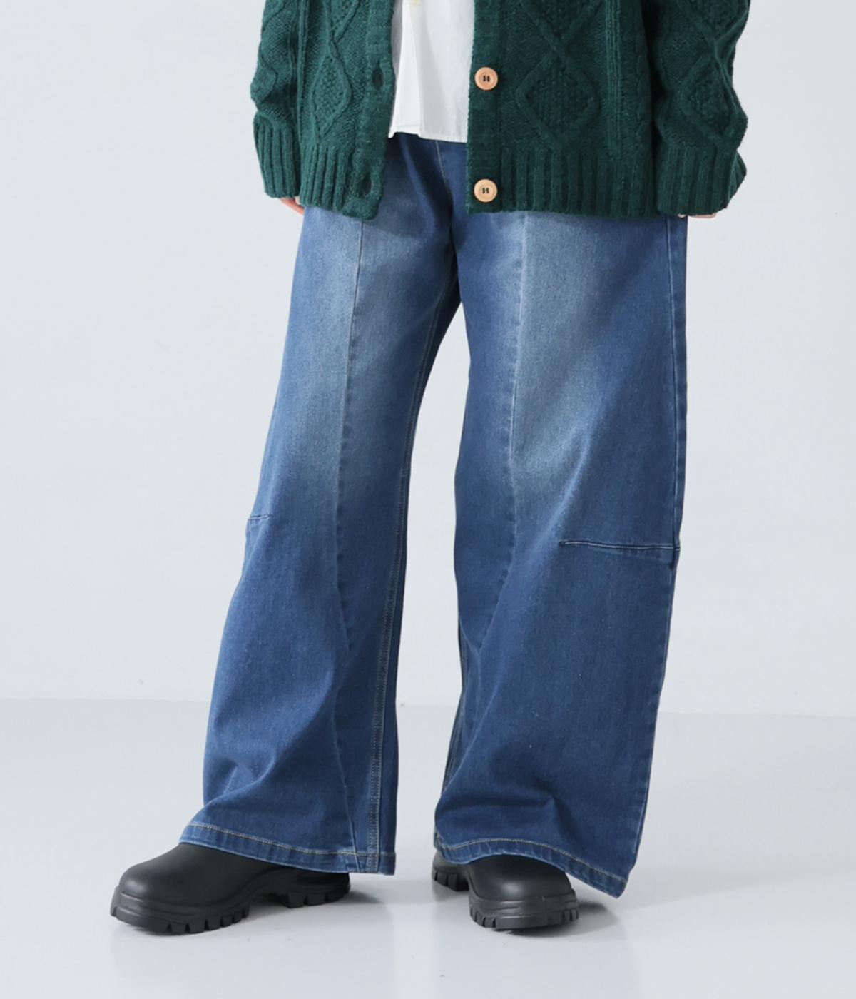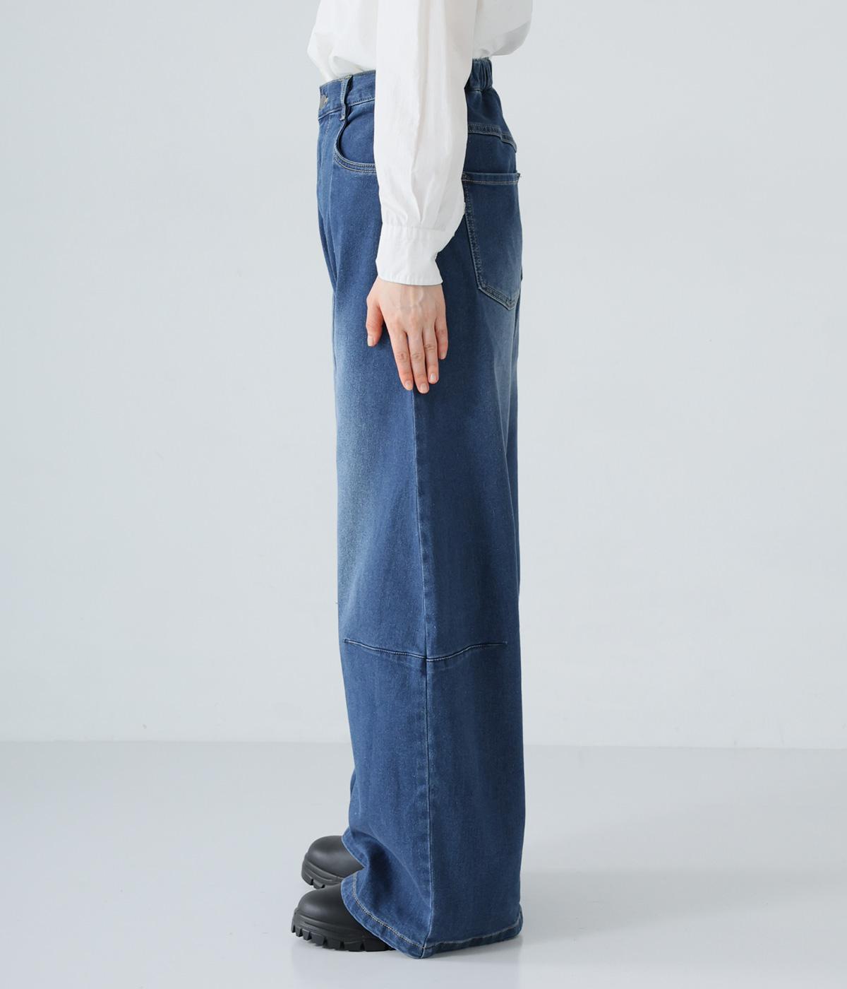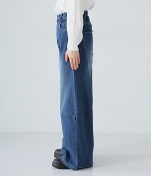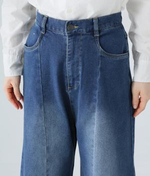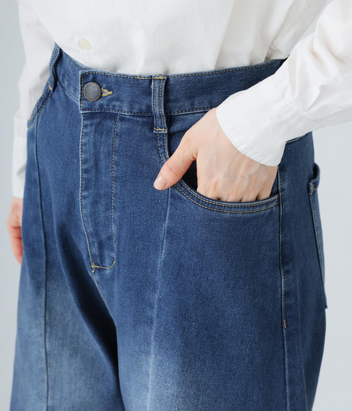 ひざ位置のダーツとフロントに斜めに入れた切り替えラインで、シルエットをカーブさせたデニムパンツ。着こなしにこなれ感をプラスし、おしゃれなムードを高めてくれます。ウエストは後ろのみゴム仕様で、前はボタンとファスナーをあしらいすっきりと仕上げました。