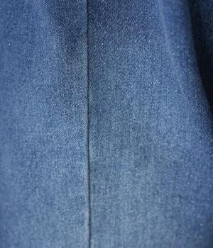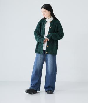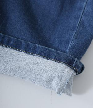 保温性の高い裏起毛が特徴のコットン混デニム生地。ごわつきの少ない柔らかな風合いで伸縮性も高く、秋冬のデイリー使いにぴったりな快適な着用感です。