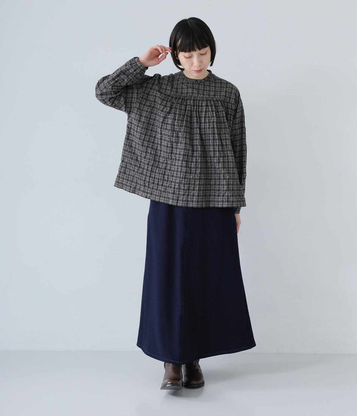 裾に向かって広げたAラインシルエットがフェミニンンなスカート。随所のステッチワークやヒップポケットでデニムらしいカジュアルなムードに仕上げました。後ろ裾に入れたスリットで足さばきも◎。ウエストは総ゴム仕様で、外側に紐をプラスしています。