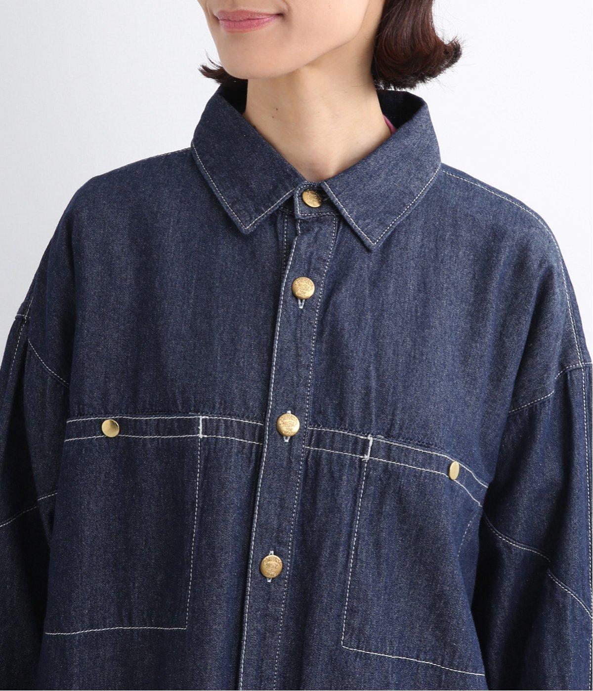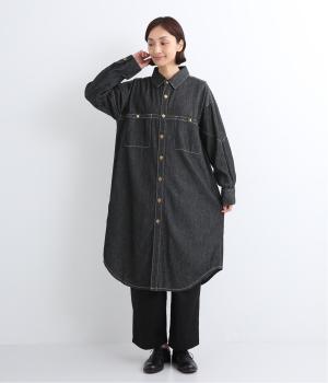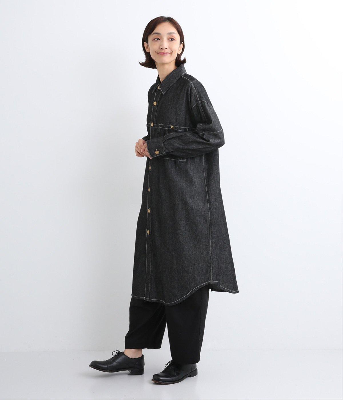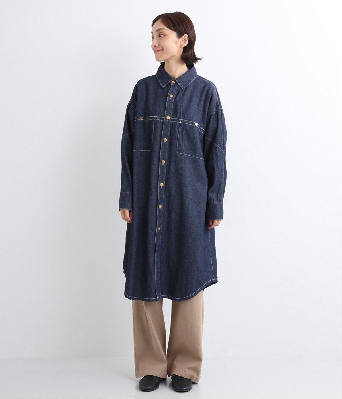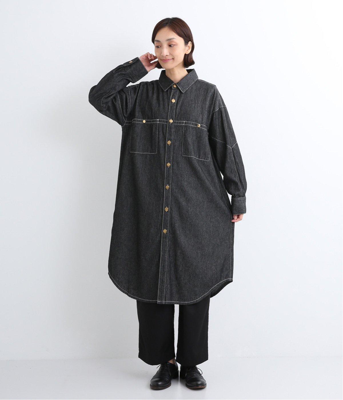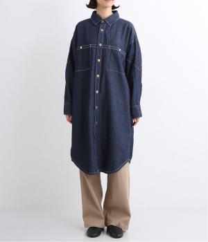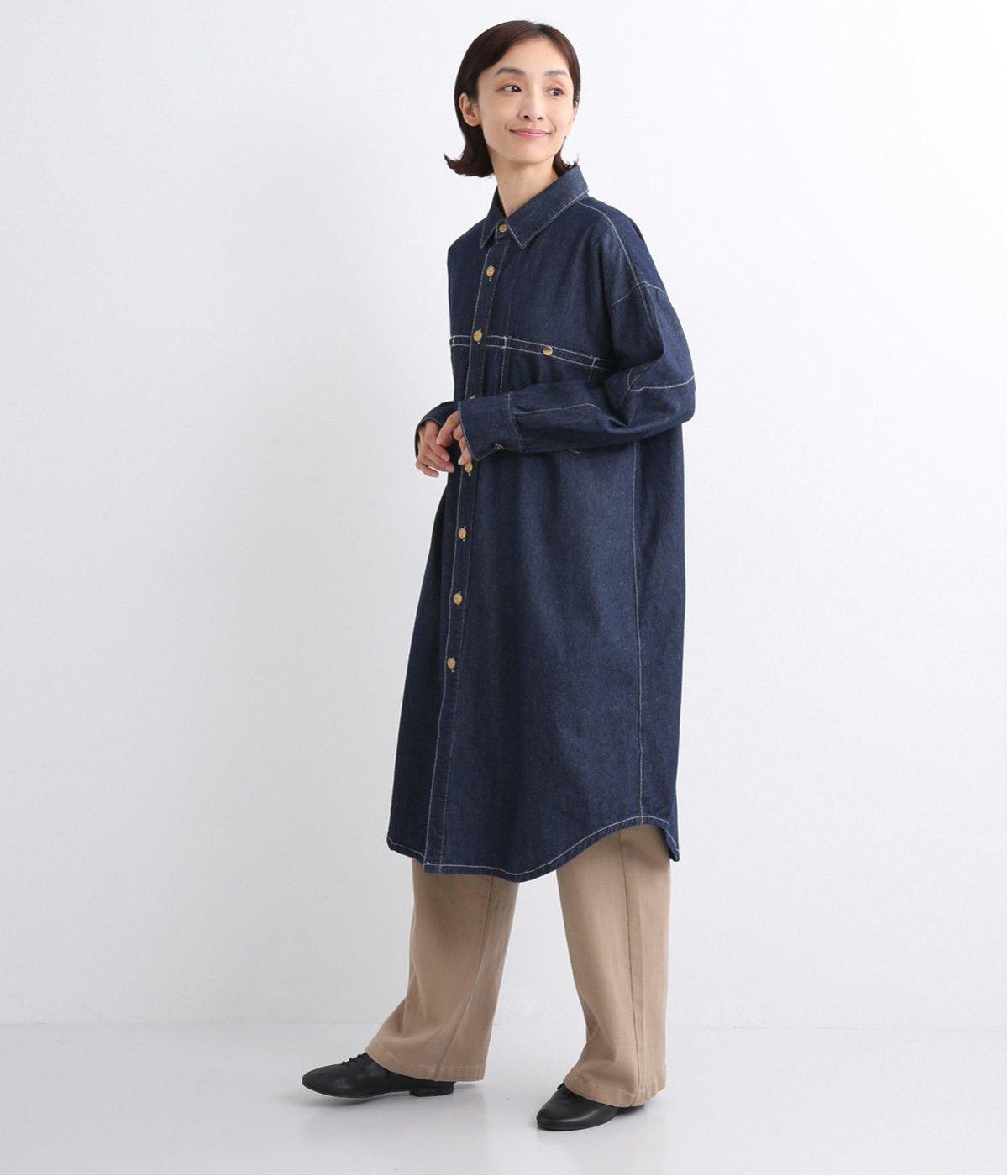 ワーク風ながら無骨すぎないステッチワークで、デザイン性の高いシャツワンピース。前が開くので季節の変わり目の羽織りとしても便利です。ロゴ入りのボタンや大きめのポケットなど細部までこだわりを感じる、長く愛せる1枚です。