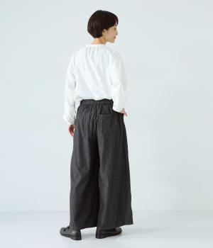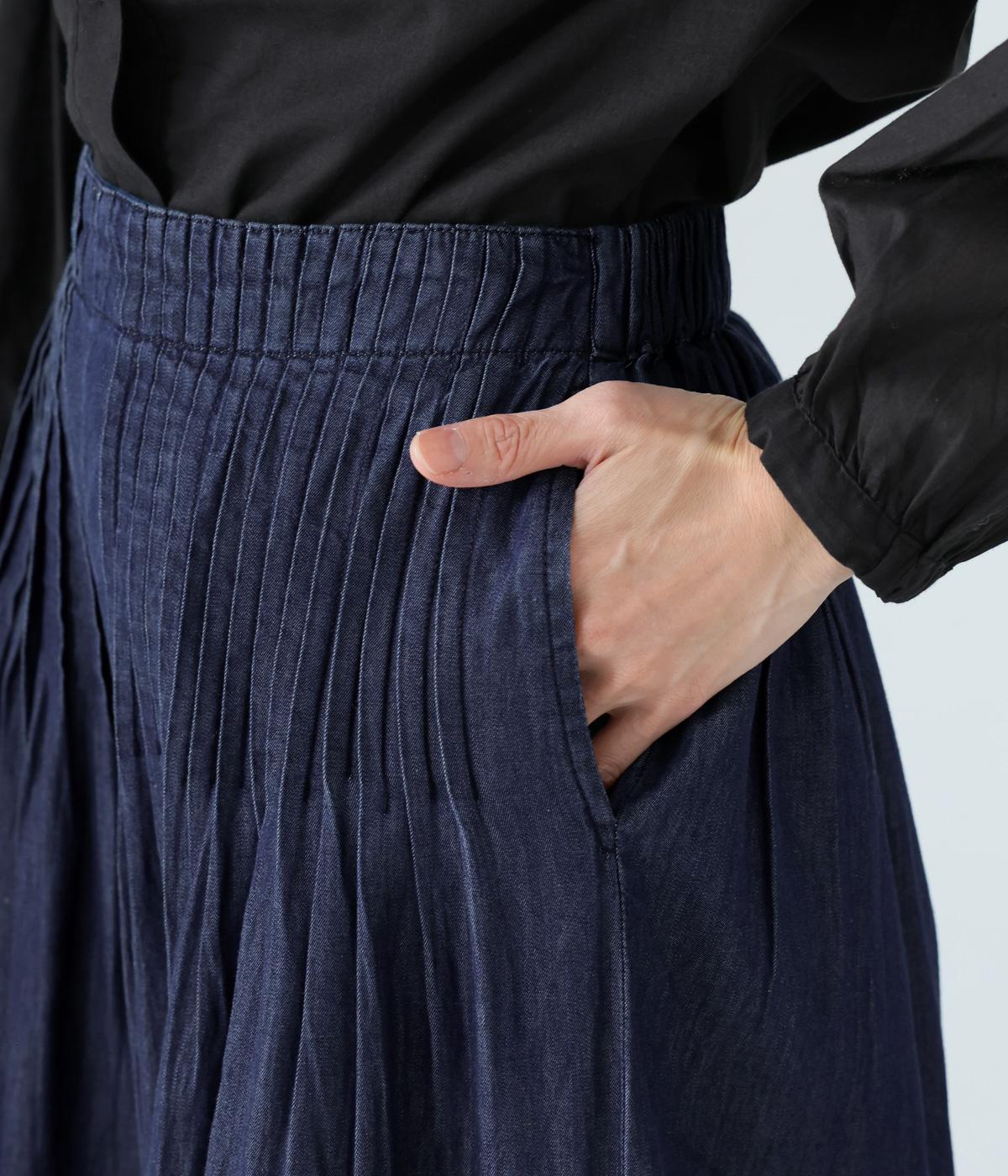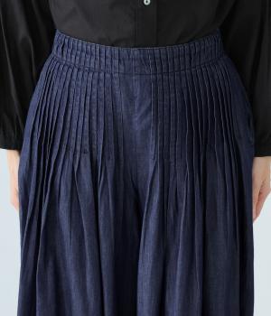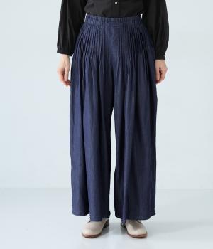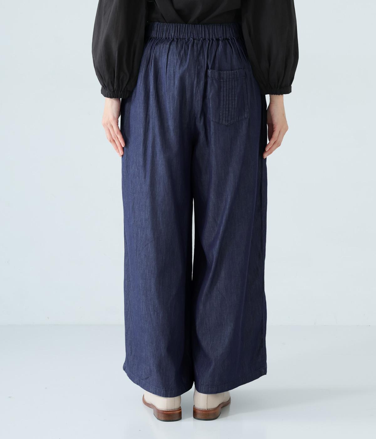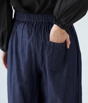 前ウエストから腰にかけて贅沢にピンタックをほどこしたデニムパンツ。やわらかな生地感が横への広がりをおさえながら自然なギャザーをうみ、シンプルなトップス合わせでもサマ見えする存在感を放ちます。ウエストは後ろのみゴム仕様です。