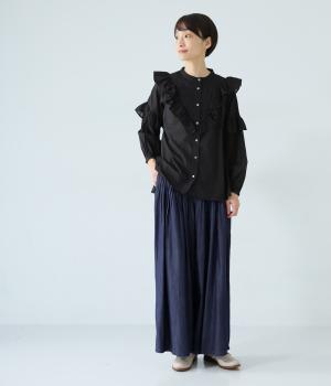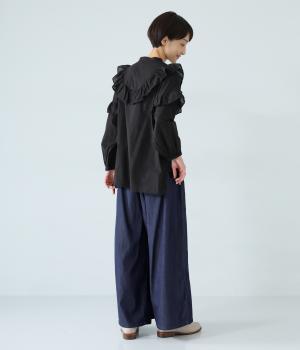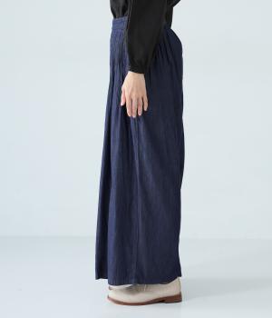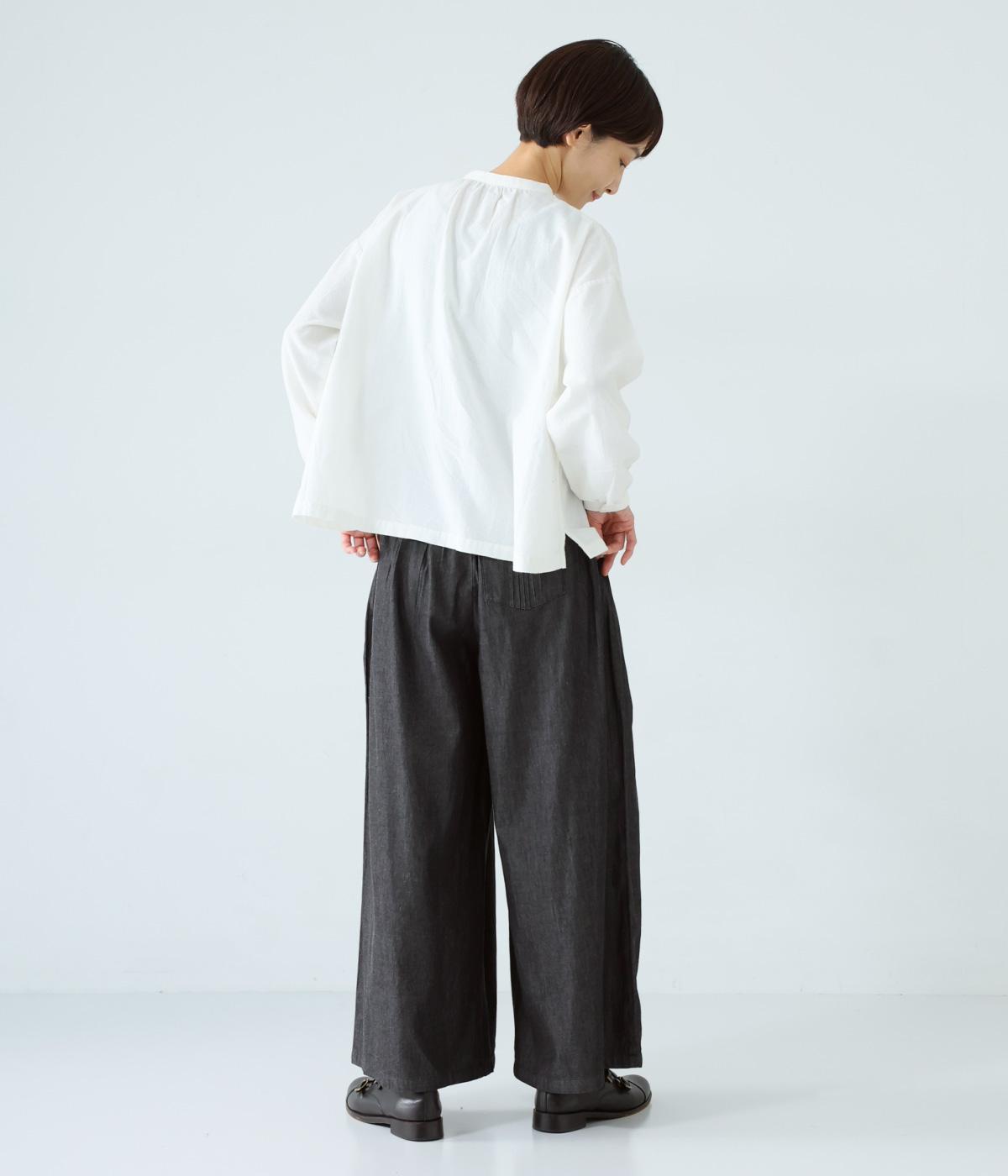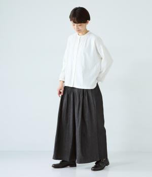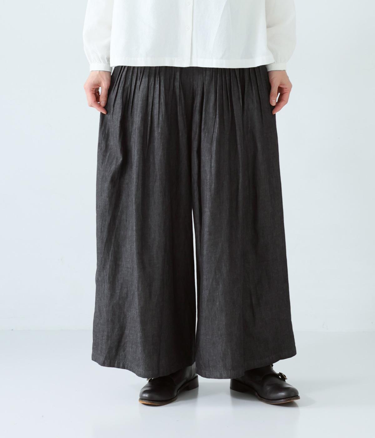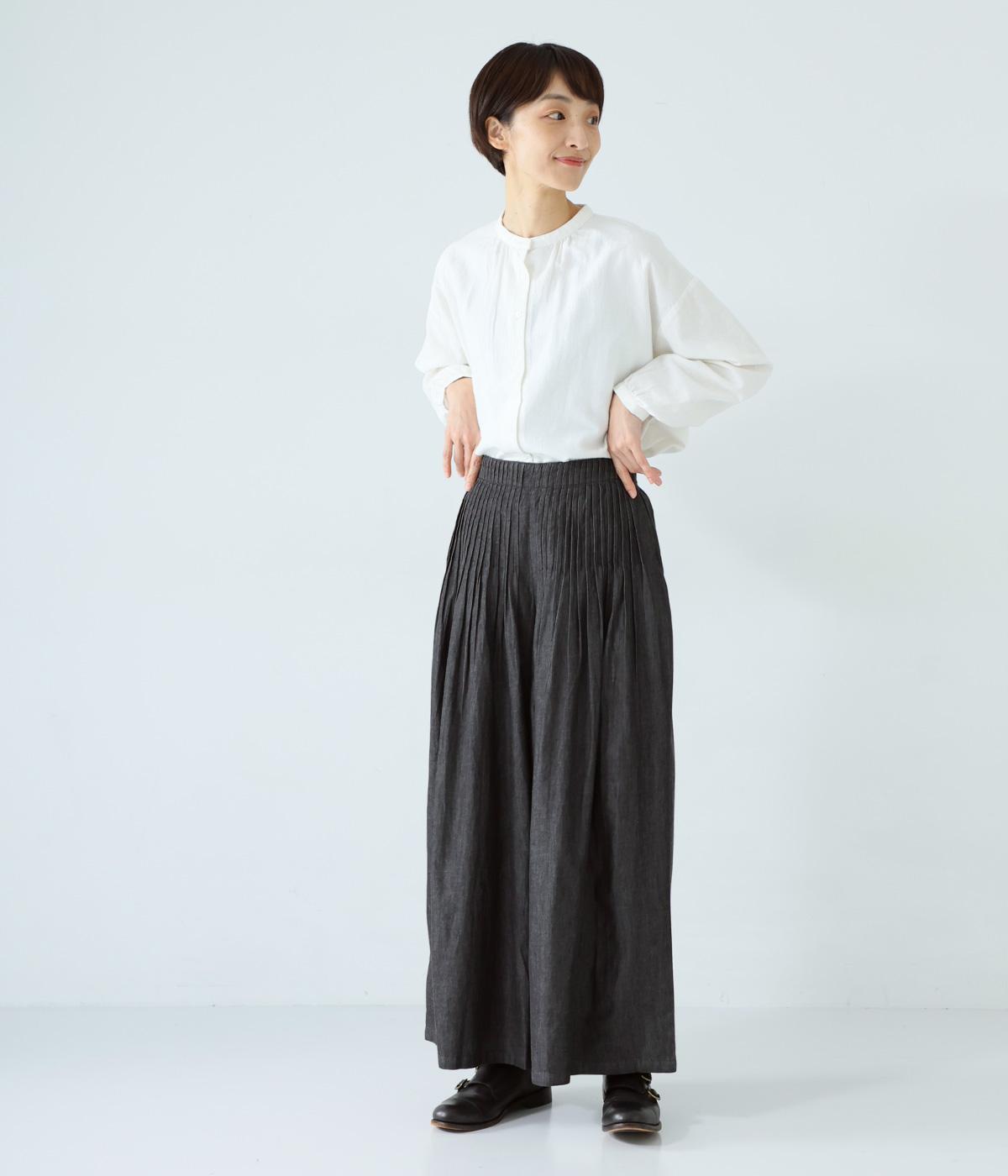 前ウエストから腰にかけて贅沢にピンタックをほどこしたデニムパンツ。やわらかな生地感が横への広がりをおさえながら自然なギャザーをうみ、シンプルなトップス合わせでもサマ見えする存在感を放ちます。ウエストは後ろのみゴム仕様です。