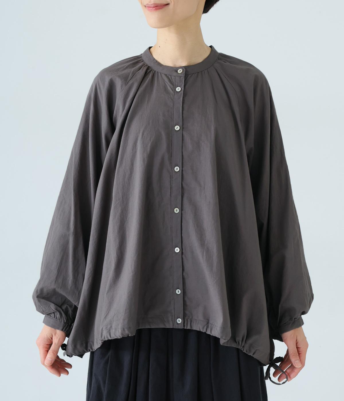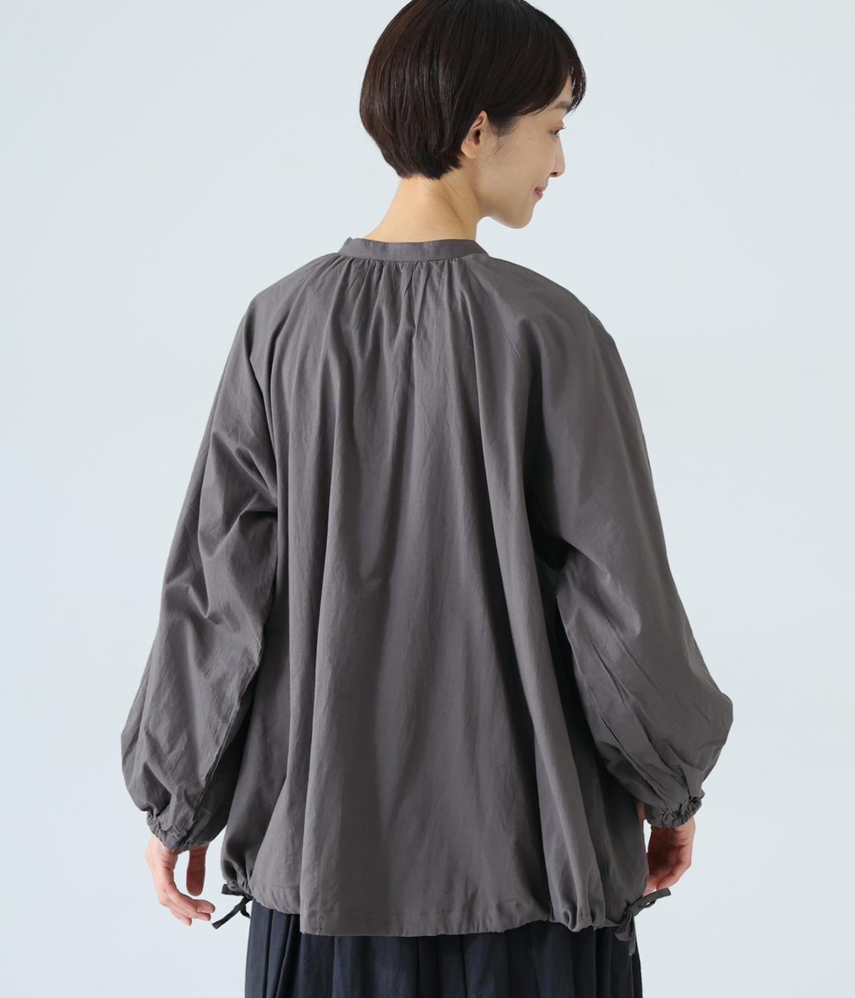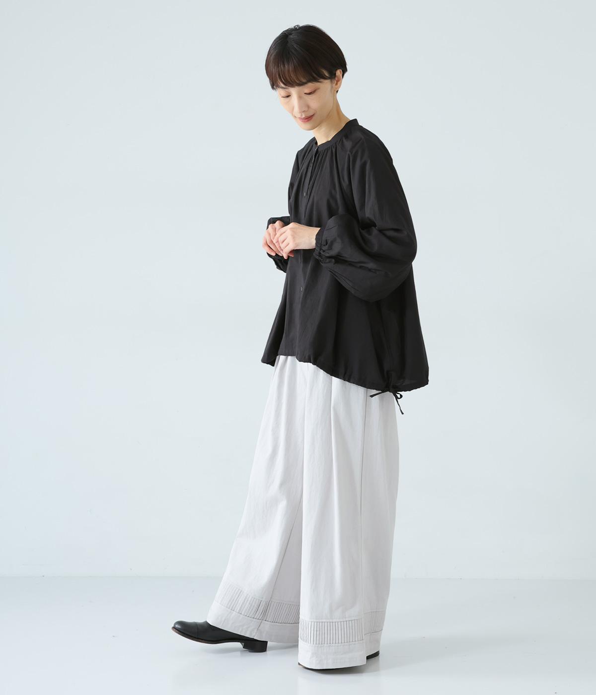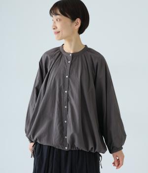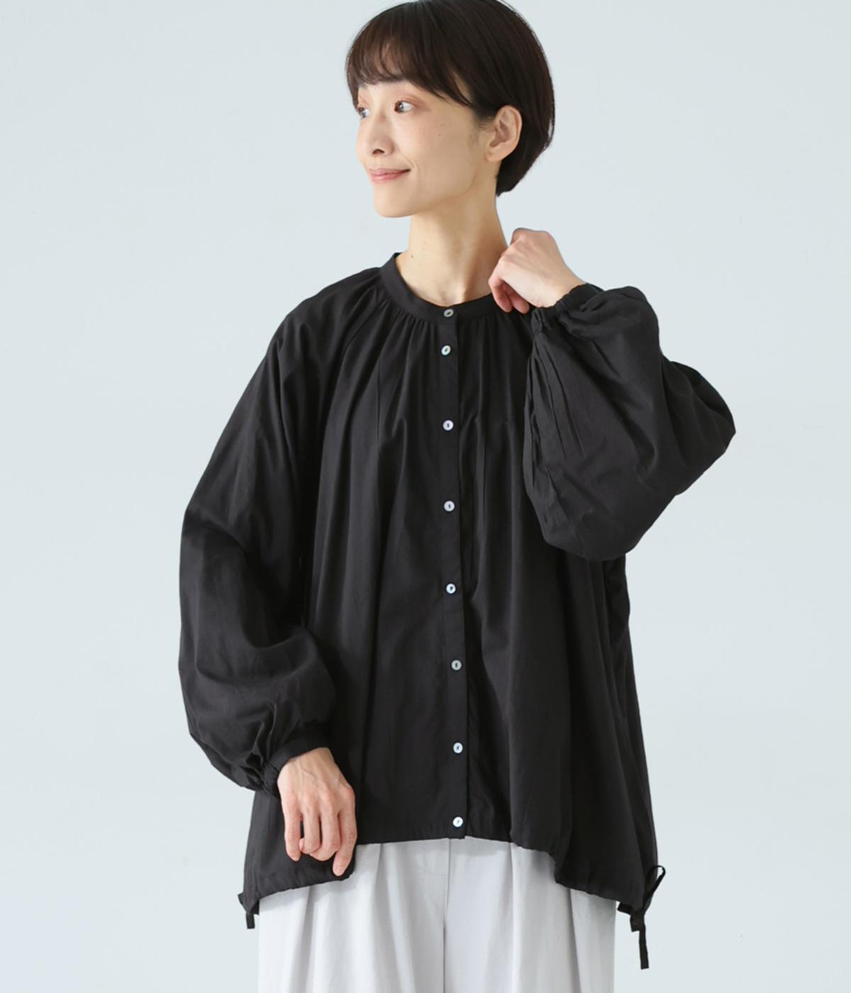 襟ぐりにギャザーをほどこしふんわりとしたシルエットに仕上げたスモックブラウス。袖口をゴムできゅっと引き締めた愛らしいバルーンスリーブがポイントです。裾両サイドの紐を絞れば、丸みのあるシルエットにアレンジできます。