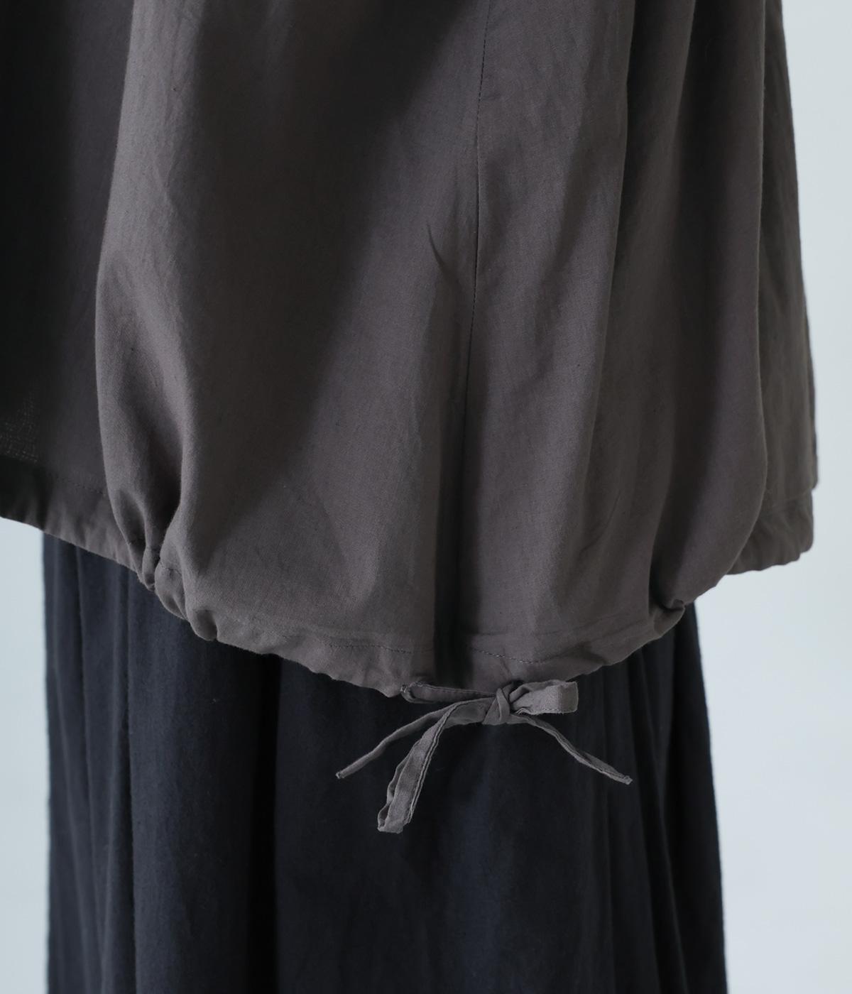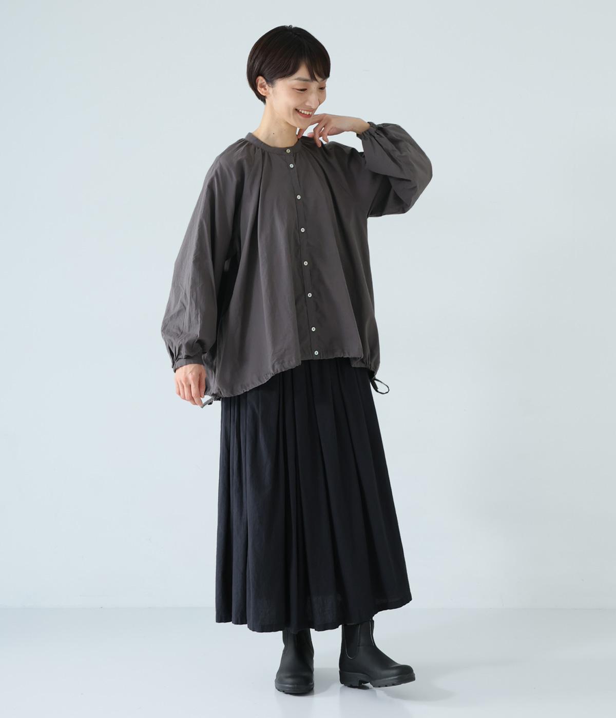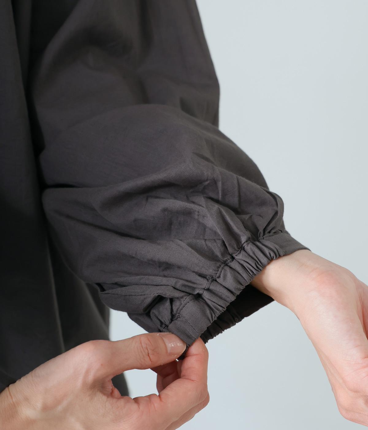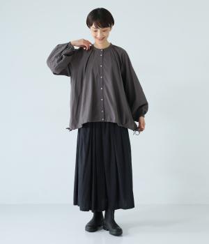 襟ぐりにギャザーをほどこしふんわりとしたシルエットに仕上げたスモックブラウス。袖口をゴムできゅっと引き締めた愛らしいバルーンスリーブがポイントです。裾両サイドの紐を絞れば、丸みのあるシルエットにアレンジできます。