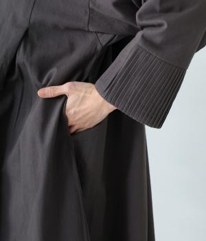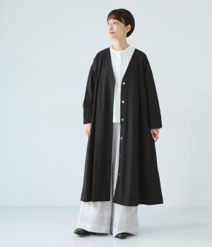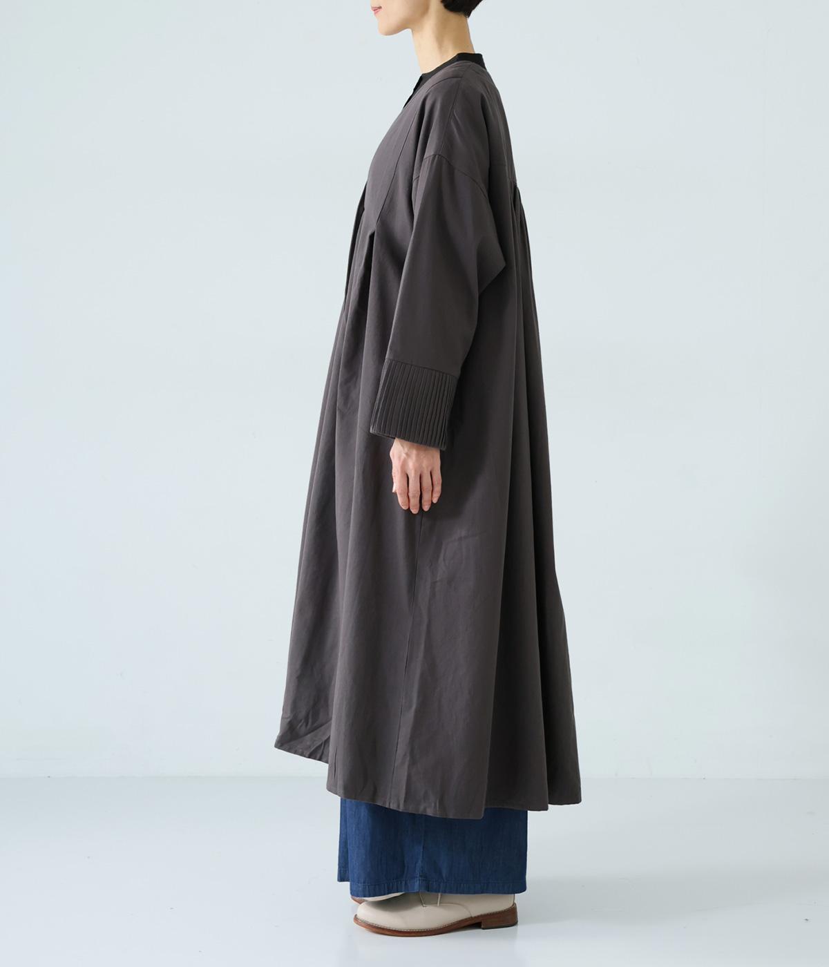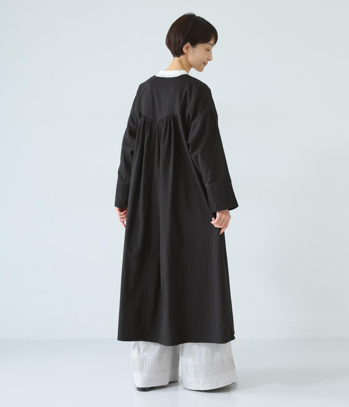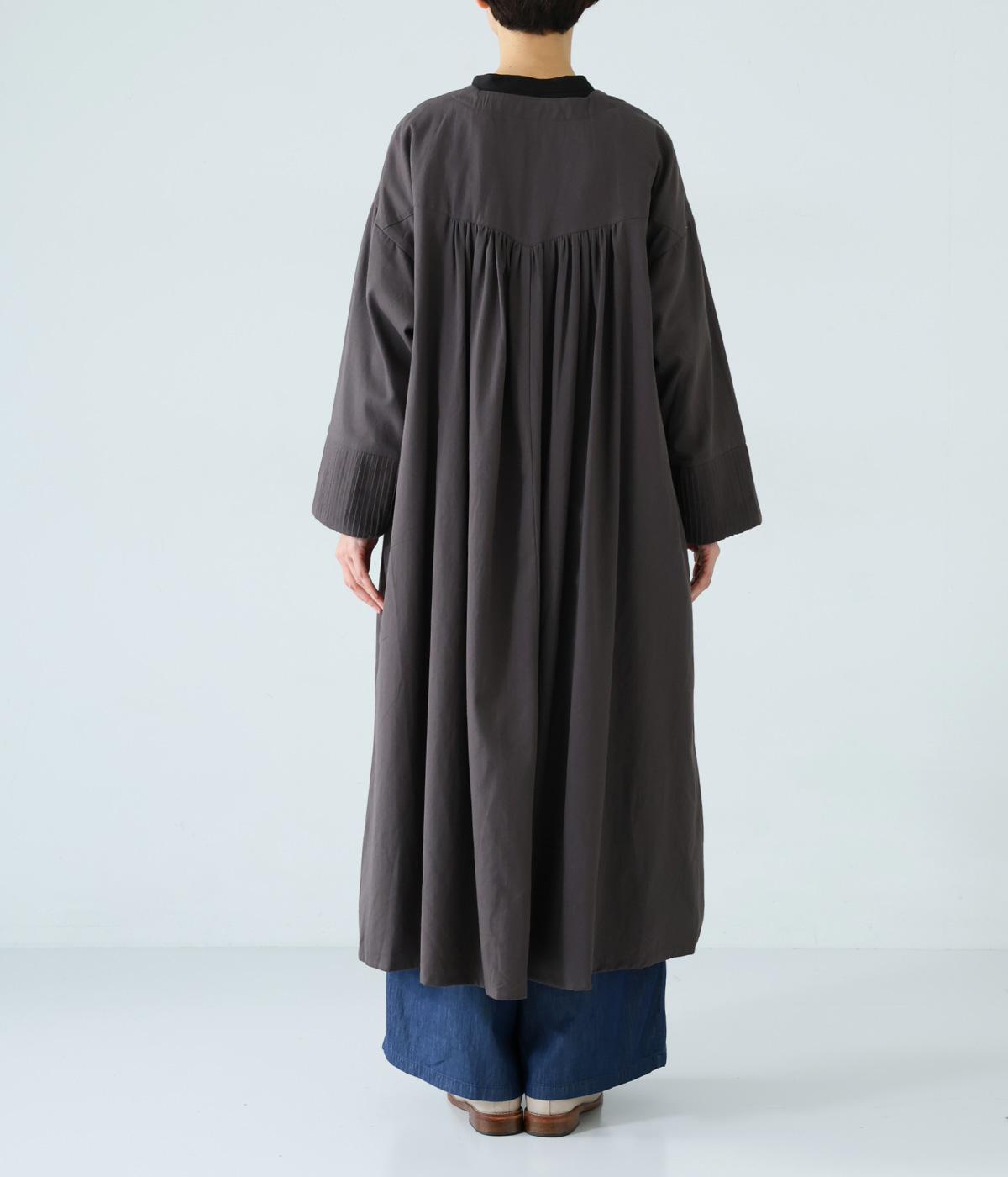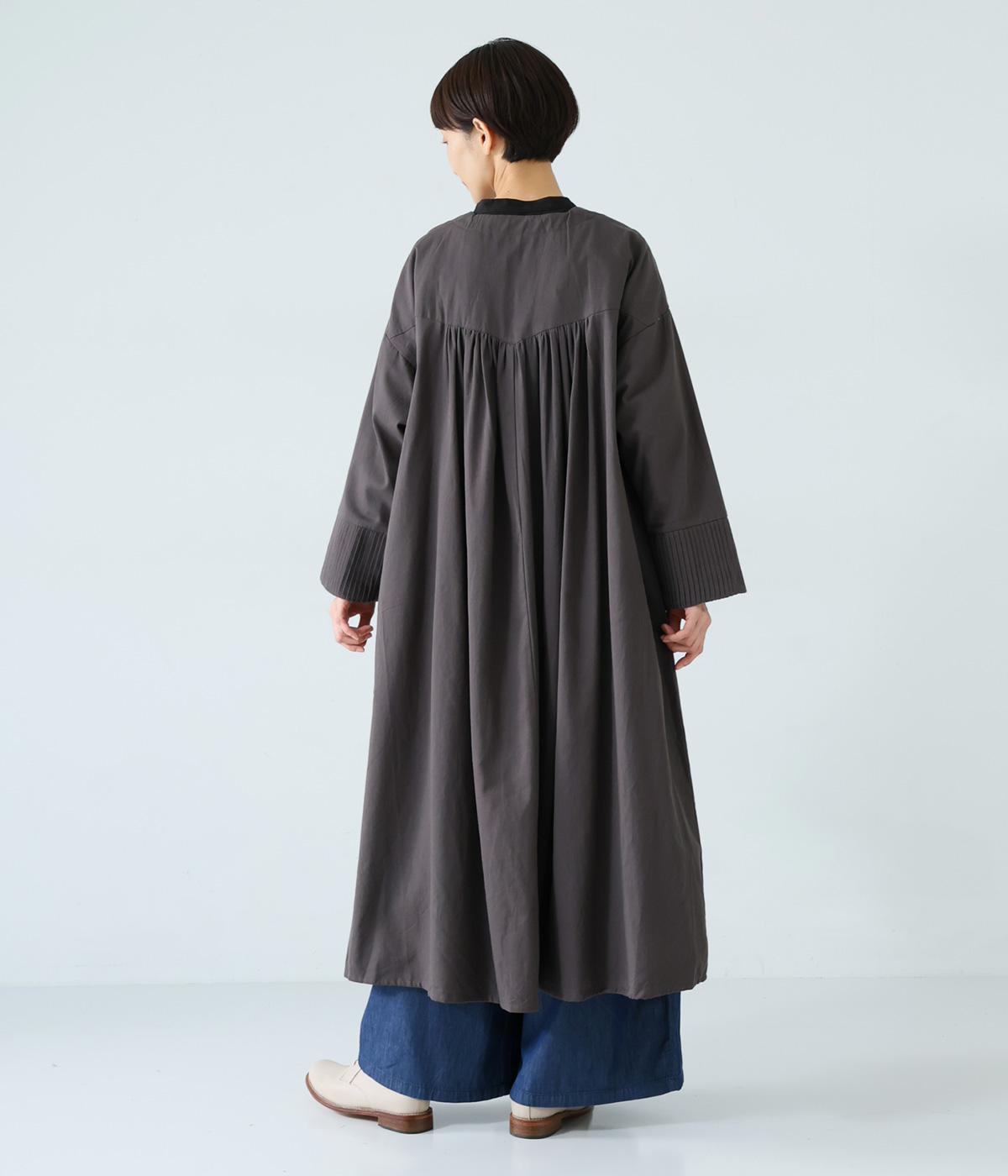 たっぷりのギャザーが後ろ姿を優雅に演出するアウター。フロントにはダーツをほどこし、胸下からAラインに広がる女性らしいシルエットを表現しました。袖口にあしらったピンタックがアクセントに。ワンピースとしても着こなせる便利な一着です。