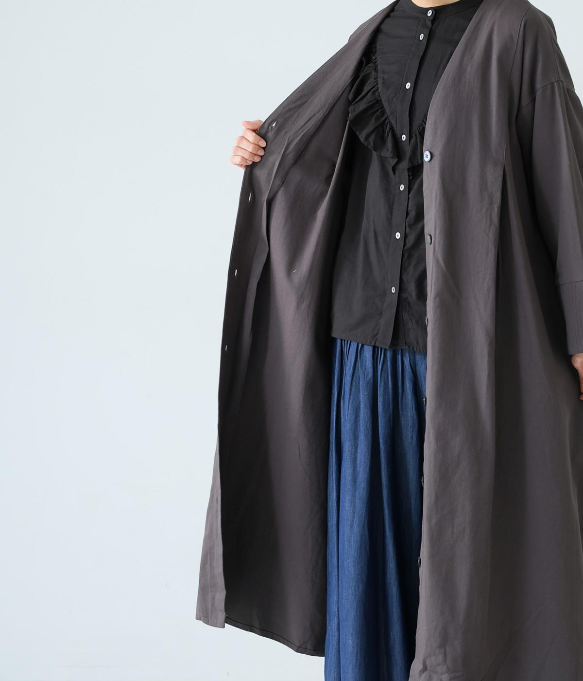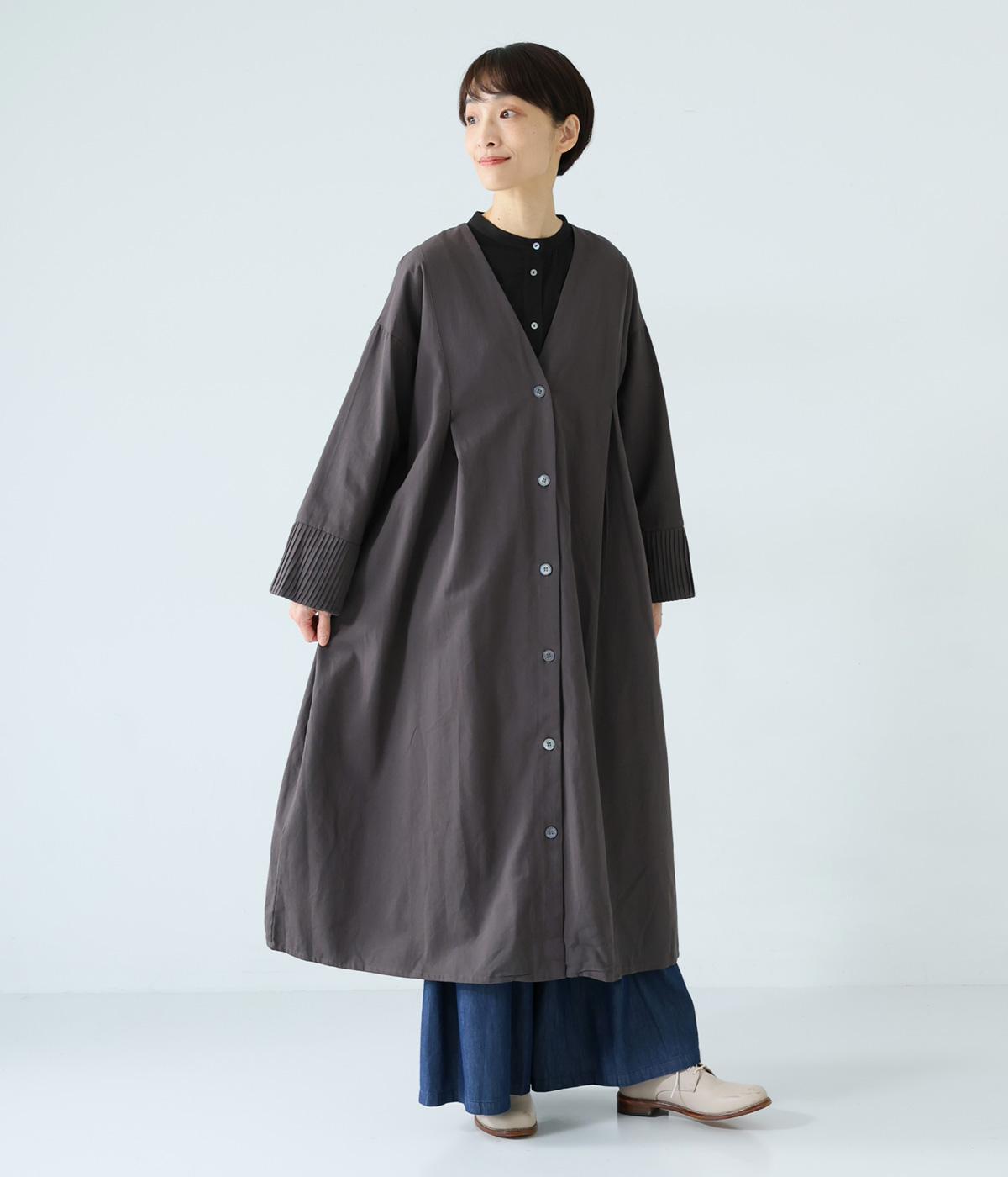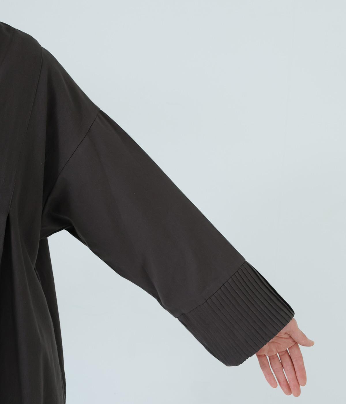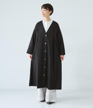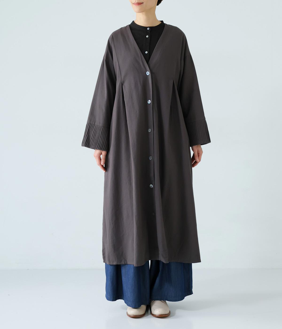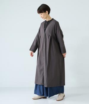 たっぷりのギャザーが後ろ姿を優雅に演出するアウター。フロントにはダーツをほどこし、胸下からAラインに広がる女性らしいシルエットを表現しました。袖口にあしらったピンタックがアクセントに。ワンピースとしても着こなせる便利な一着です。