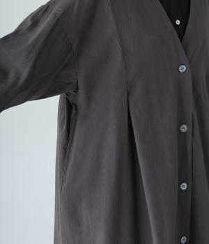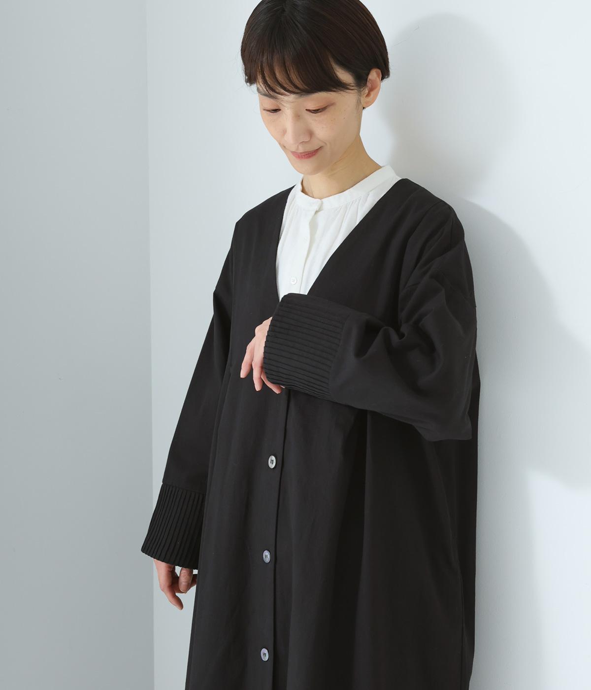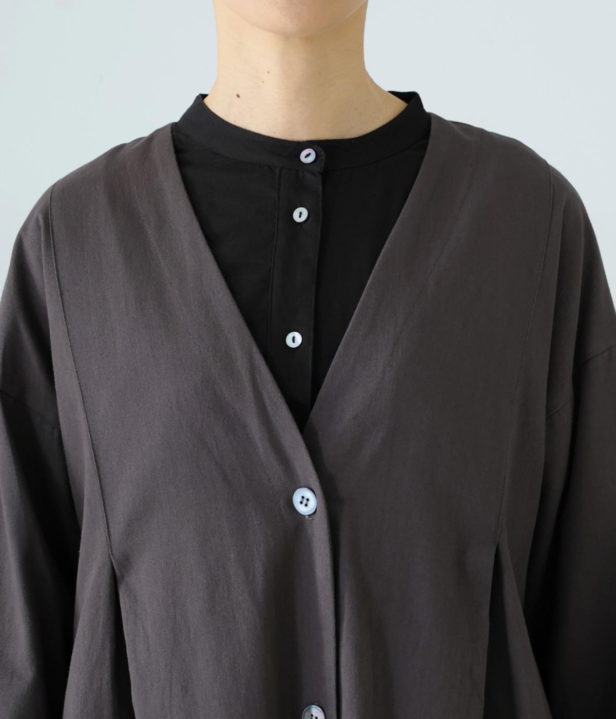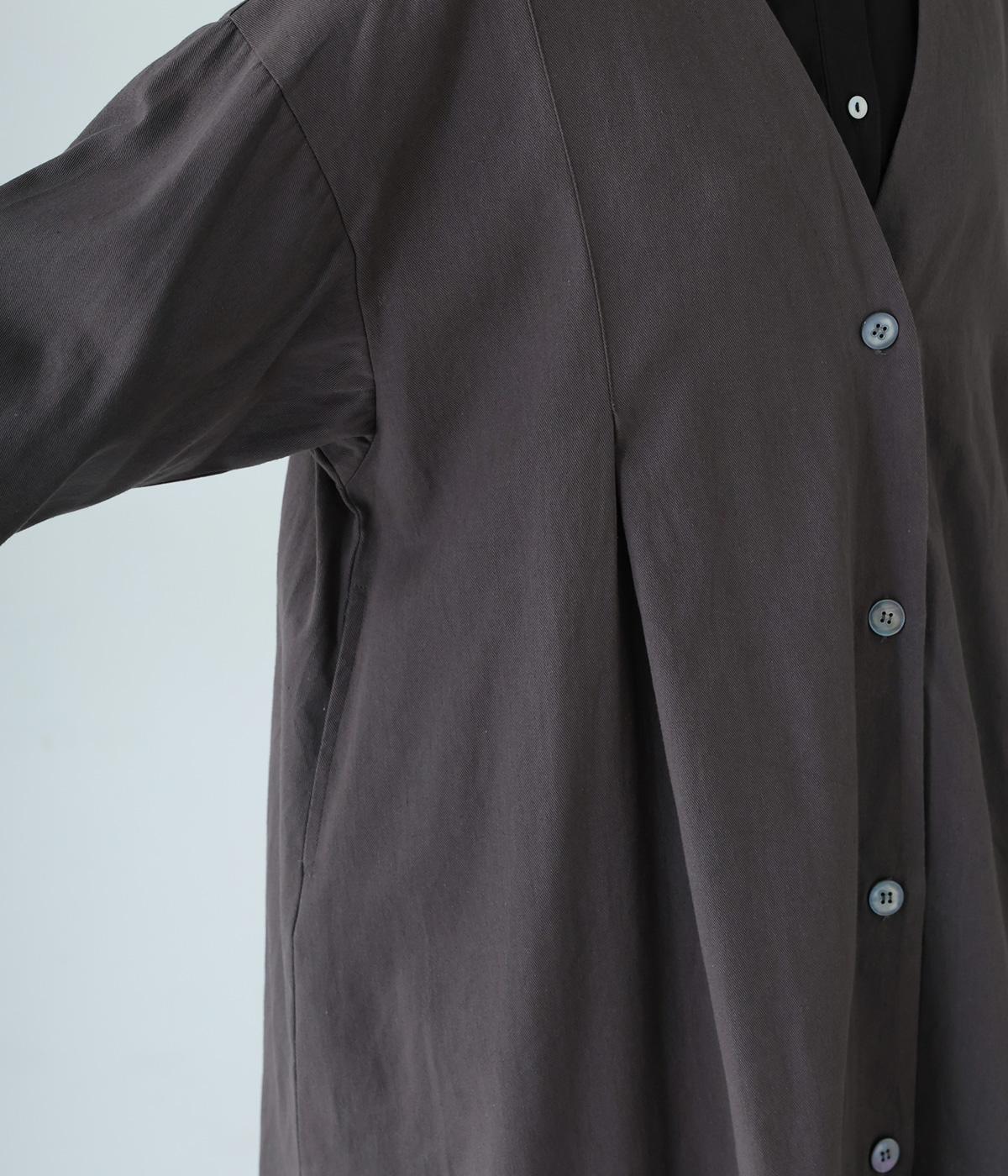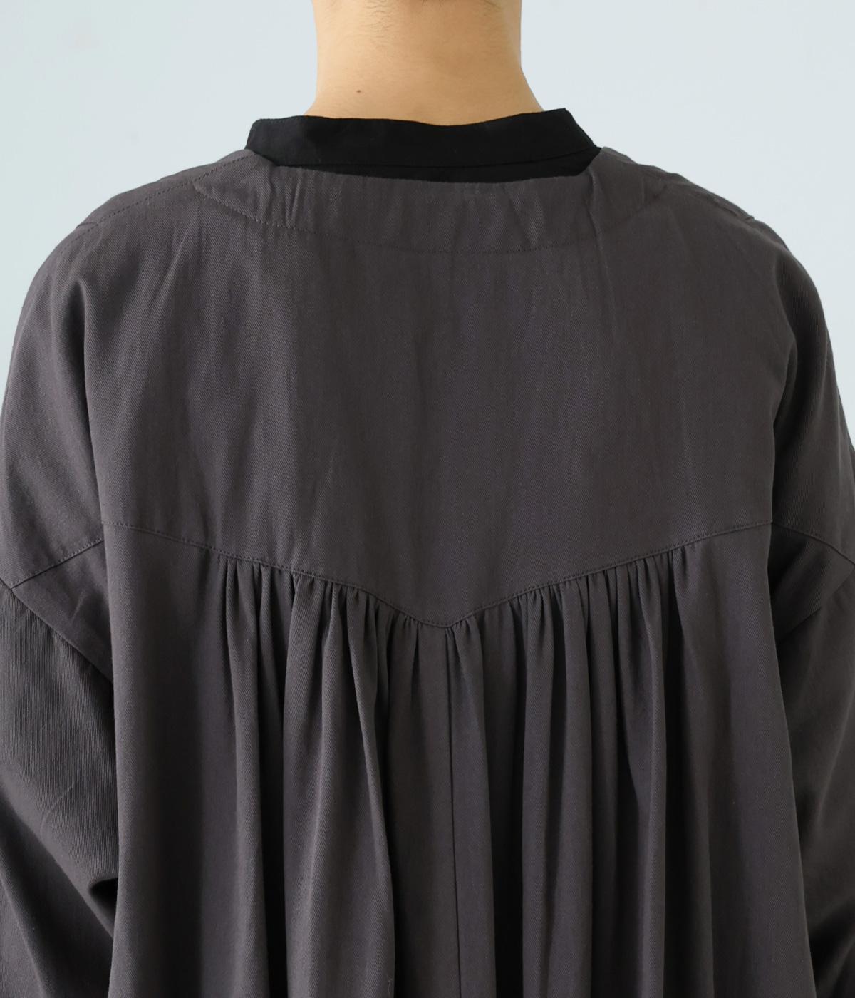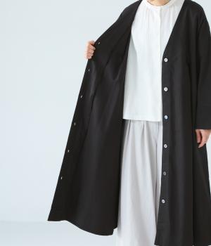 たっぷりのギャザーが後ろ姿を優雅に演出するアウター。フロントにはダーツをほどこし、胸下からAラインに広がる女性らしいシルエットを表現しました。袖口にあしらったピンタックがアクセントに。ワンピースとしても着こなせる便利な一着です。
