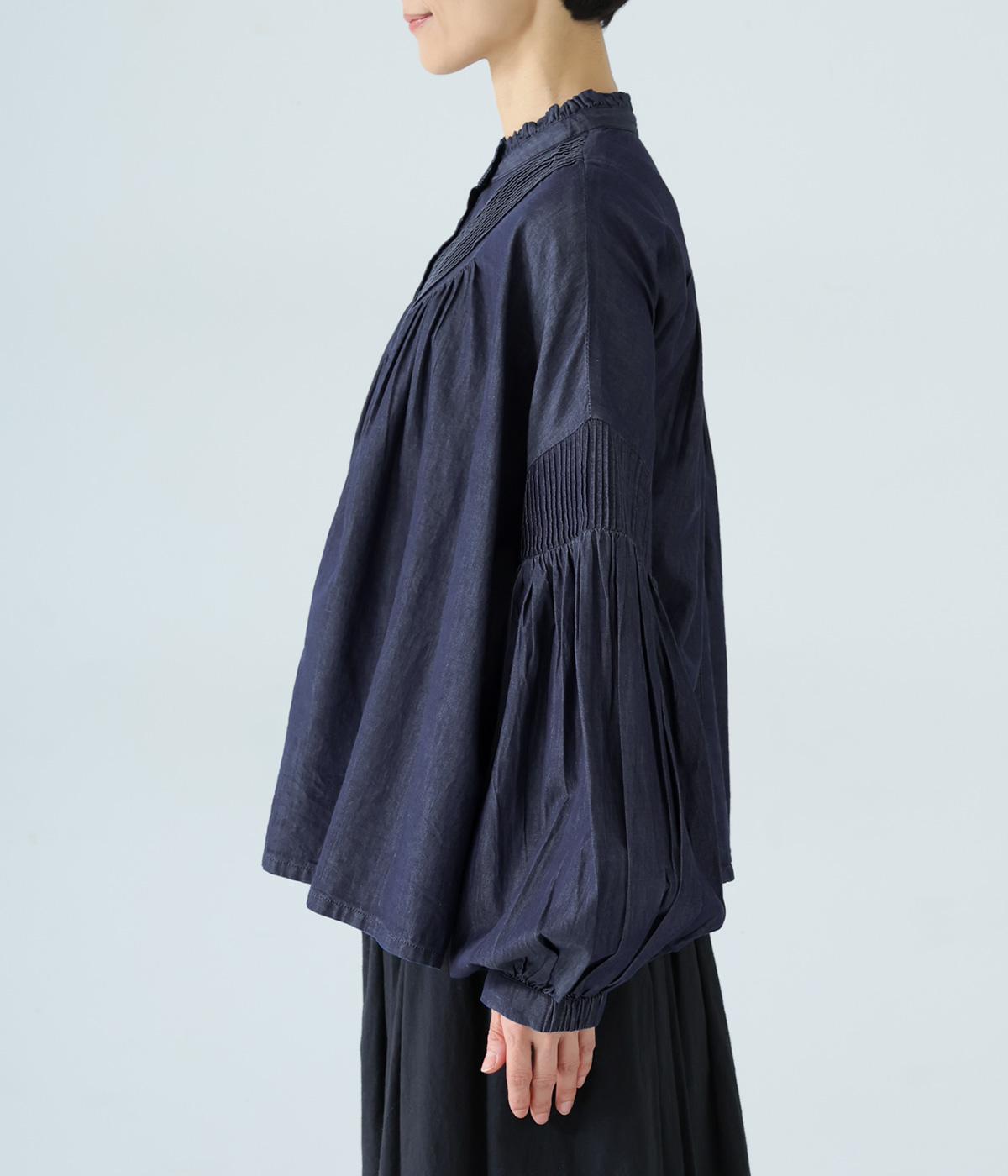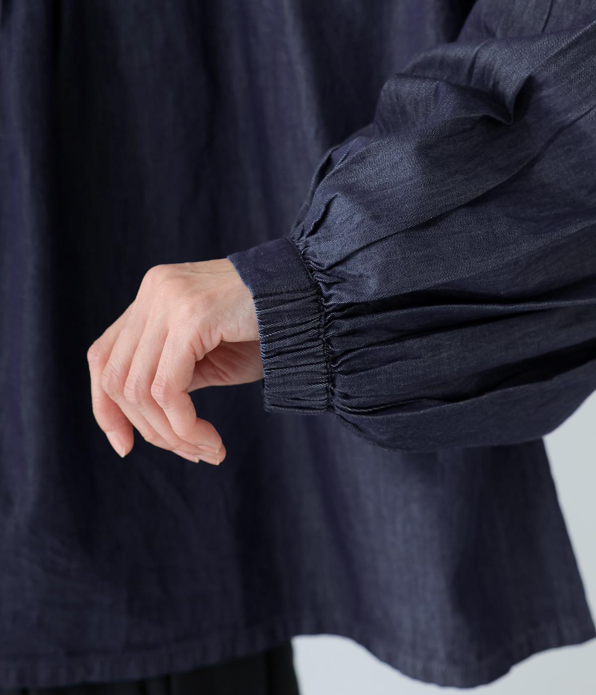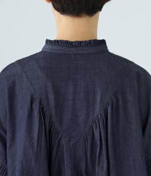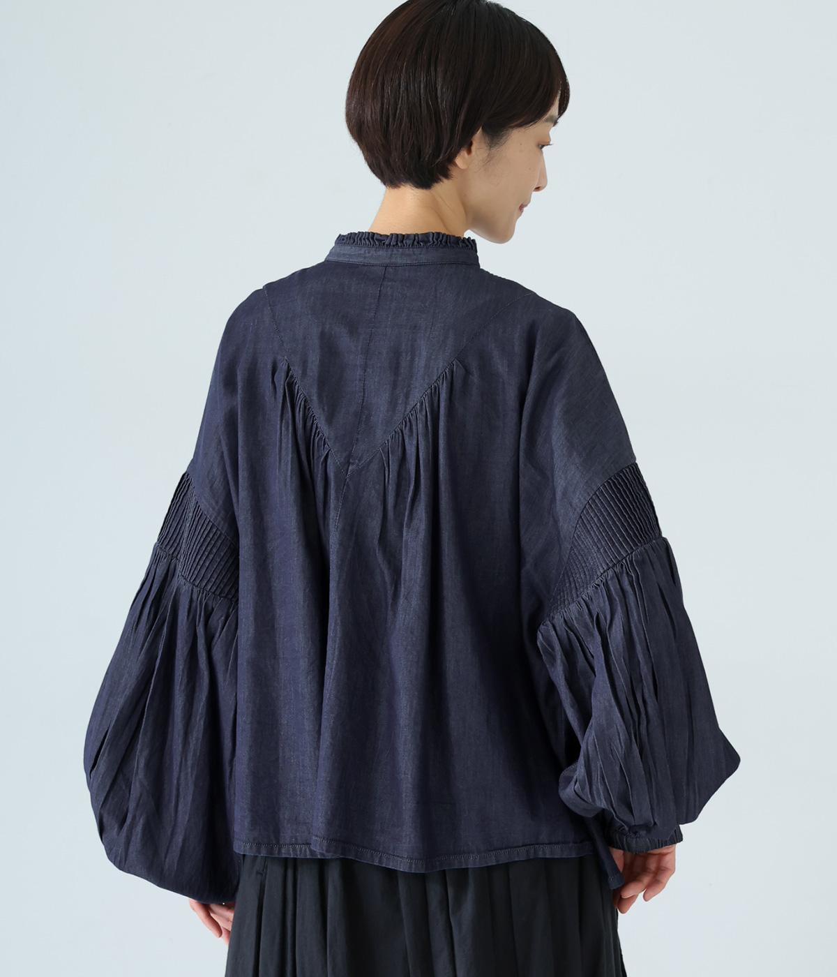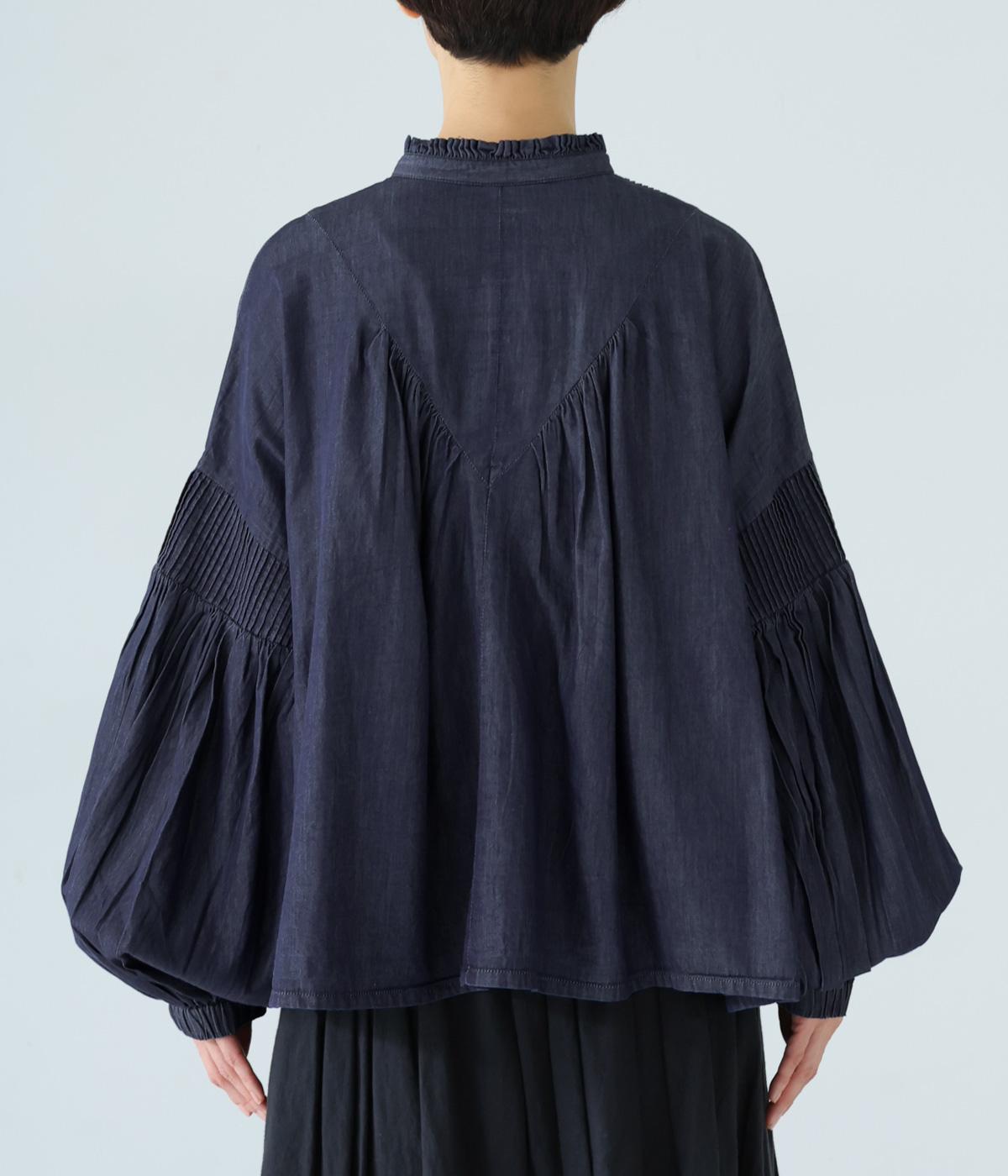 V字の前ヨークと袖ぐりに細かなピンタックをあしらったデニムブラウス。身頃にも袖にもギャザーをほどこしてボリューミーに仕上げました。きゅっと絞った袖口は着脱も簡単なゴム仕様。襟ぐりの小さなフリルも愛らしいポイントです。