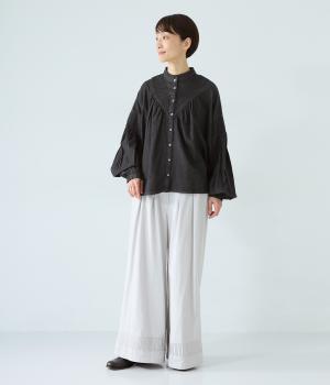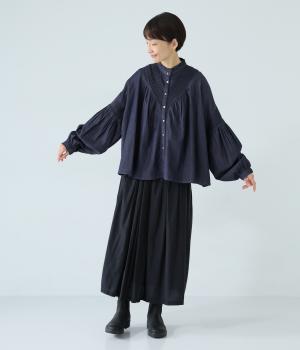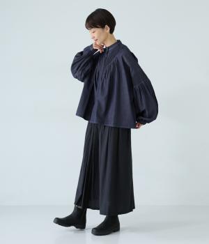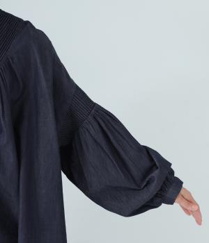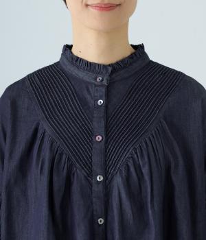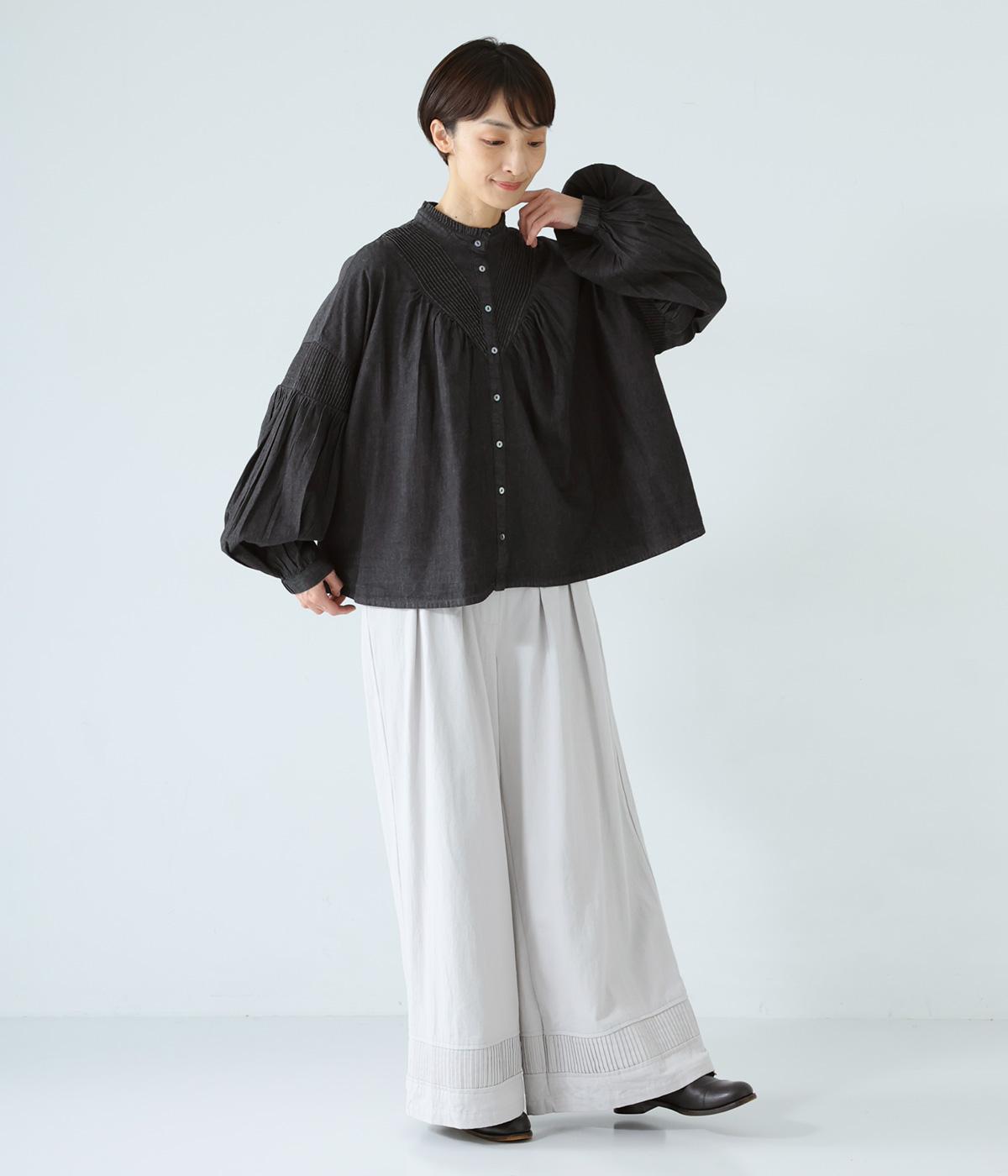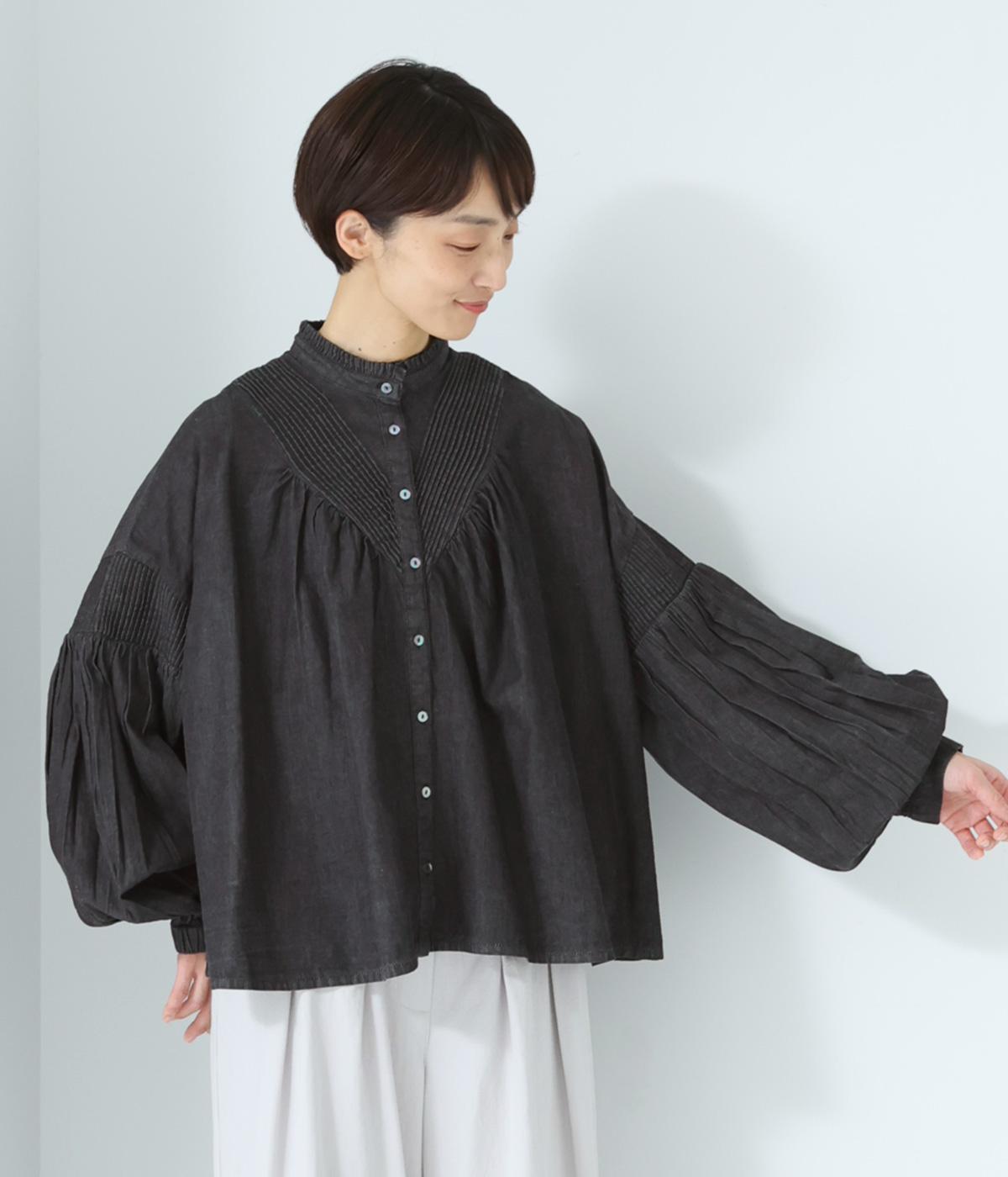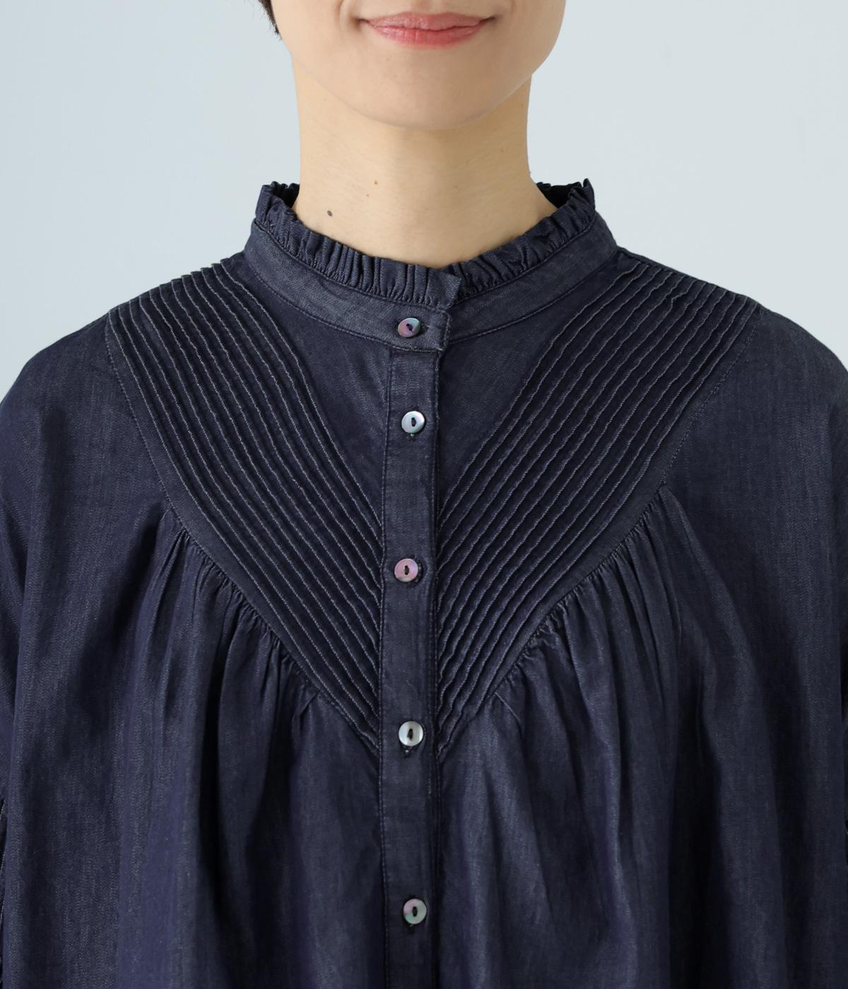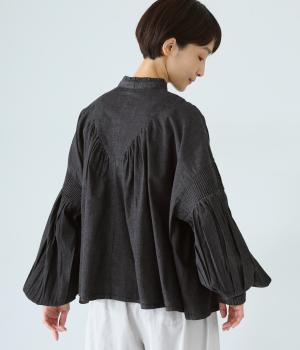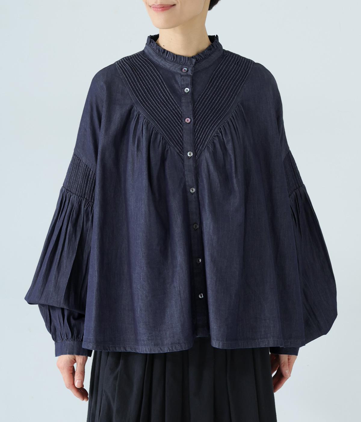 V字の前ヨークと袖ぐりに細かなピンタックをあしらったデニムブラウス。身頃にも袖にもギャザーをほどこしてボリューミーに仕上げました。きゅっと絞った袖口は着脱も簡単なゴム仕様。襟ぐりの小さなフリルも愛らしいポイントです。