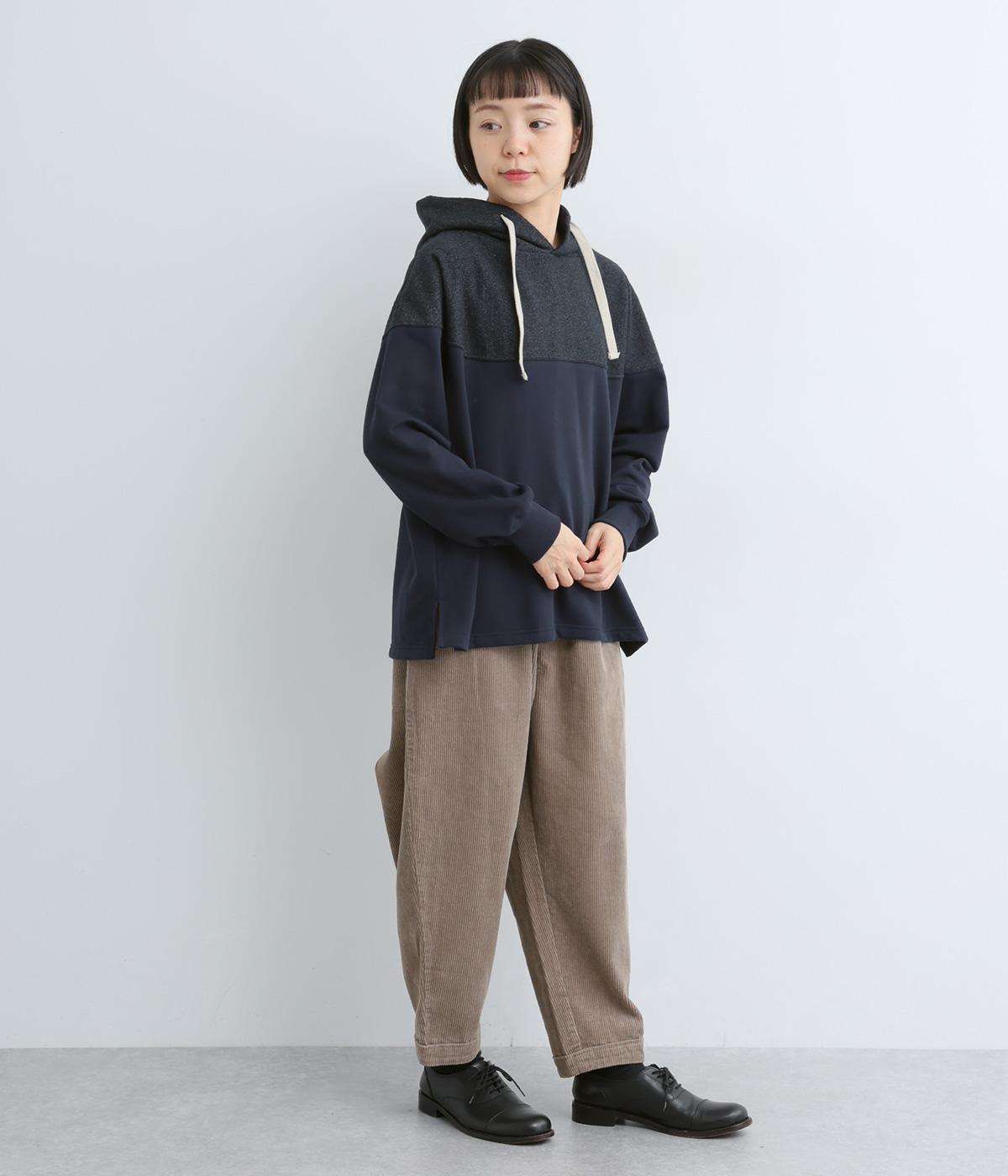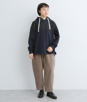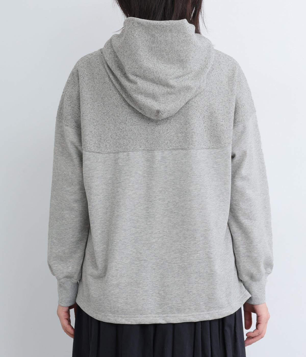 表情の異なる素材を組み合わせた、顔まわりのデザインが特徴的なフードつきパーカ。カジュアル感を出しながらもどこか大人顔で、デイリースタイルに取り入れやすい一枚。フードの太紐もいいアクセントになっています。