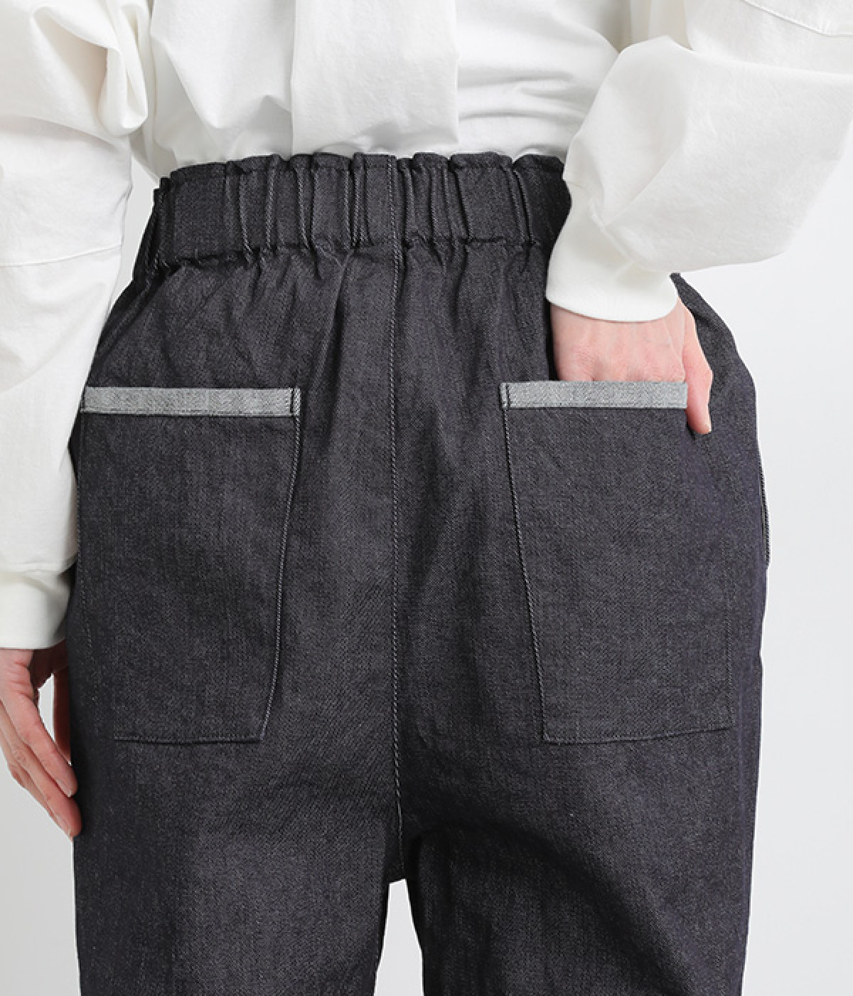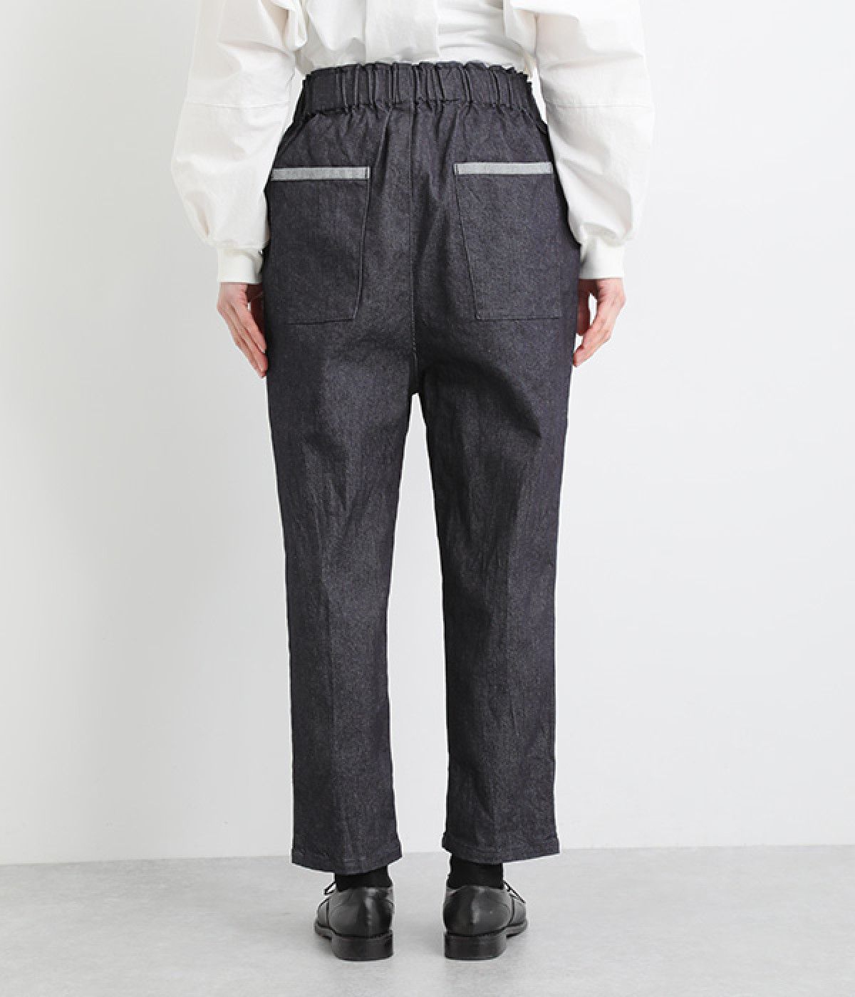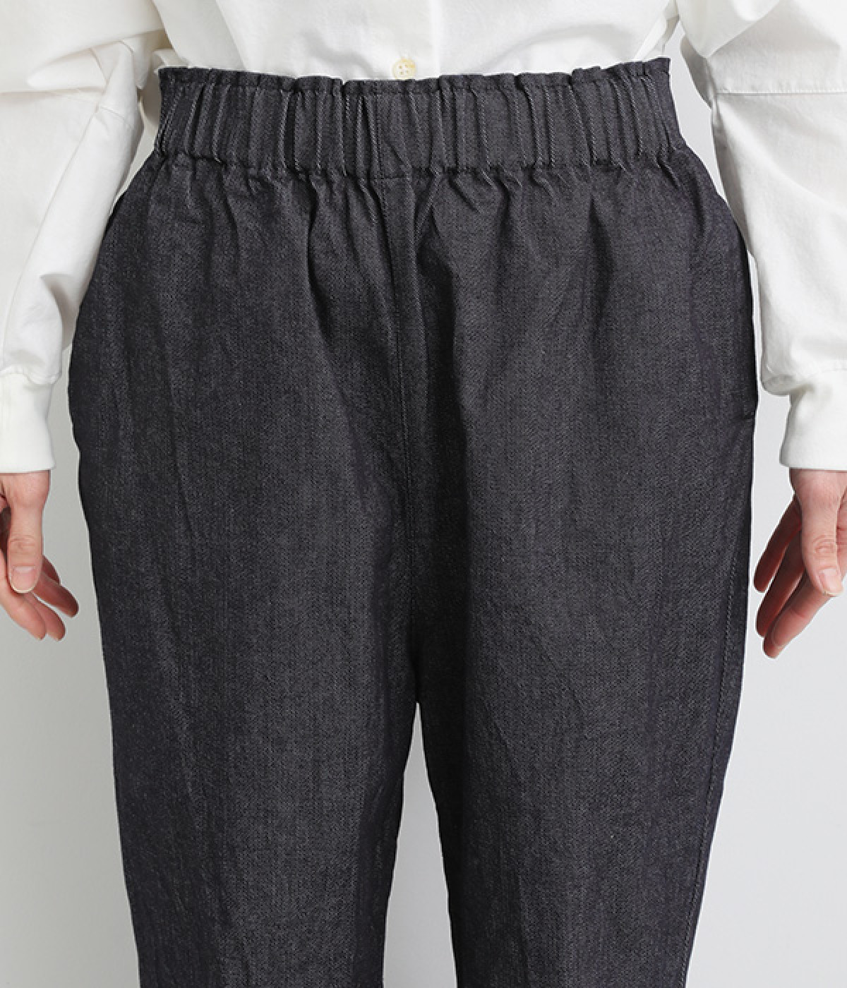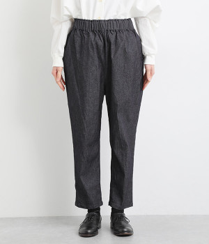 ストレッチの効いたデニム素材で仕立てられたパンツです。ウエストゴム仕様のイージータイプで、太腿まわりにややゆとりを持たせた丸みのあるシルエットが着心地抜群。デニム生地の特性として、繰り返し着用し洗濯するほどに自分なりの色合いに変化していくのも楽しみのひとつです。足元にかけてすっきりとさせたメリハリあるシルエットがお洒落なポイント。ラフにロールアップするのもおすすめです。