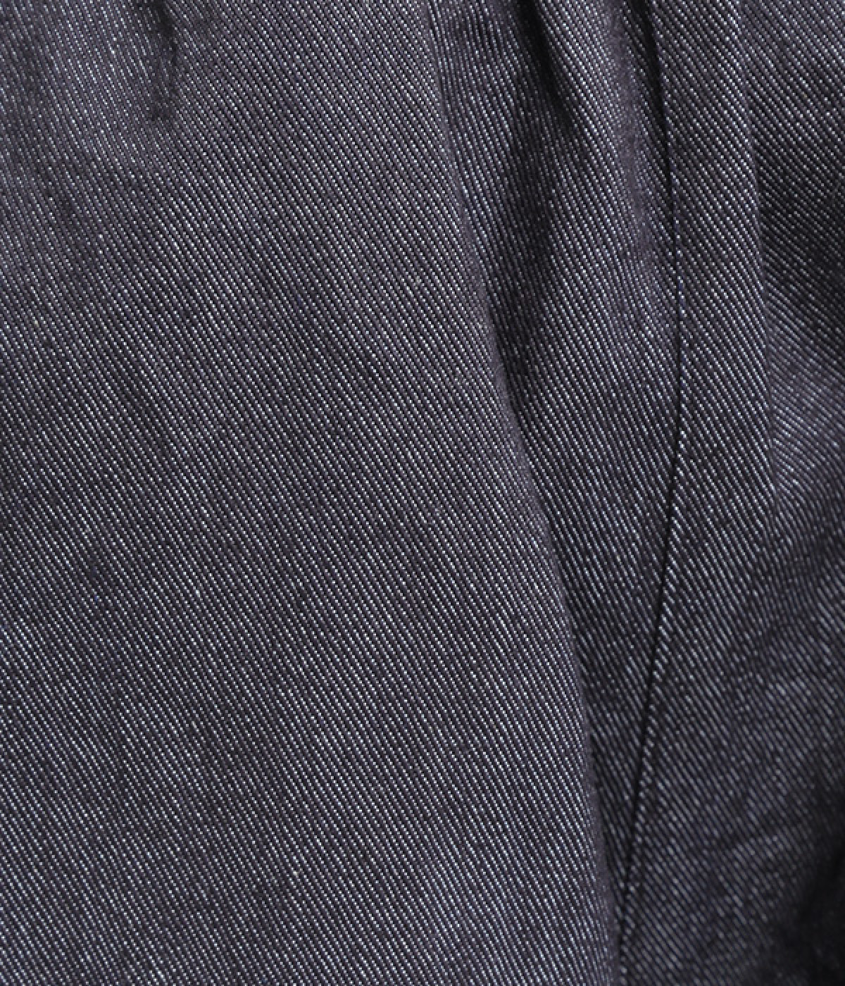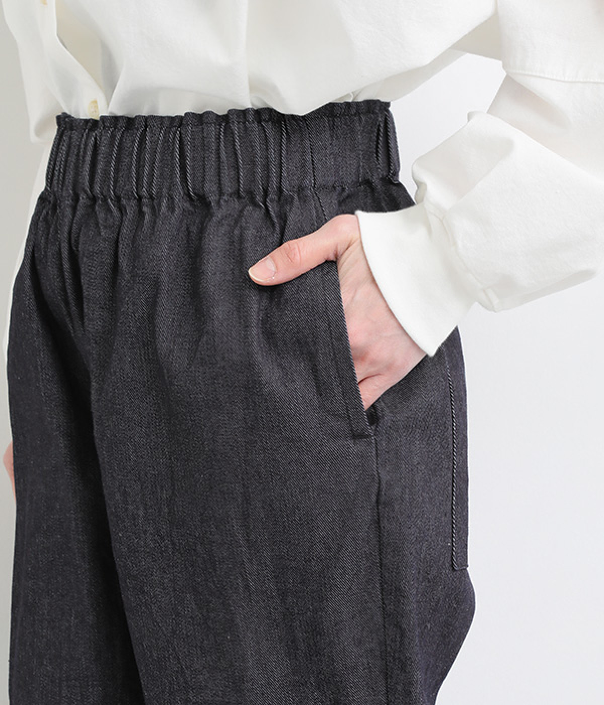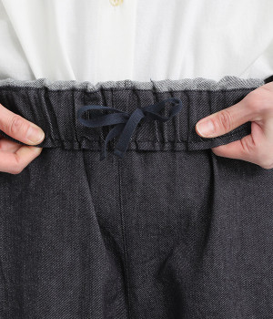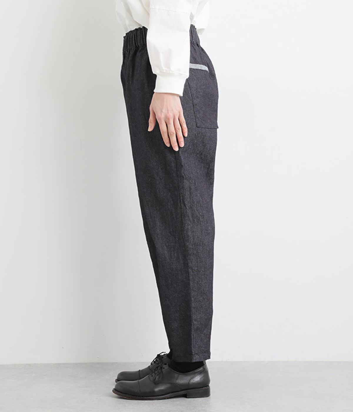 ストレッチの効いたデニム素材で仕立てられたパンツです。ウエストゴム仕様のイージータイプで、太腿まわりにややゆとりを持たせた丸みのあるシルエットが着心地抜群。デニム生地の特性として、繰り返し着用し洗濯するほどに自分なりの色合いに変化していくのも楽しみのひとつです。足元にかけてすっきりとさせたメリハリあるシルエットがお洒落なポイント。ラフにロールアップするのもおすすめです。