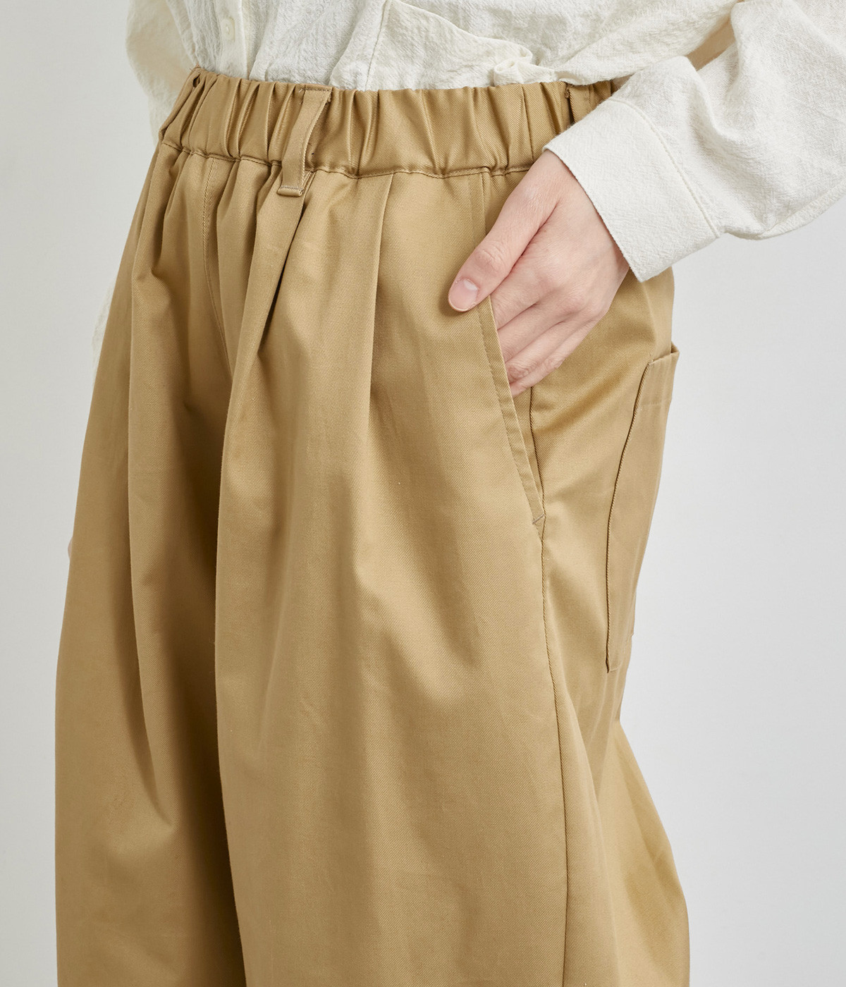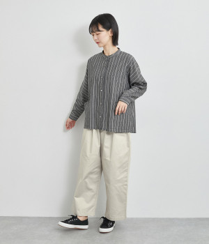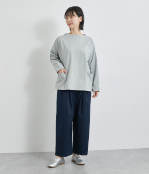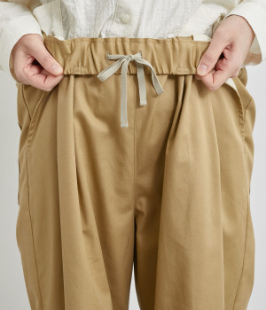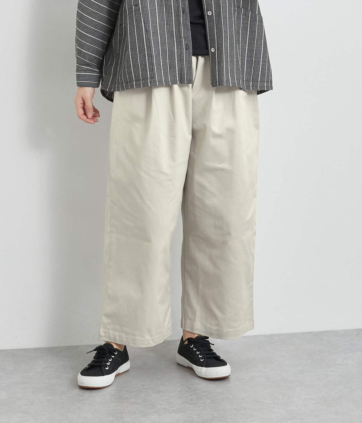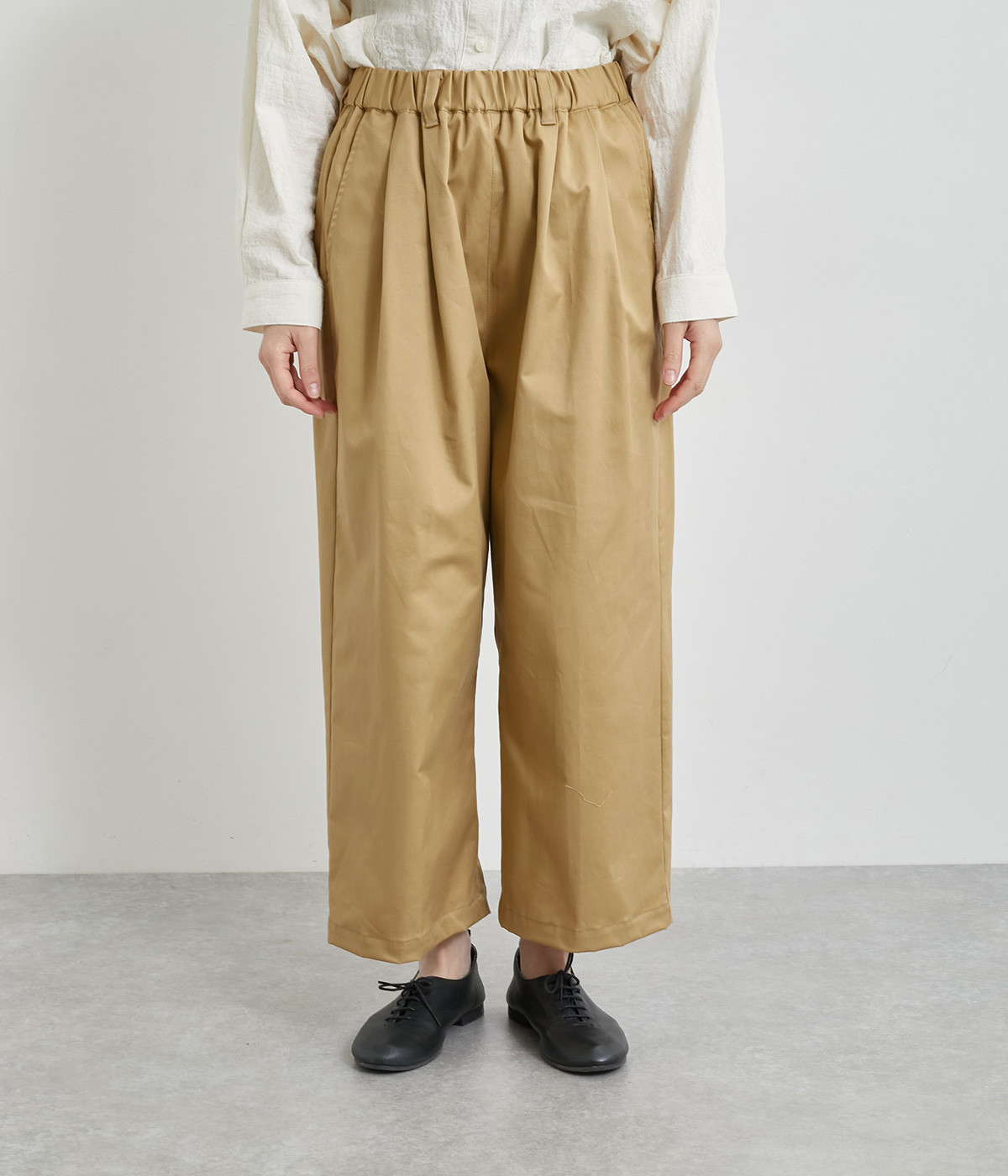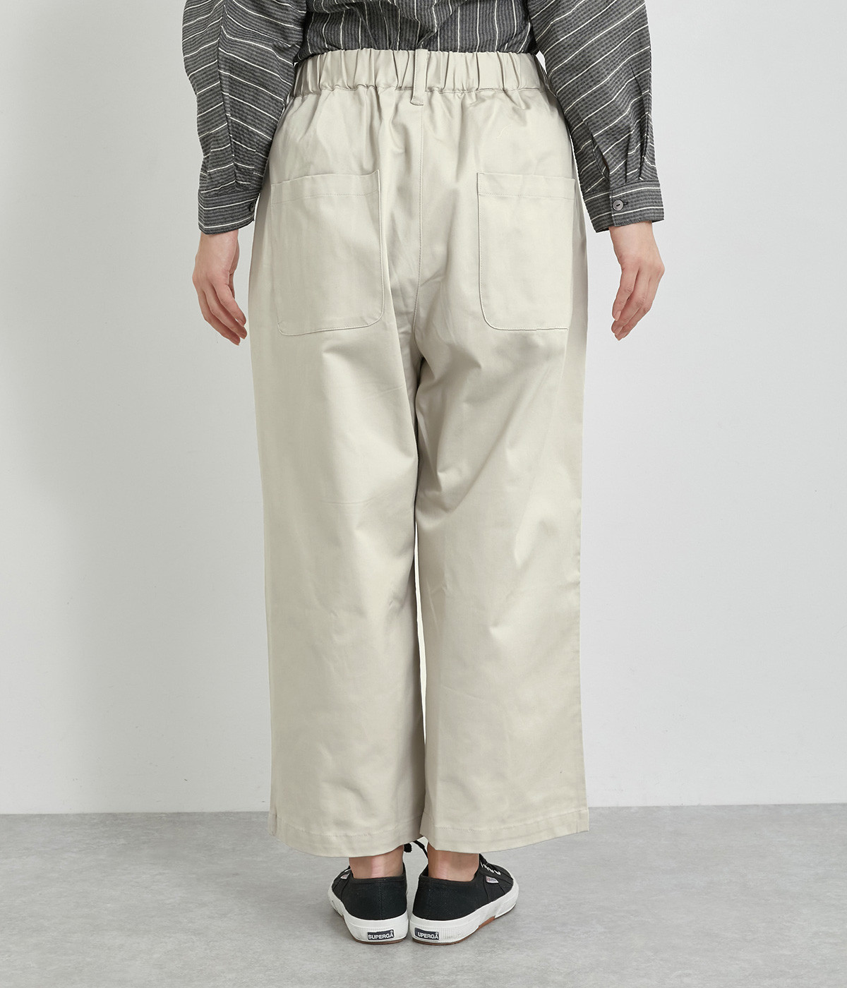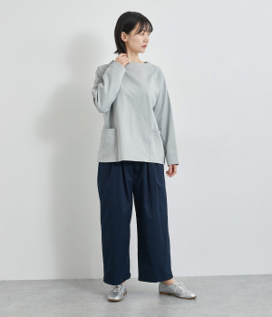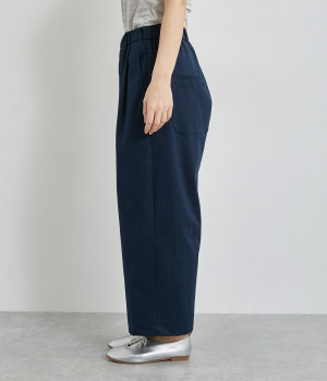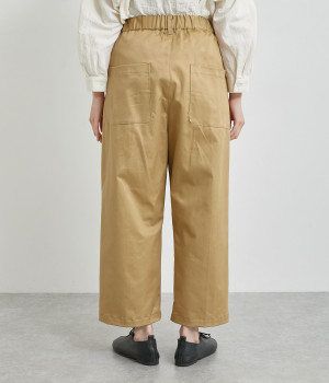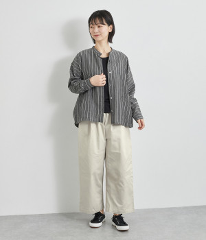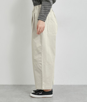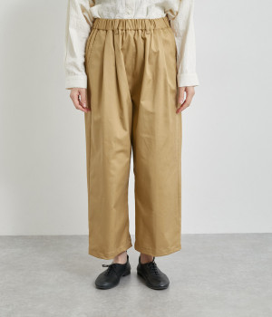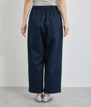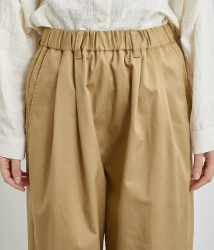 軽量ながら上品な表情で品よく着こなせる、きれいめなチノ生地のワイドパンツです。ストレッチ素材で動きやすいのもうれしいポイント。ウエストにはぐるりとゴムを通し、サイズ調整ができる内ひもを配しました。トップスの裾を出してカジュアルに着こなすのはもちろん、インできちんとしたコーディネートも楽しめます。