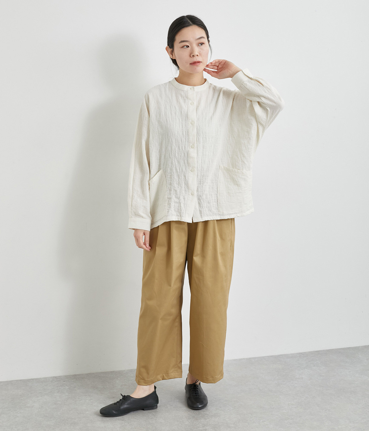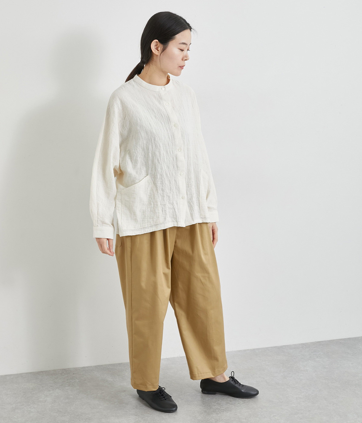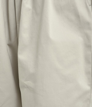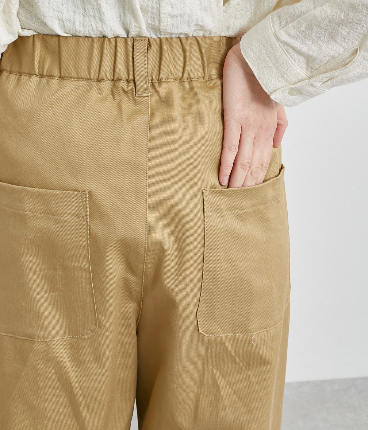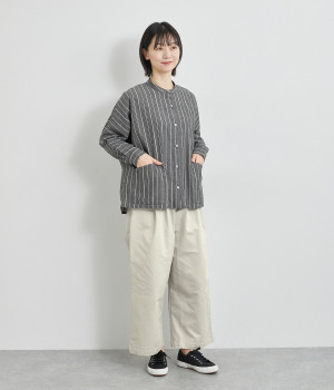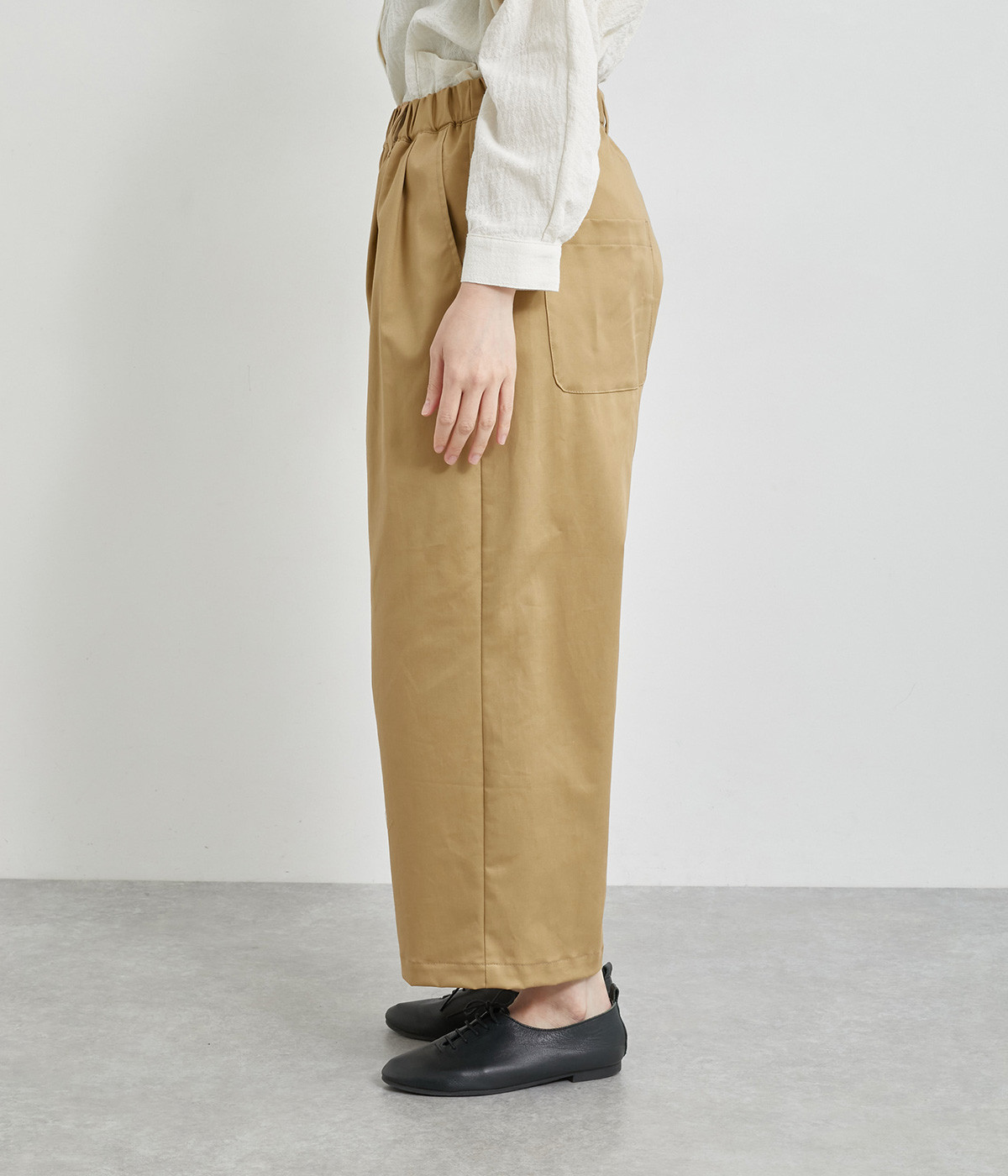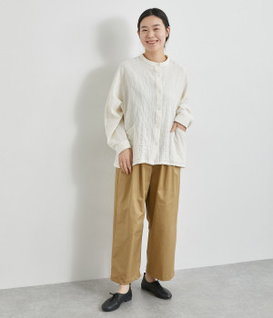 軽量ながら上品な表情で品よく着こなせる、きれいめなチノ生地のワイドパンツです。ストレッチ素材で動きやすいのもうれしいポイント。ウエストにはぐるりとゴムを通し、サイズ調整ができる内ひもを配しました。トップスの裾を出してカジュアルに着こなすのはもちろん、インできちんとしたコーディネートも楽しめます。