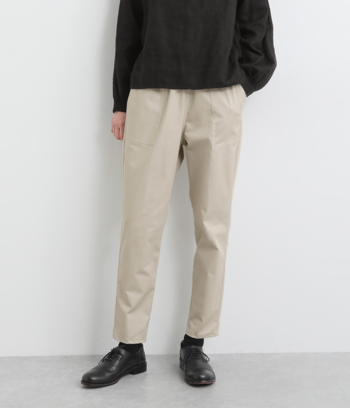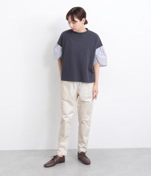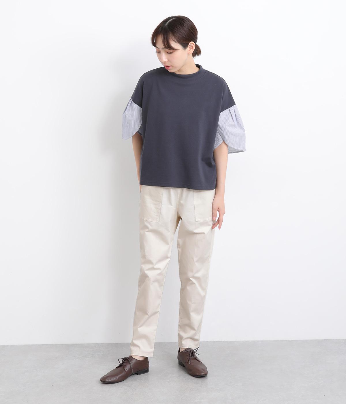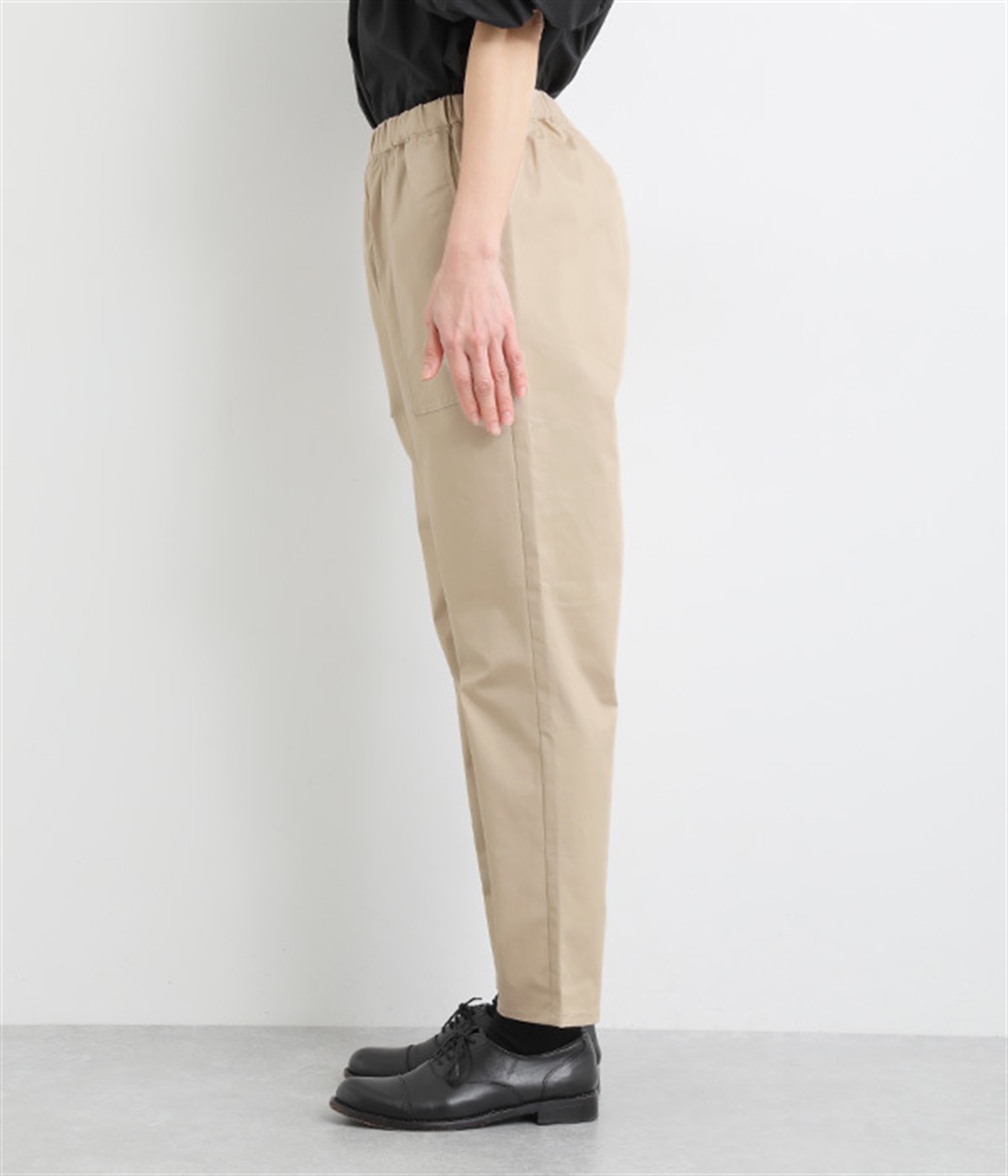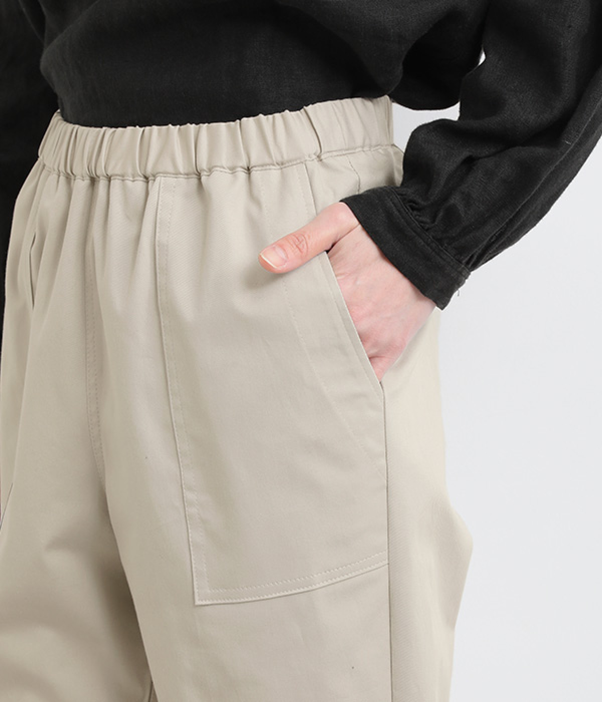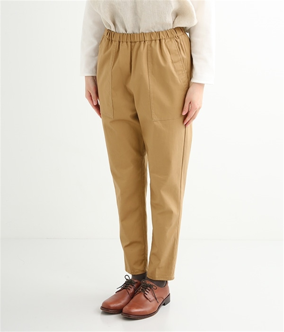 ウエストゴム仕様のはき心地にこだわったイージーパンツ。太ももまわりにややゆとりを持たせた丸みのあるシルエットに、ワーク調のアウトポケットが特徴的。足元にかけてすっきりさせたメリハリあるシルエットで、ラフにロールアップするのもおすすめです。