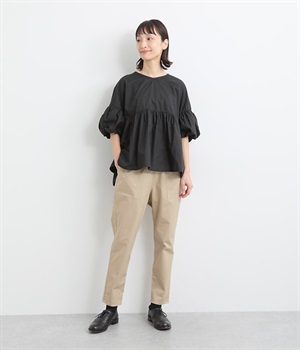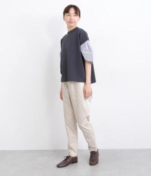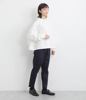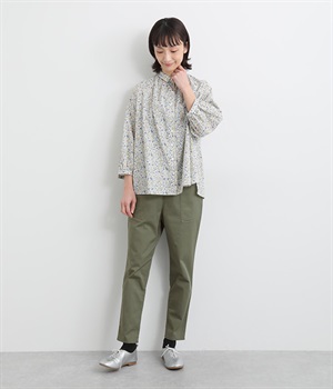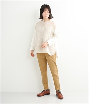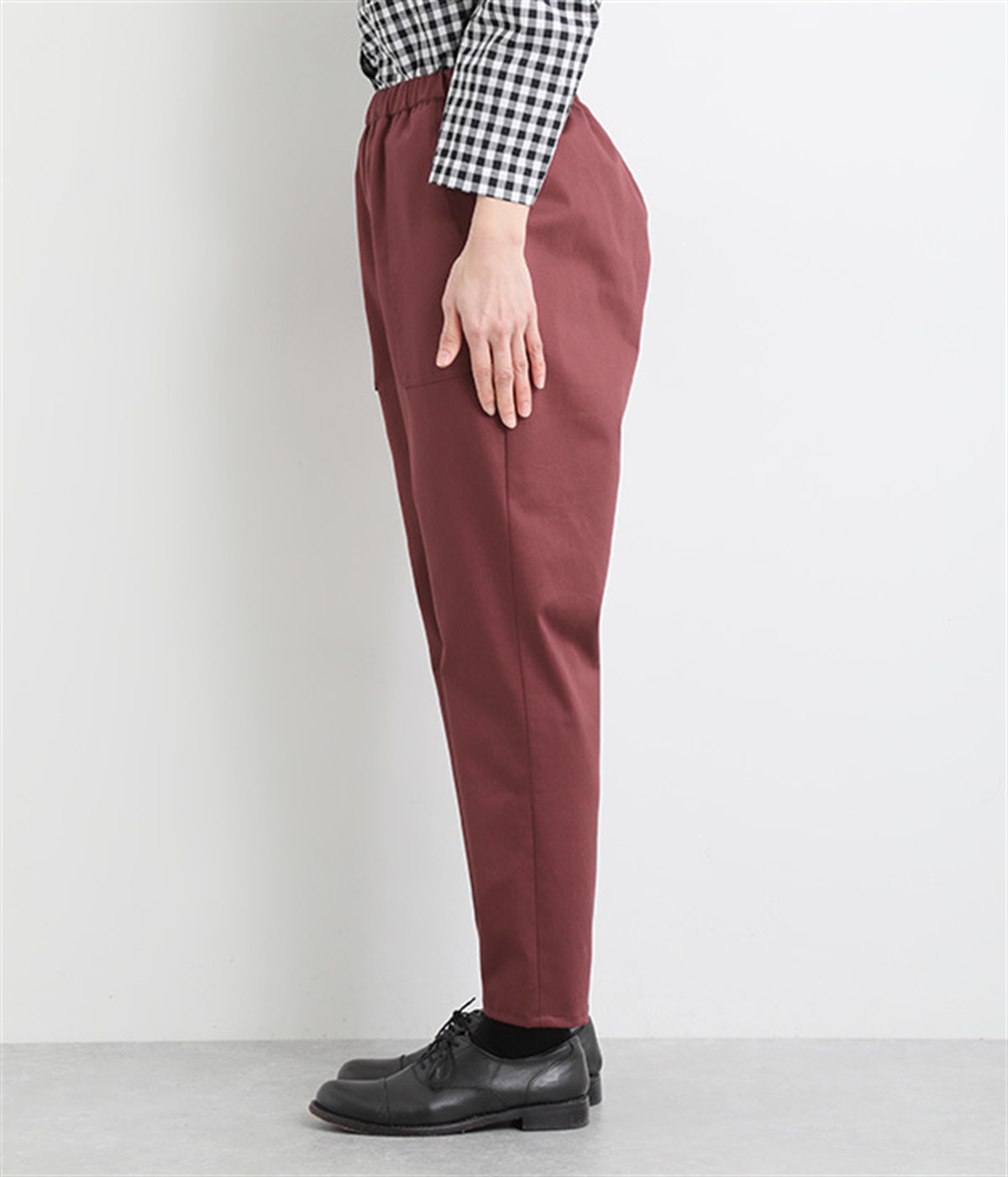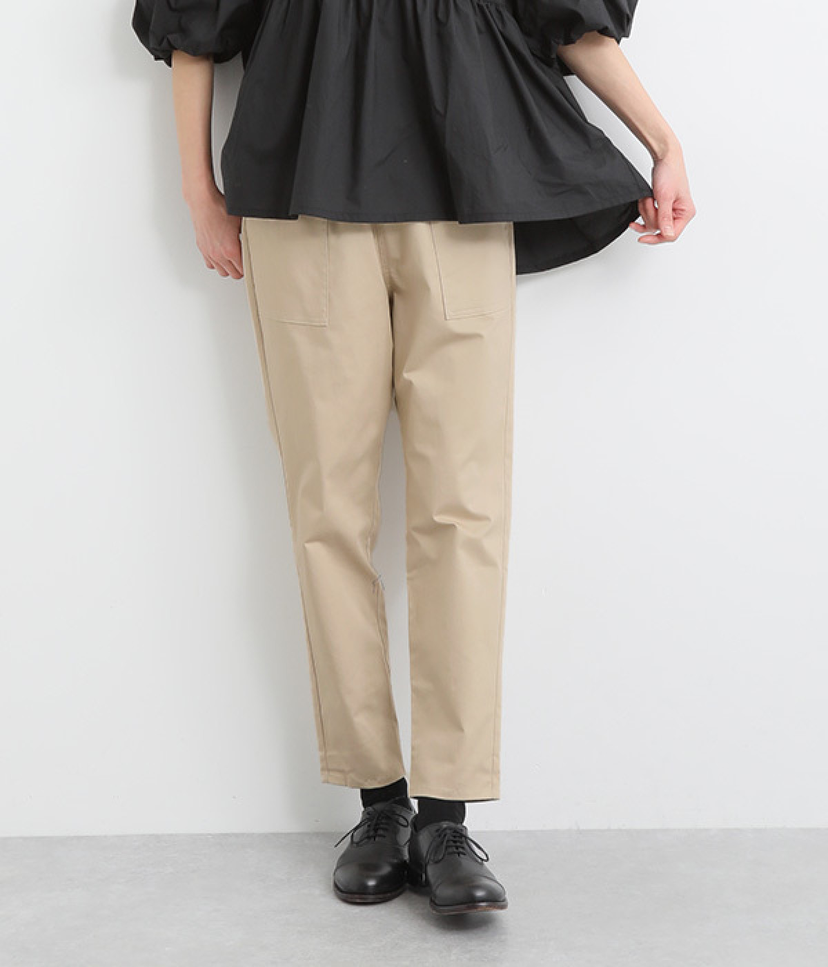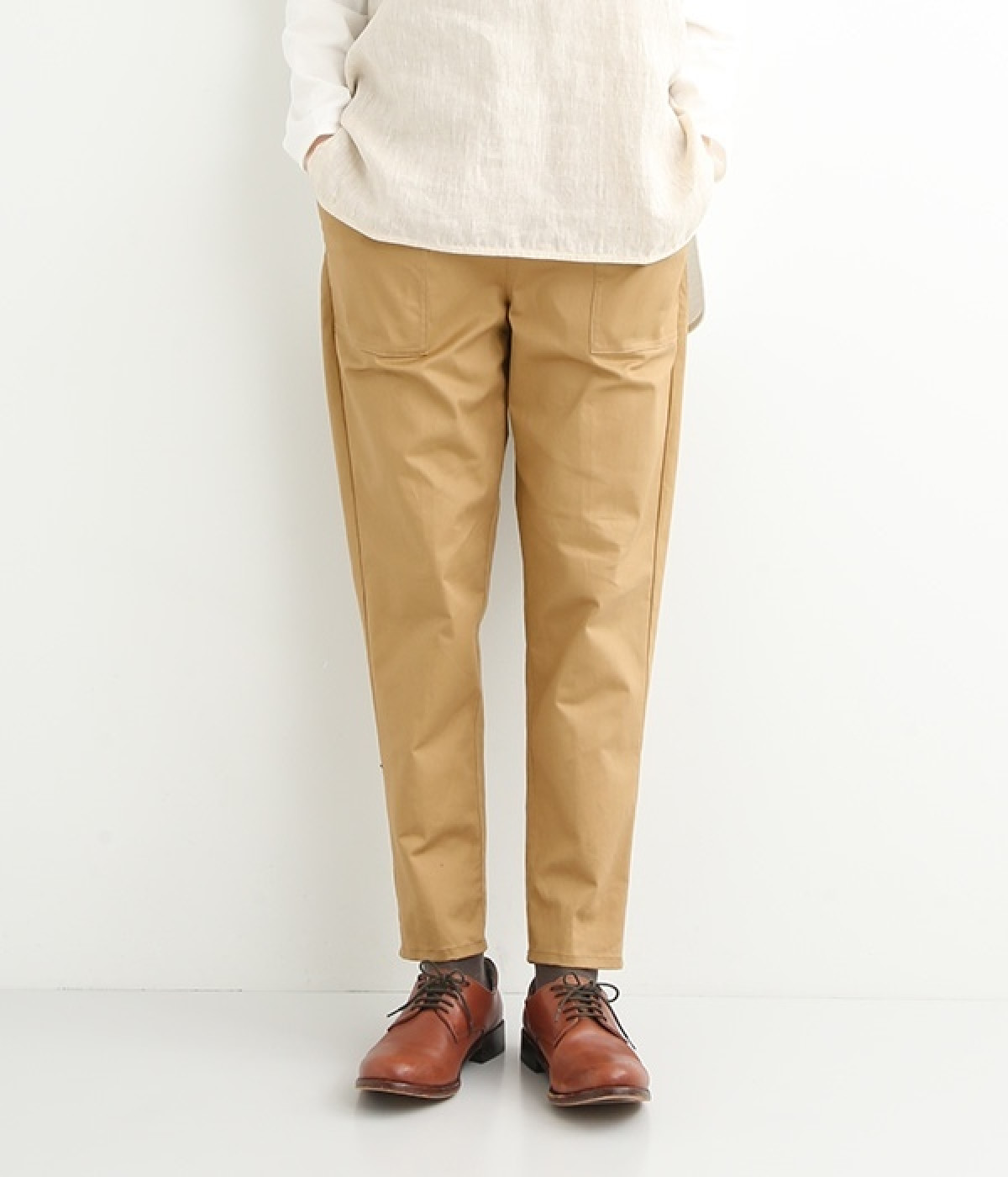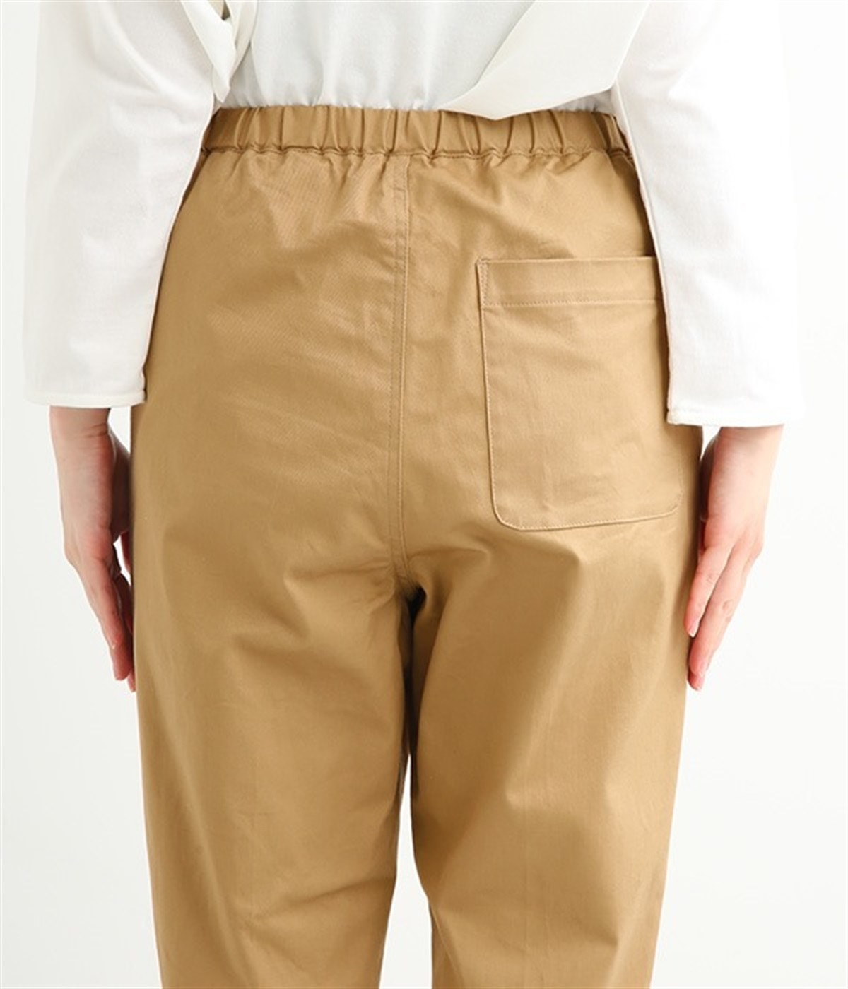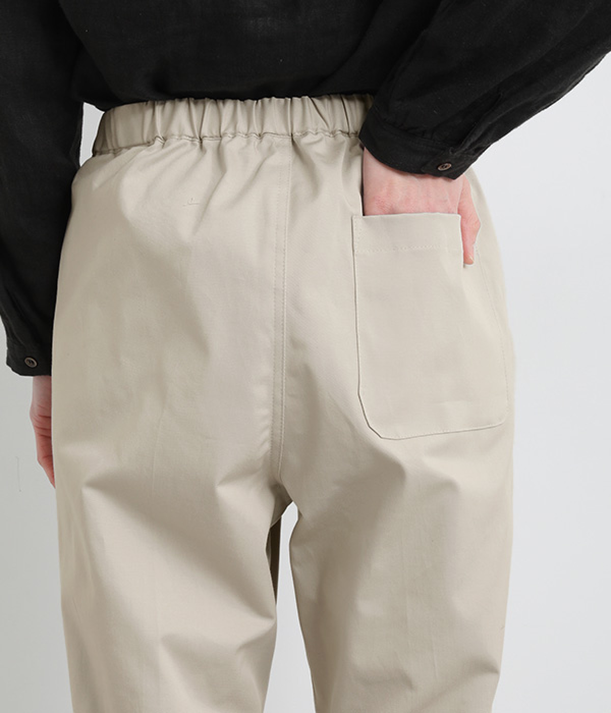 ウエストゴム仕様のはき心地にこだわったイージーパンツ。太ももまわりにややゆとりを持たせた丸みのあるシルエットに、ワーク調のアウトポケットが特徴的。足元にかけてすっきりさせたメリハリあるシルエットで、ラフにロールアップするのもおすすめです。