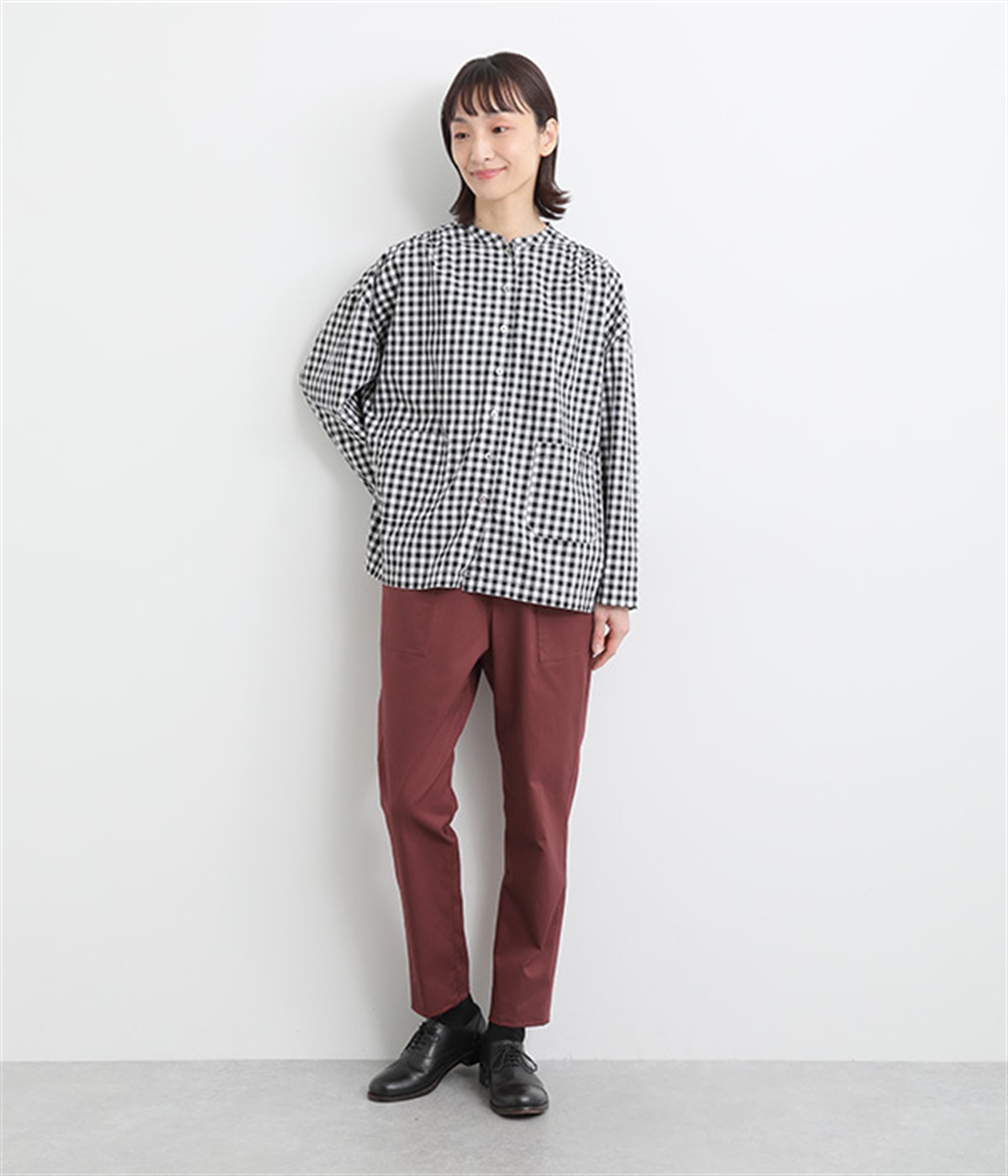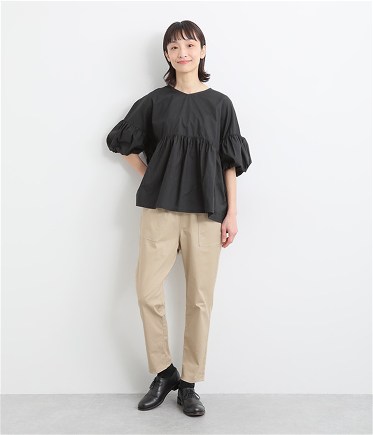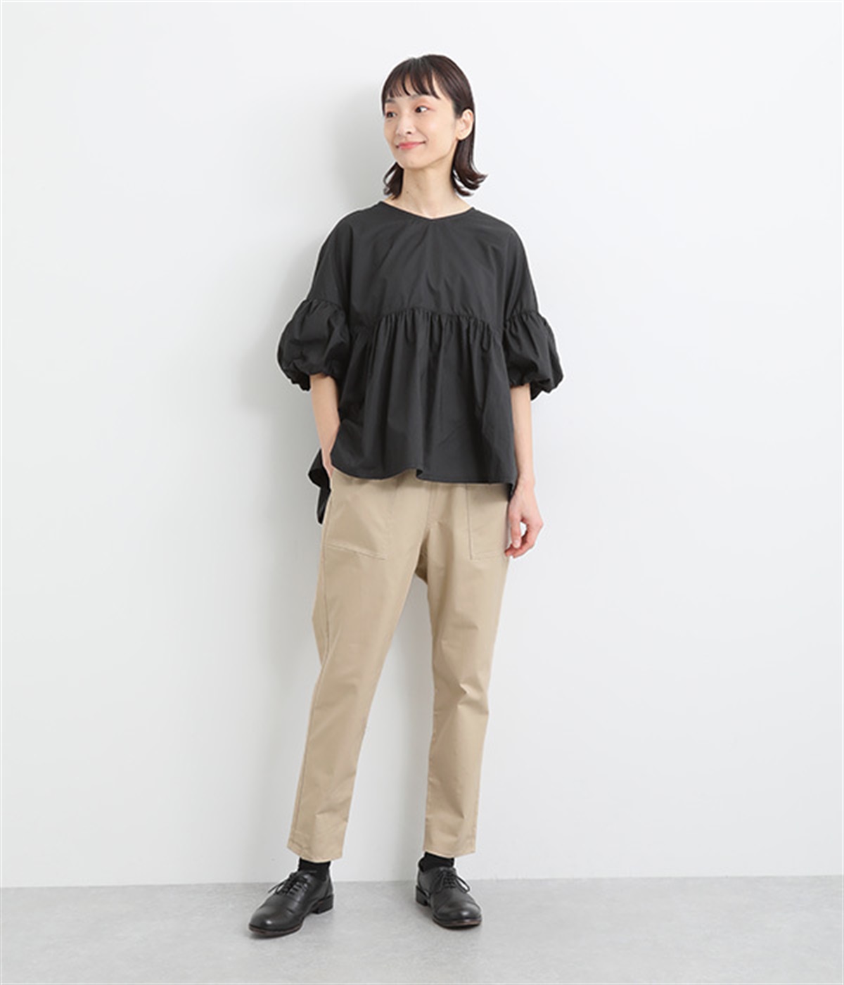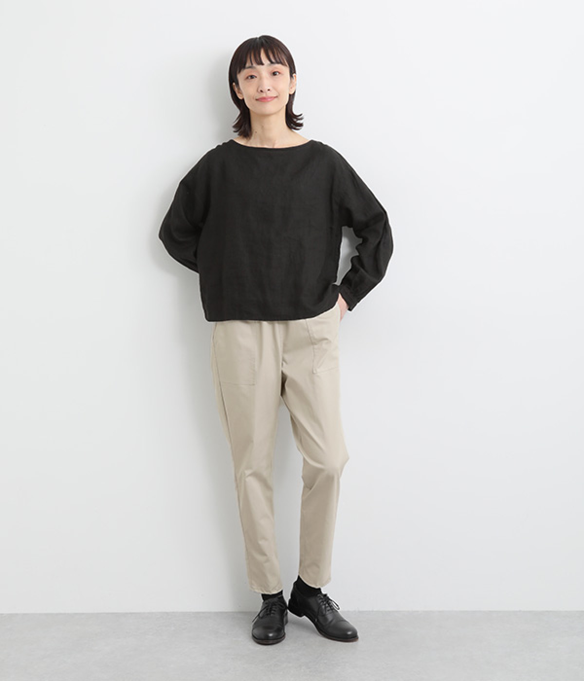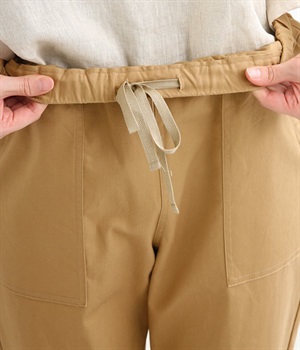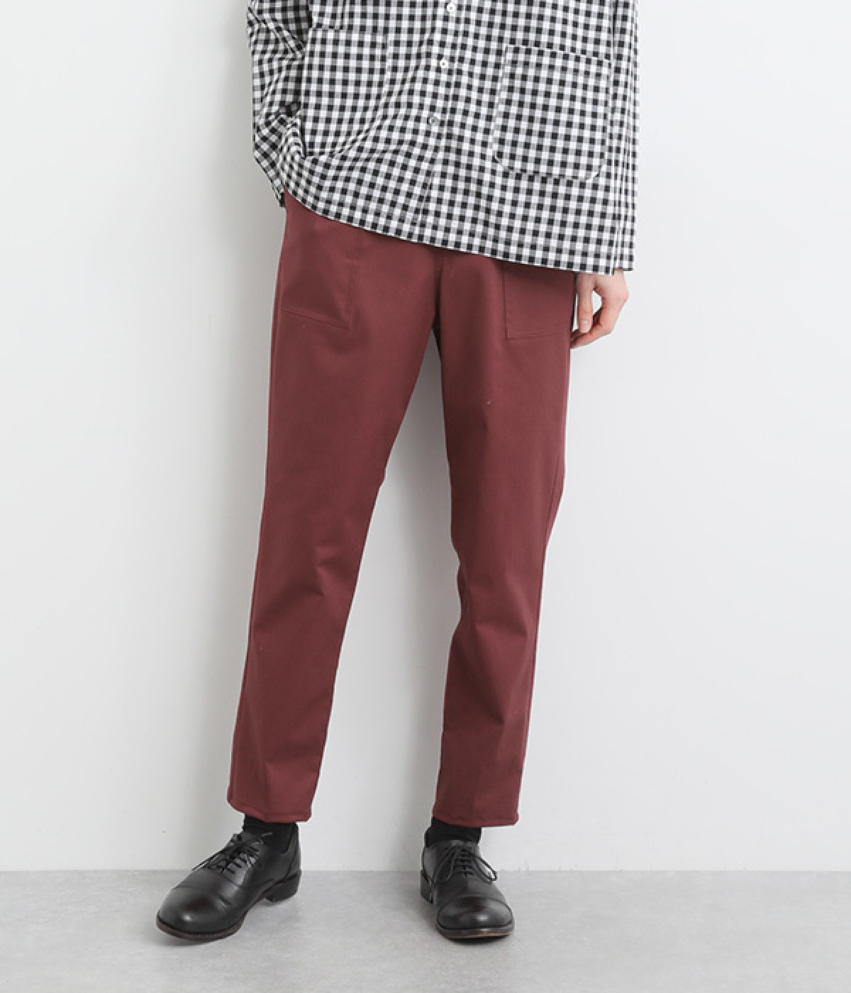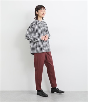 ウエストゴム仕様のはき心地にこだわったイージーパンツ。太ももまわりにややゆとりを持たせた丸みのあるシルエットに、ワーク調のアウトポケットが特徴的。足元にかけてすっきりさせたメリハリあるシルエットで、ラフにロールアップするのもおすすめです。